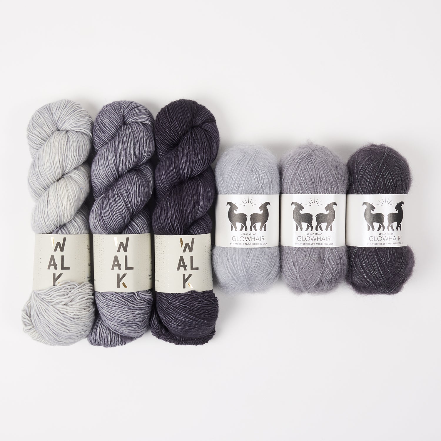 This gorgeous kit from WALK Collection features three skeins of fingering weight yarn paired with three matching balls of West Wool's very own Glowhair.