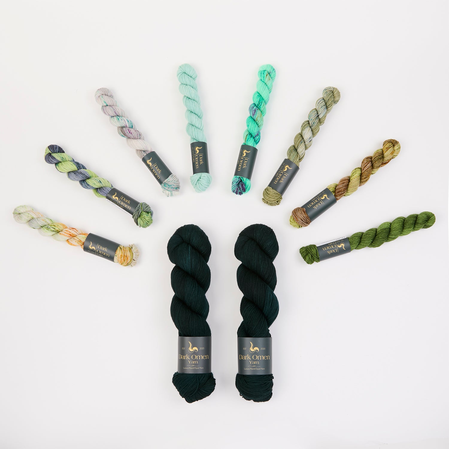 Paint yourself a colourful new shawl with this gorgeous Dark Omen Yarn kit. This kit contains ten skeins of fingering weight yarn in nine beautiful solid colours, perfect for the Paining Bricks Shawl from Westknits!