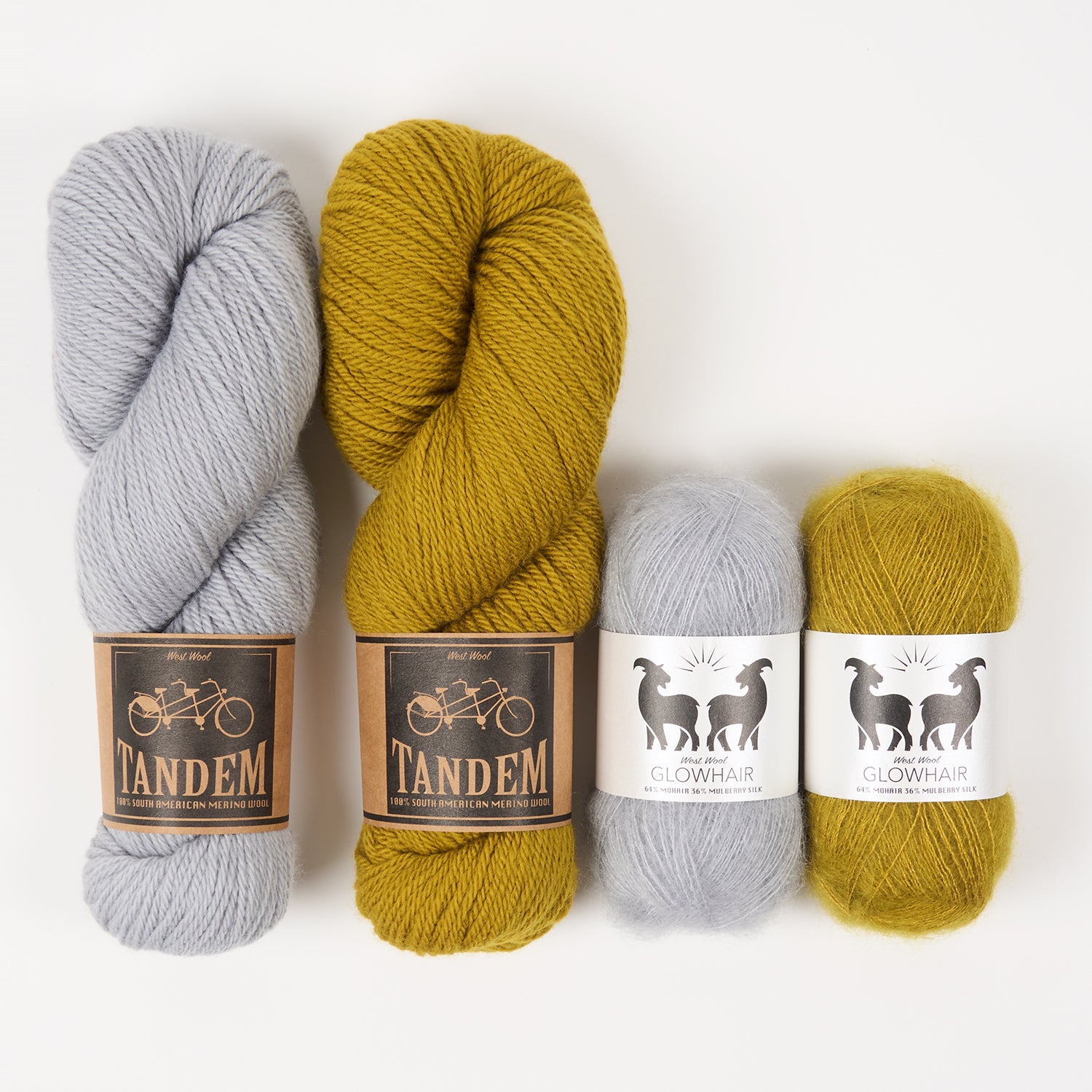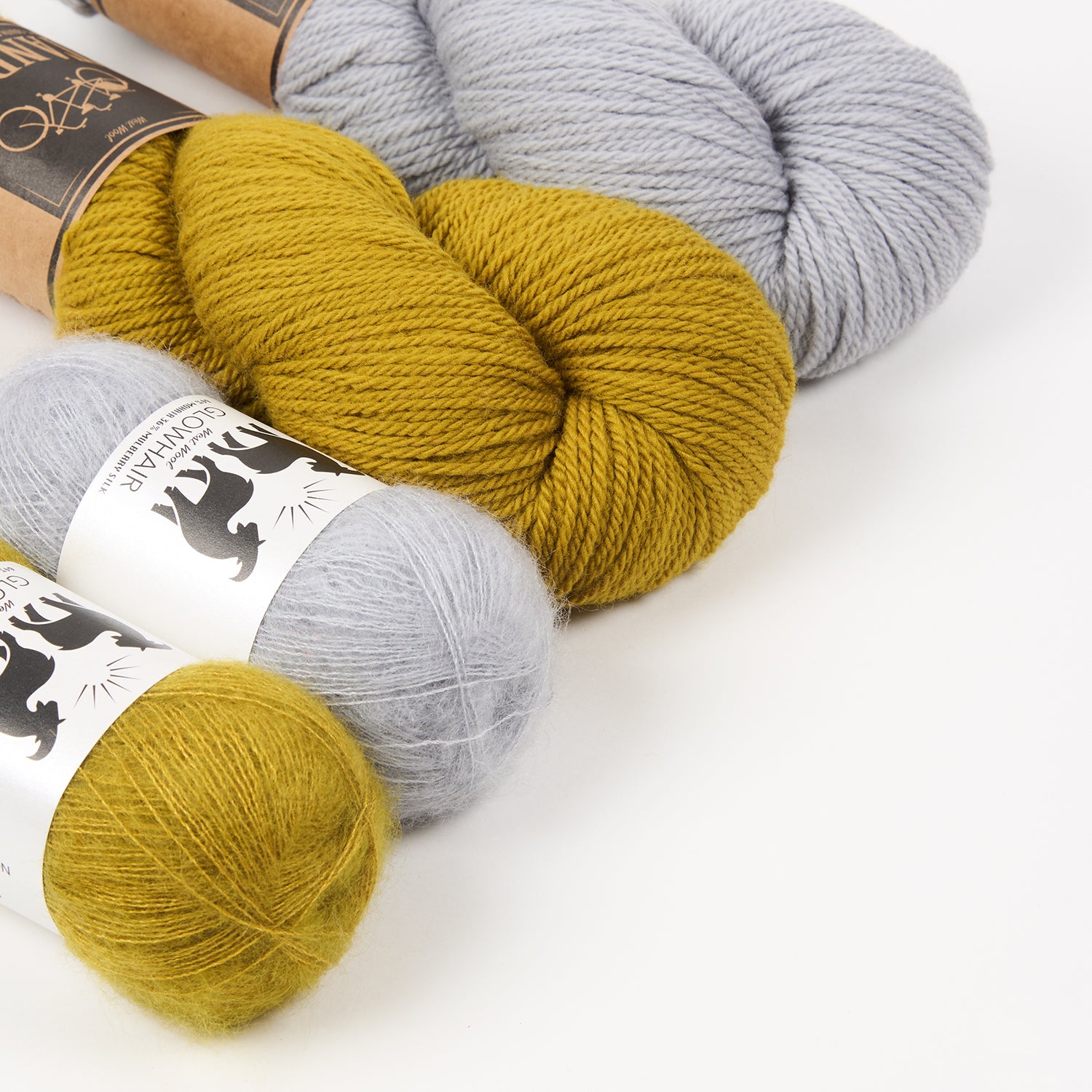 This gorgeous kit from West Wool contains three skeins of DK weight yarn and three balls of lace weight mohair in two contrasting colours. If you need inspiration, it can be used to knit the stunning Diamond Halo Cowl from Westknits.