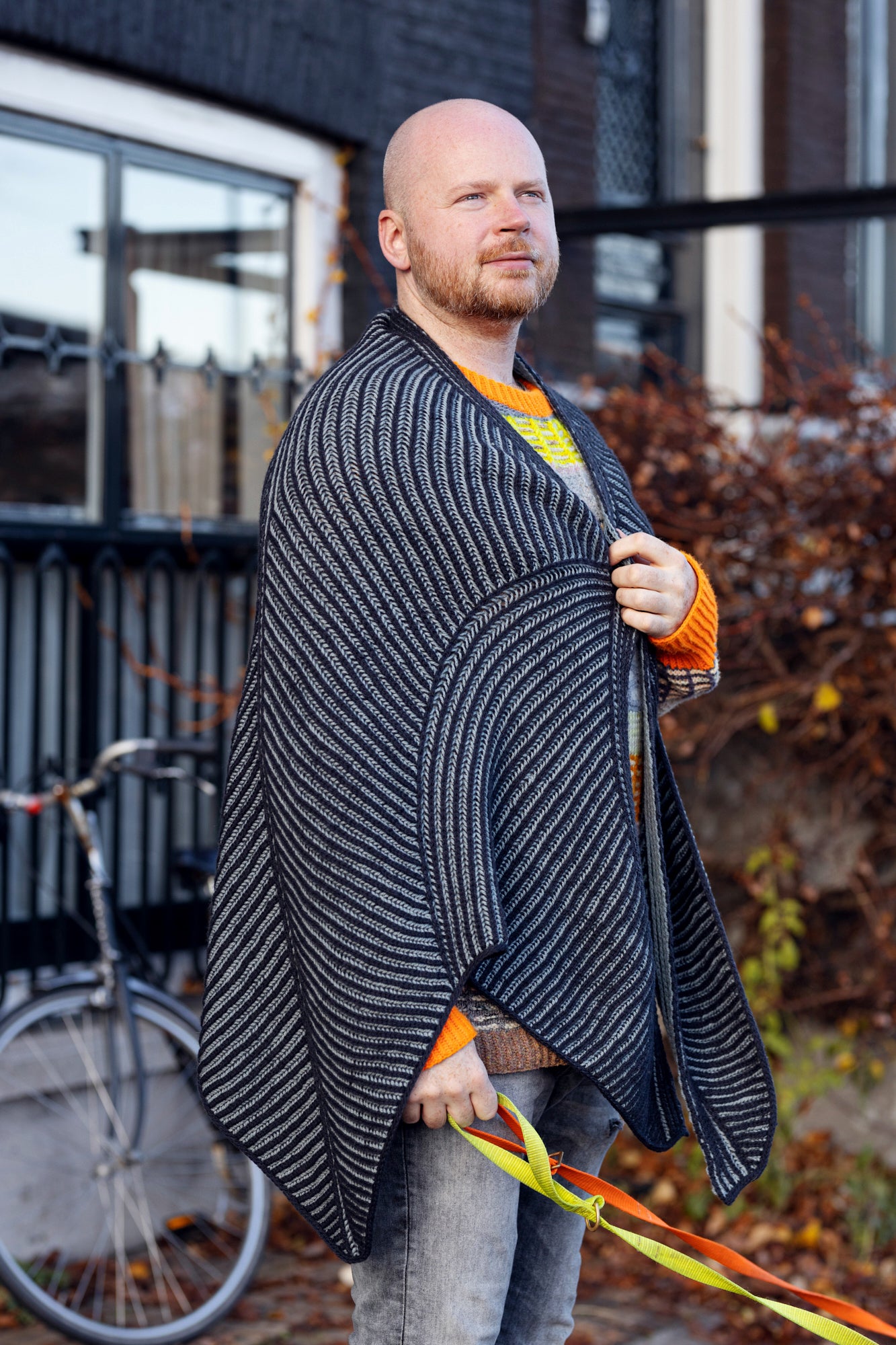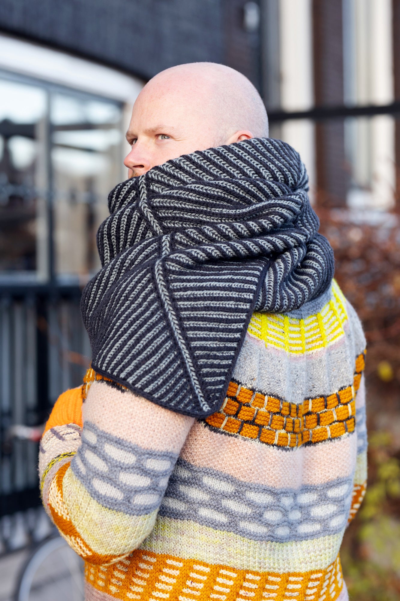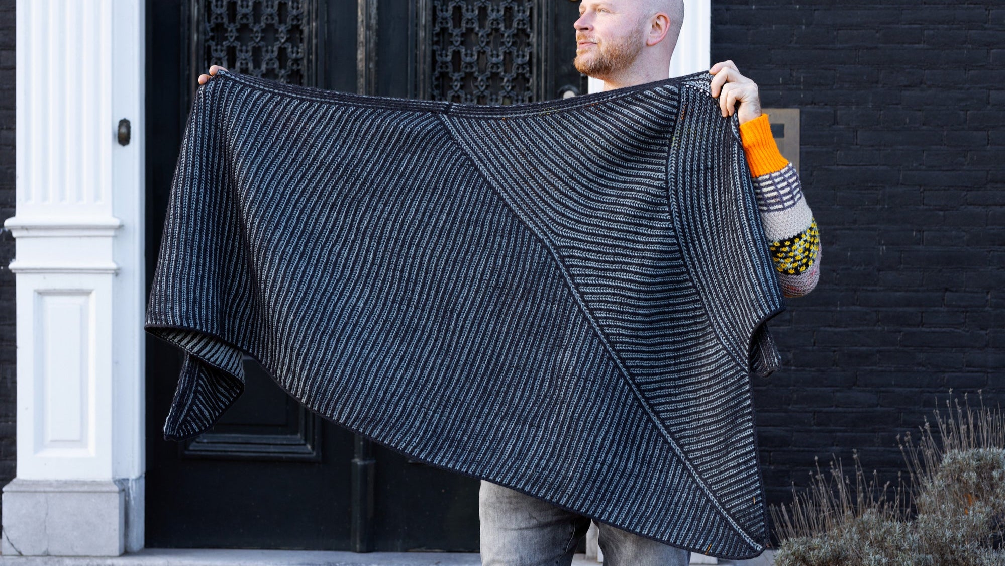 This top-down shawl is knit in two-colour brioche stitch. The asymmetrical shape features half of a chevron that slants the ribbing to one side. Choose two colors or decorate the fabric with more colourful stripes.