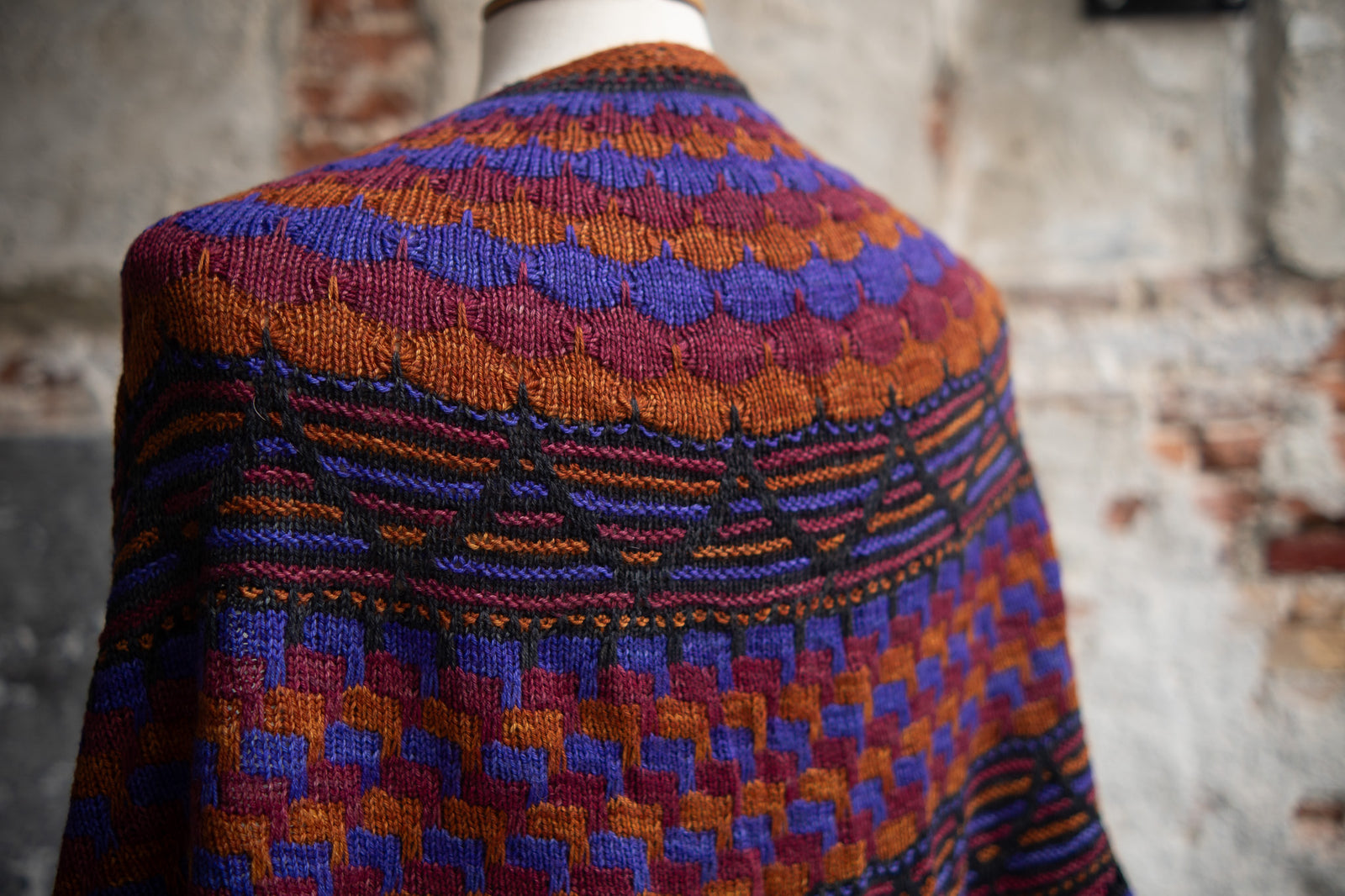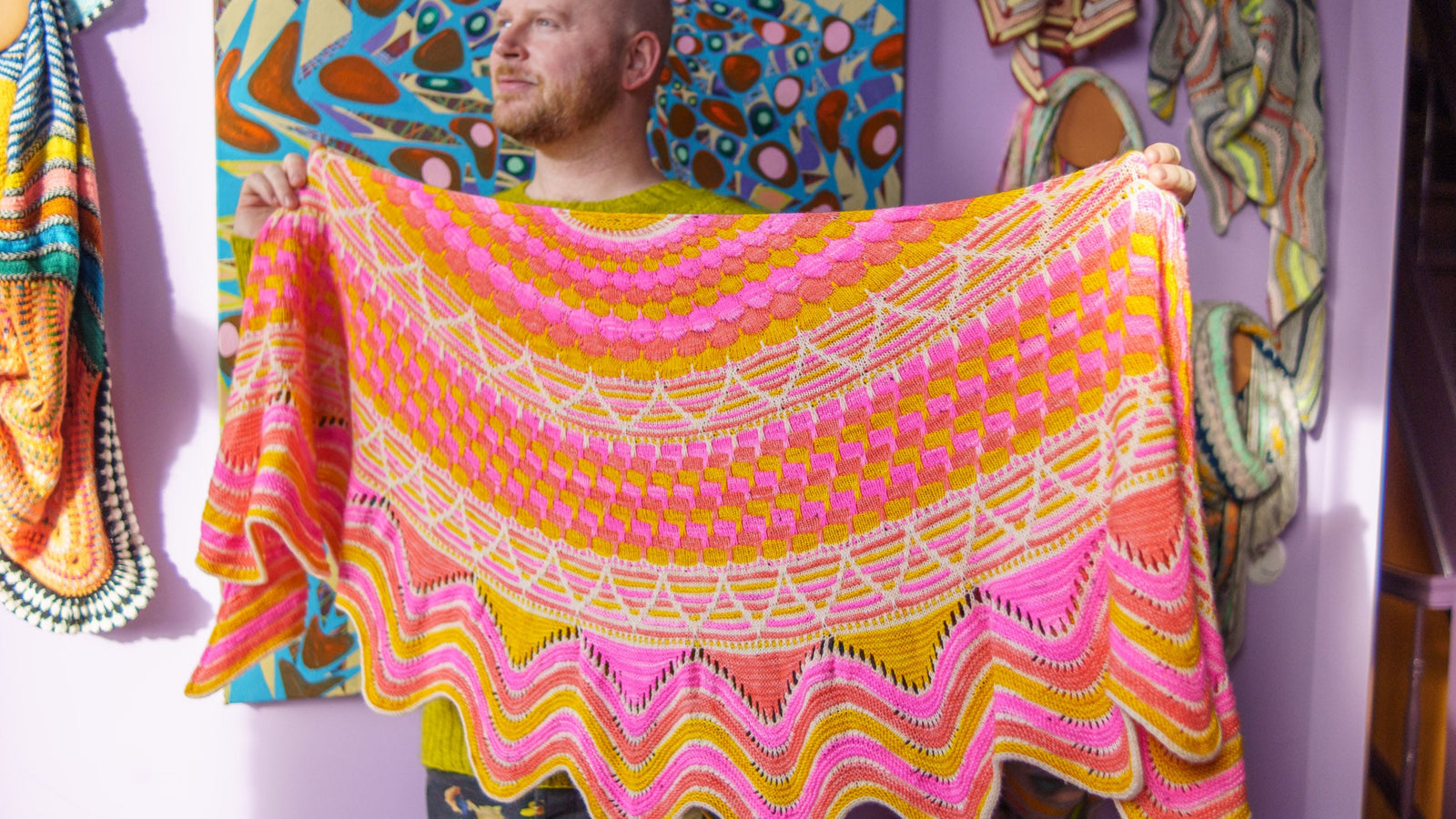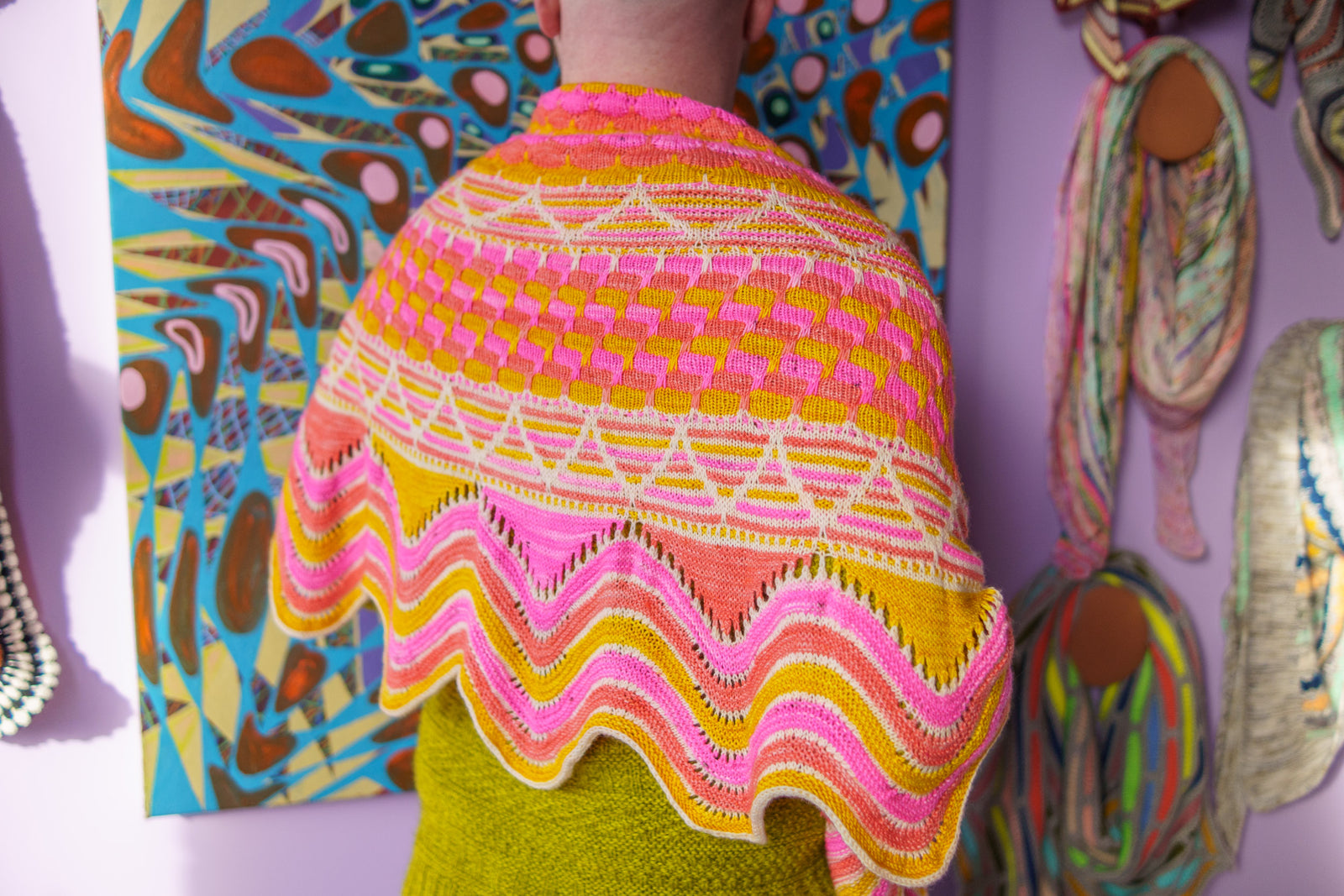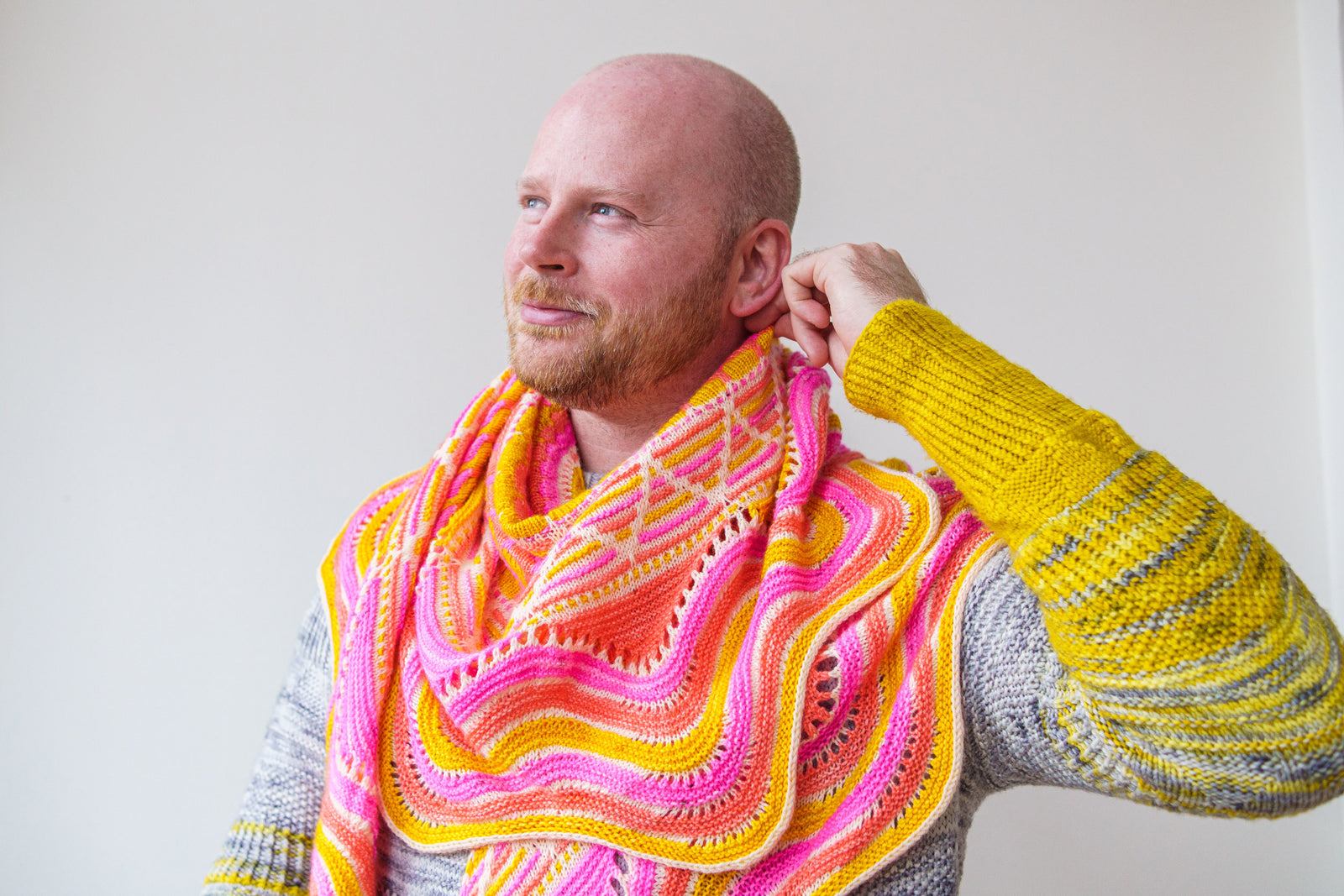The first pattern in 2023's Yarn Along is a colourful collage of stripes and slip stitches. The shawl shawl begins with blooming bubble stitches that flow into a diagonal petal slip stitch pattern and features a border knit with colourful short-row crescents framed with wavy airy eyelets. Just choose your favourite four colour fingering weight kit and knit a shawl that will add a floral flourish to any outfit.