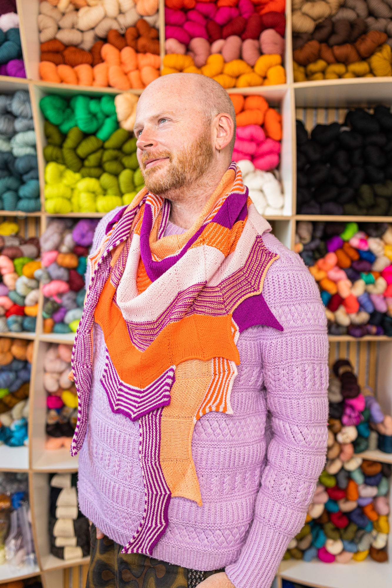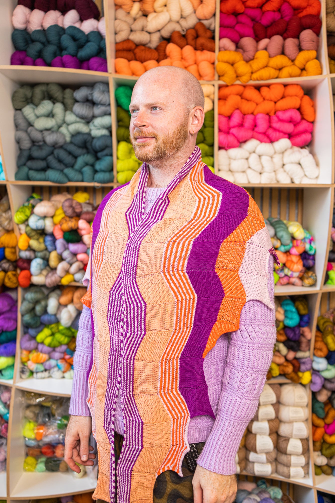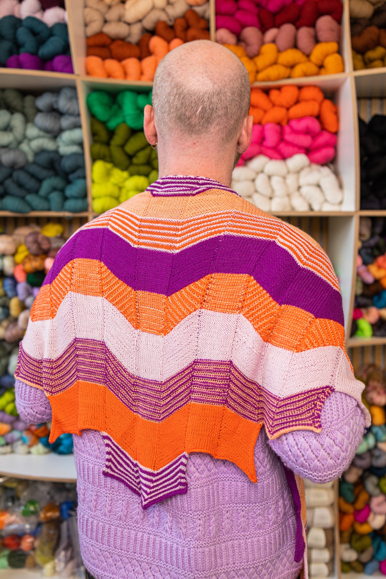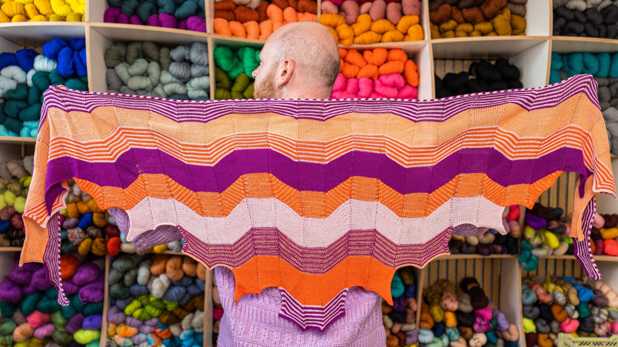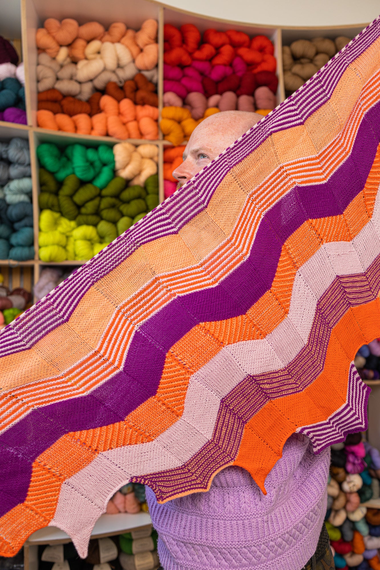 Originally the super secretive pattern for the 2016 Westknits Mystery Knit Along, this amazing angular shawl uses four colours of fingering weight yarn. Textured bands knit in garter stitch, two-colour brioche, stockinette, and the simple knit-n-slide technique create beautiful textured stripes across the wings of this one of a kind shawl.