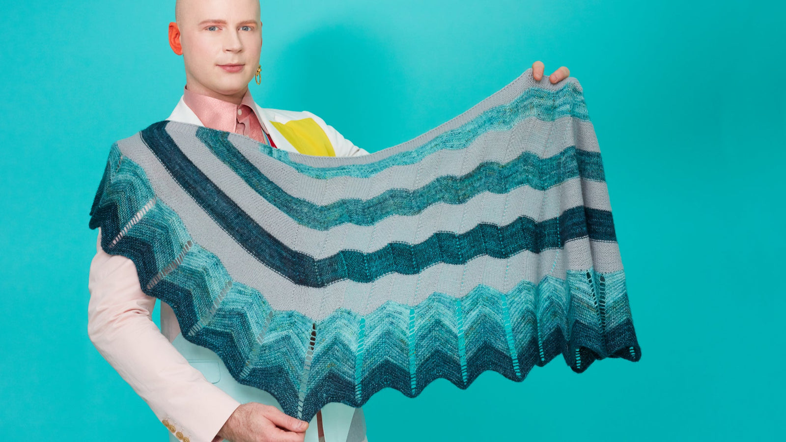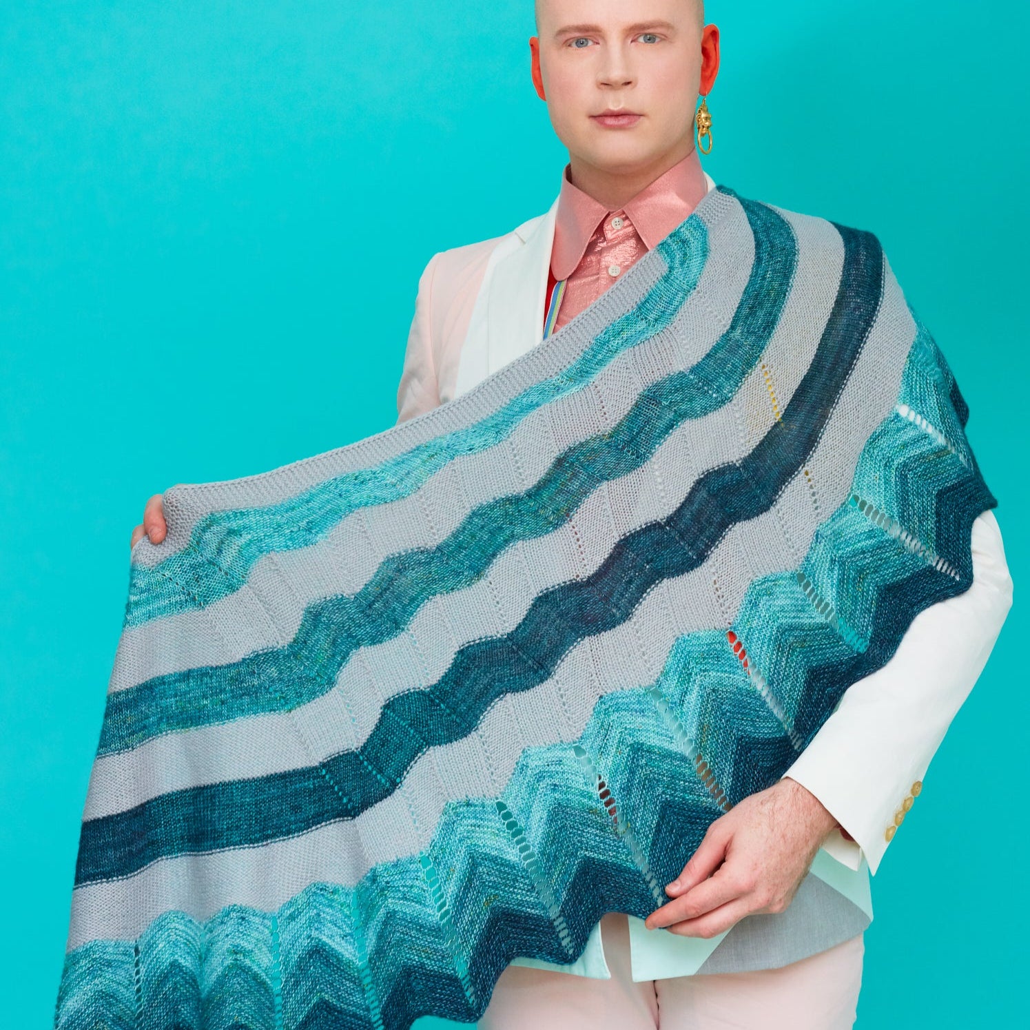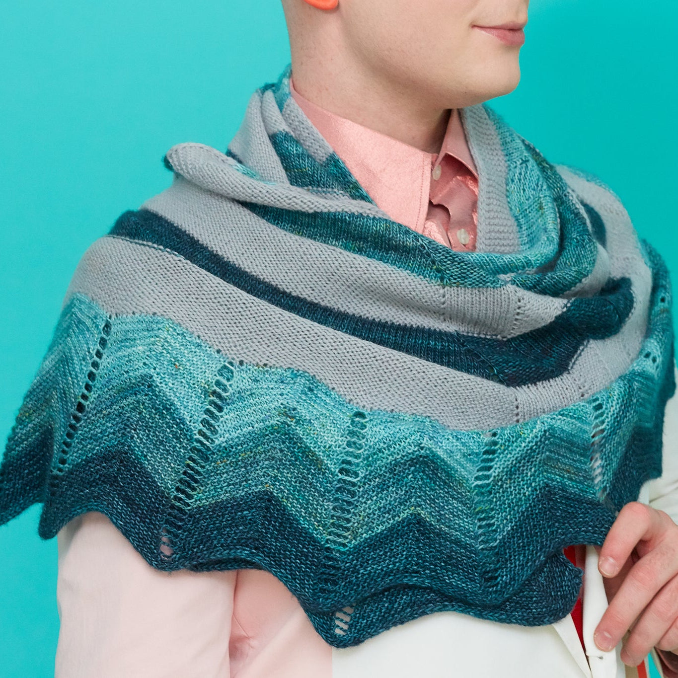 Yarn Requirements: 4 skeins of fingering weight yarn.Choppy Waves features one main colour accented by three hand dyed contrast colours. The increases and decreases form a geometric wavy motif with bands of stockinette and reverse stockinette stitch. A garter stitch chevron border melts the three contrast colours together in this large expansive shawl.