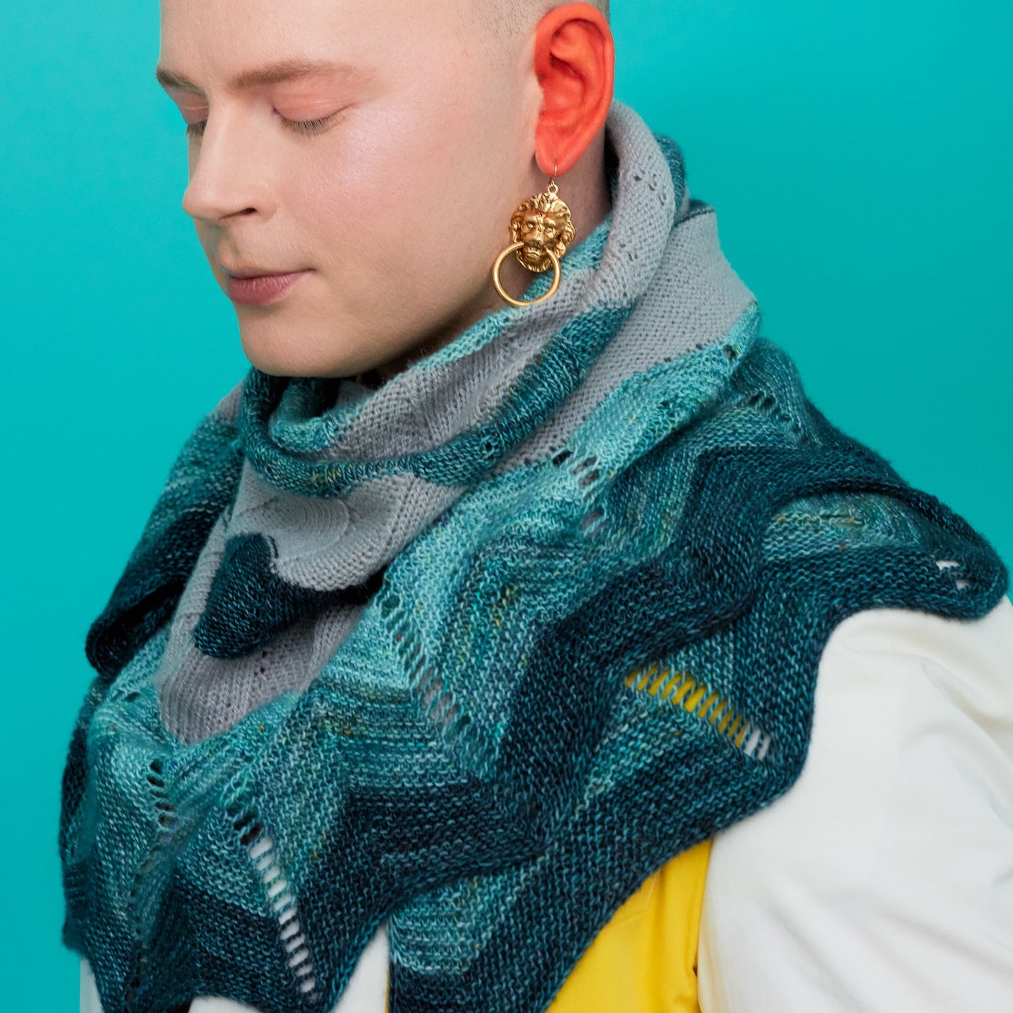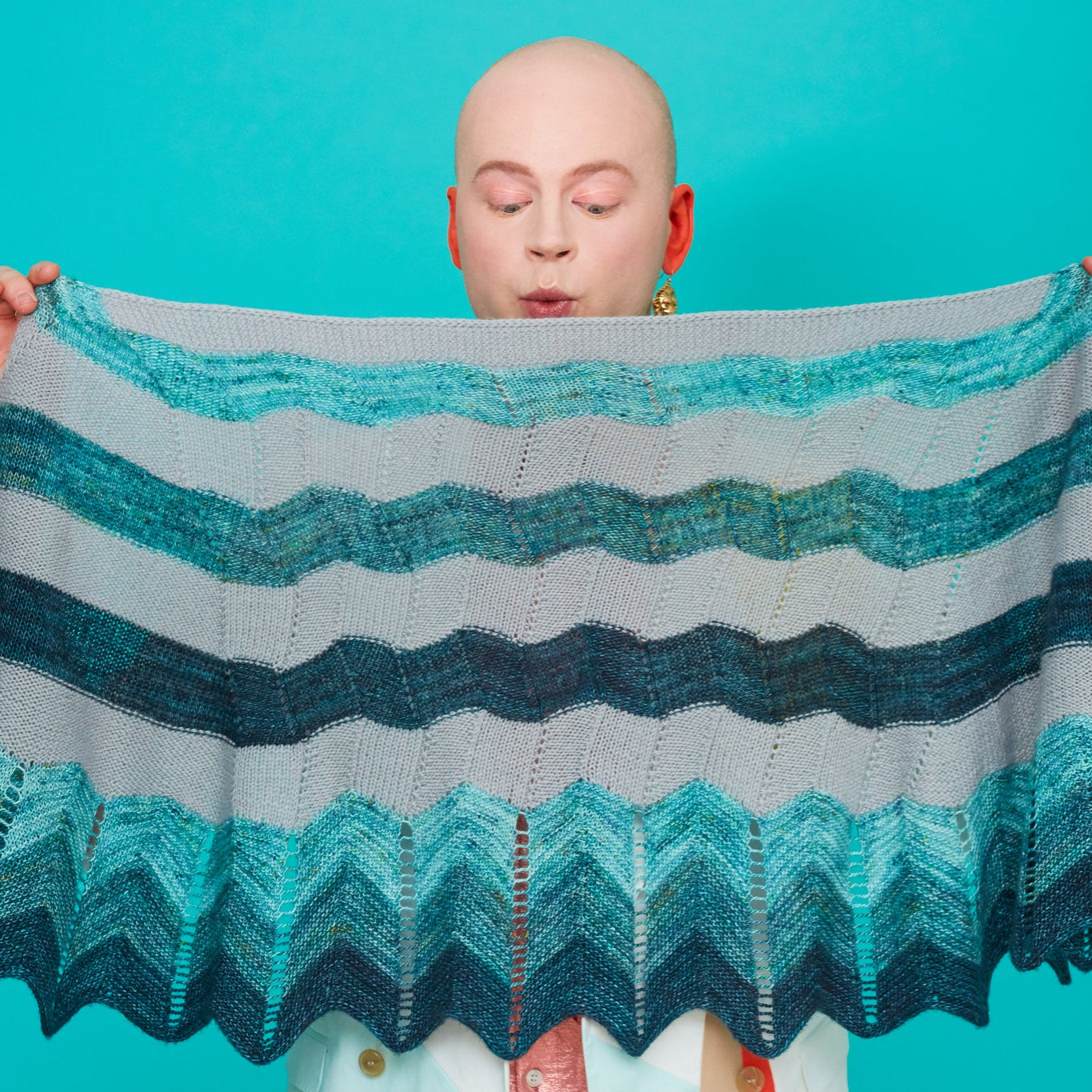 Choppy Waves features one main colour accented by three hand dyed contrast colours. The increases and decreases form a geometric wavy motif with bands of stockinette and reverse stockinette stitch. A garter stitch chevron border melts the three contrast colours together in this large expansive shawl.