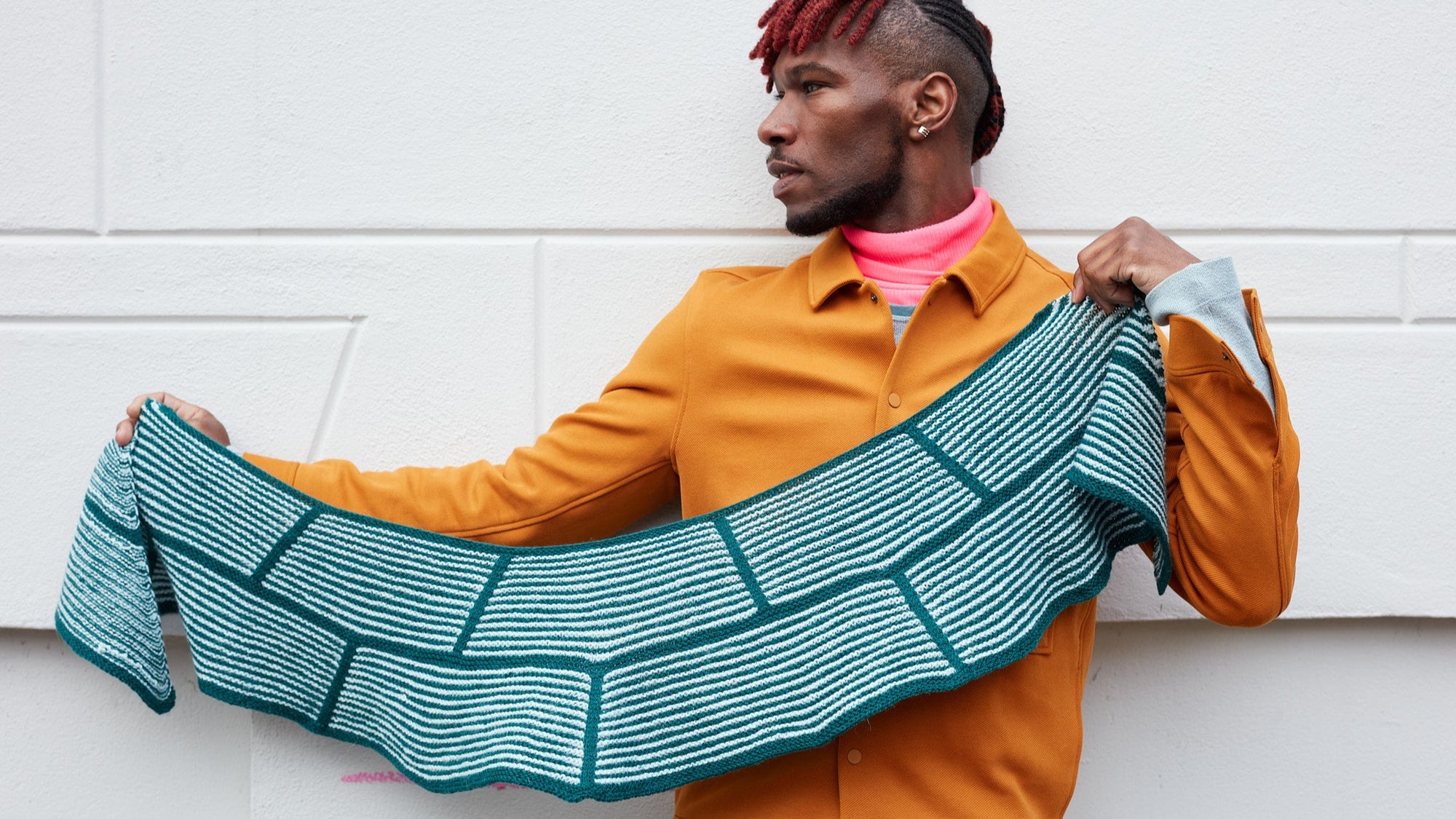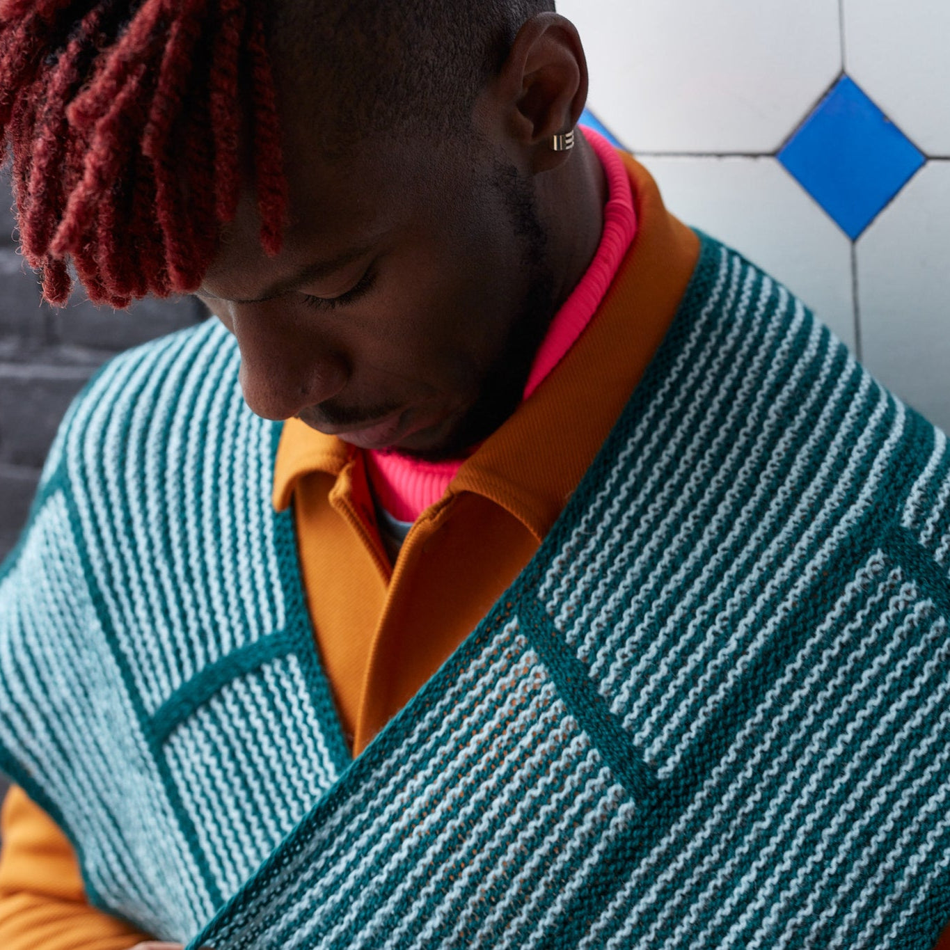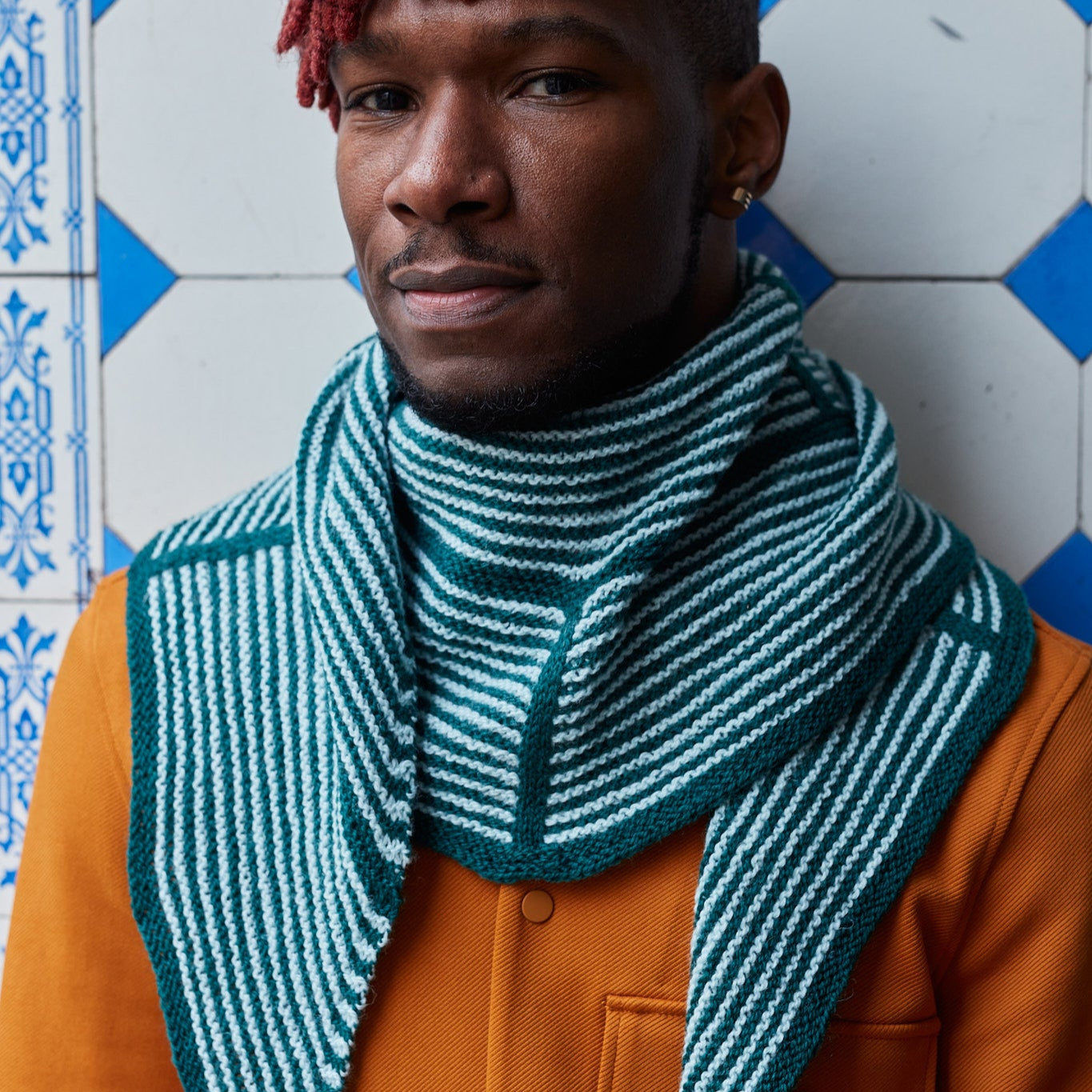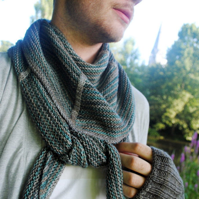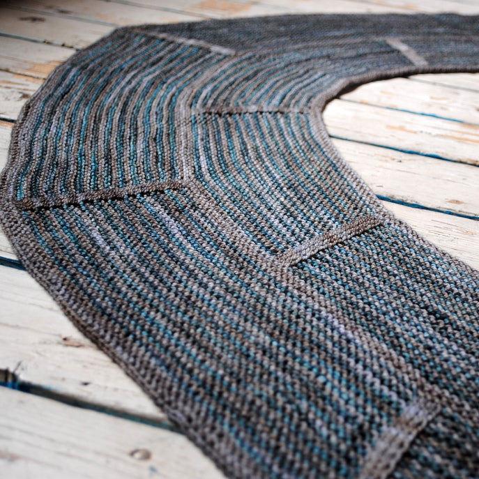 Clockwork is a classic Westknits scarf knit with two colours of fingering weight wool. The main colour forms architectural slip stitch columns with contrasting stripes. Garter stitch makes this project easy to knit while the sophisticated shaping give this scarf a unique arched shape. It rests effortlessly over the shoulders!