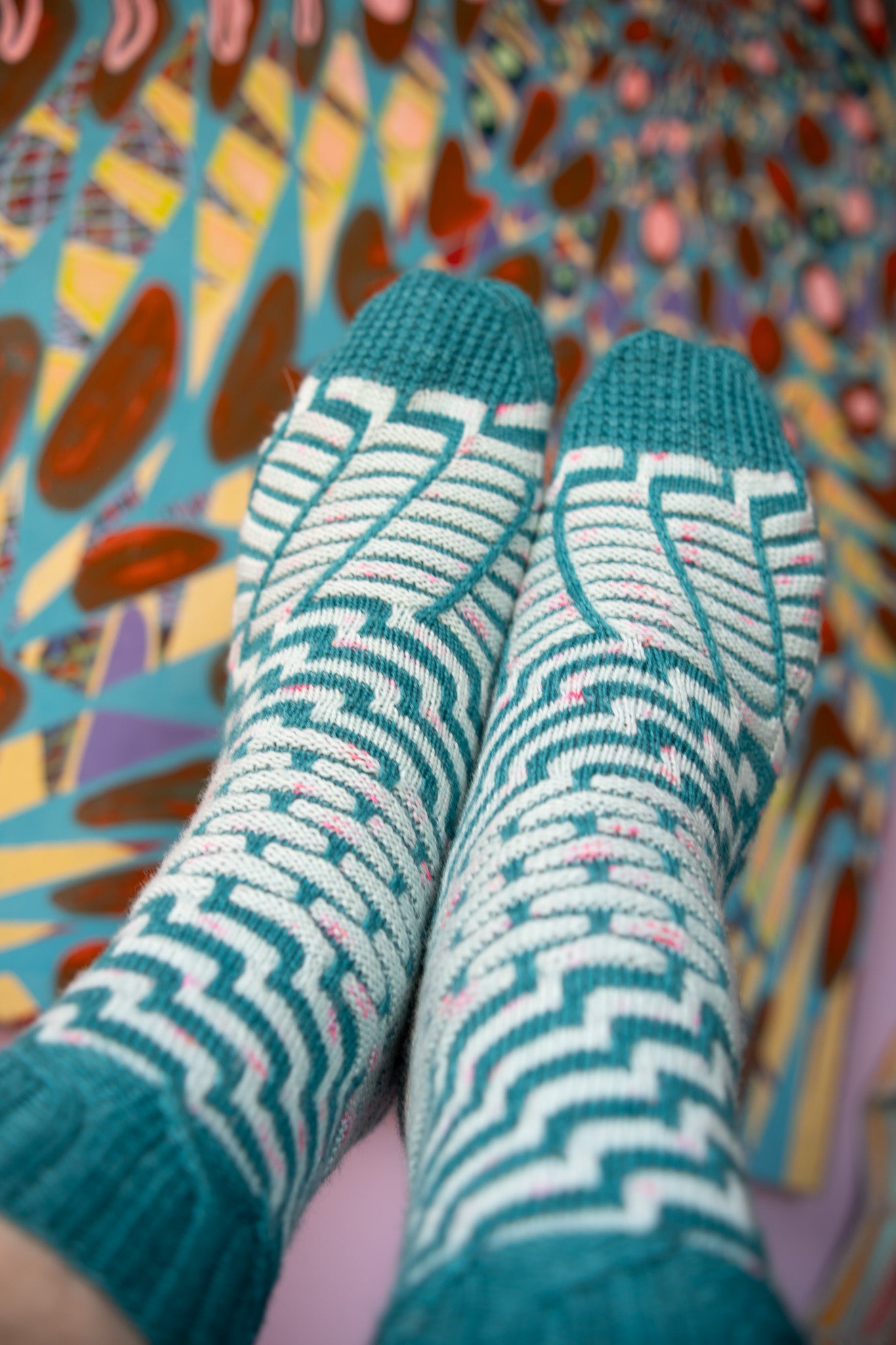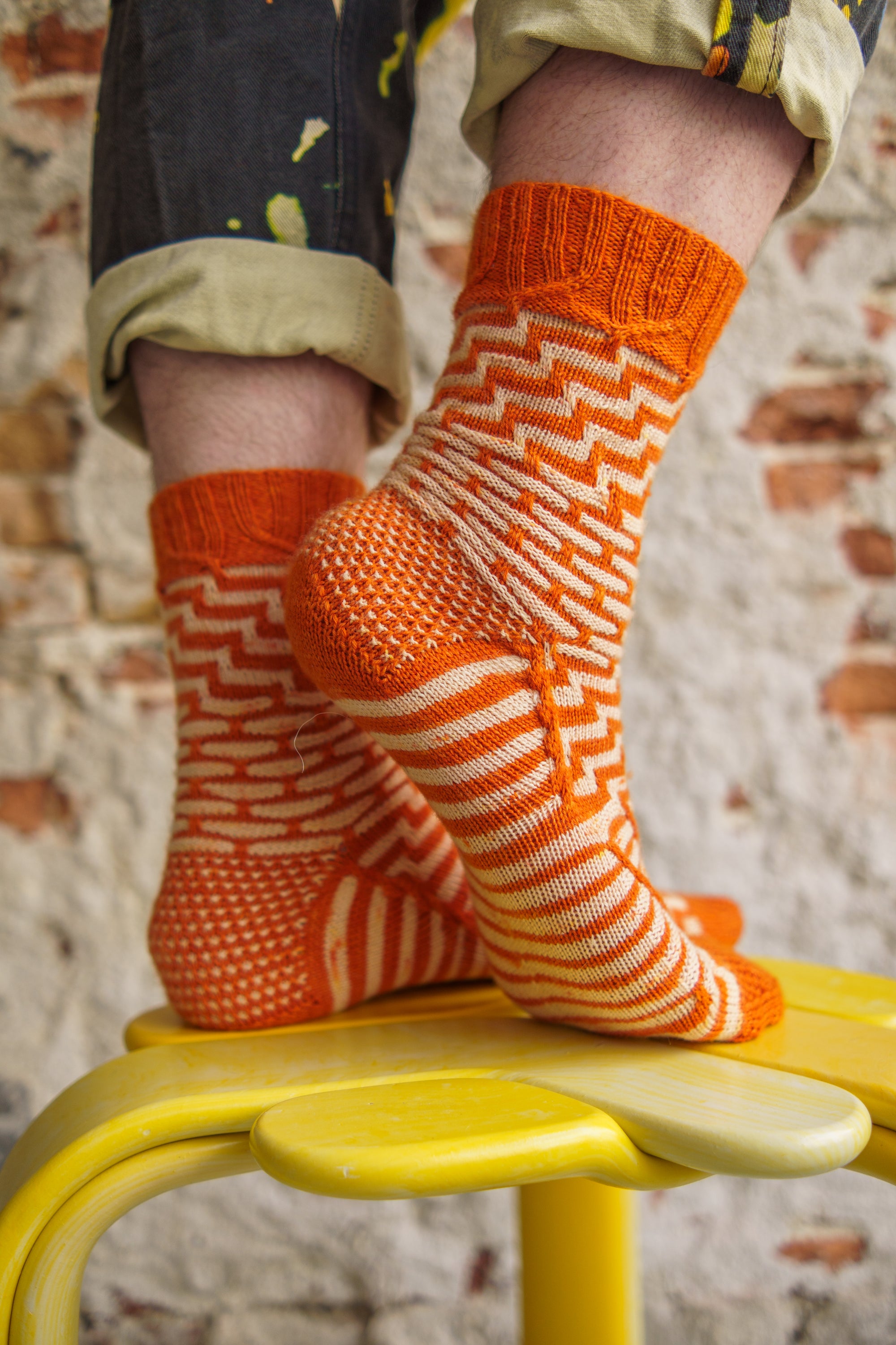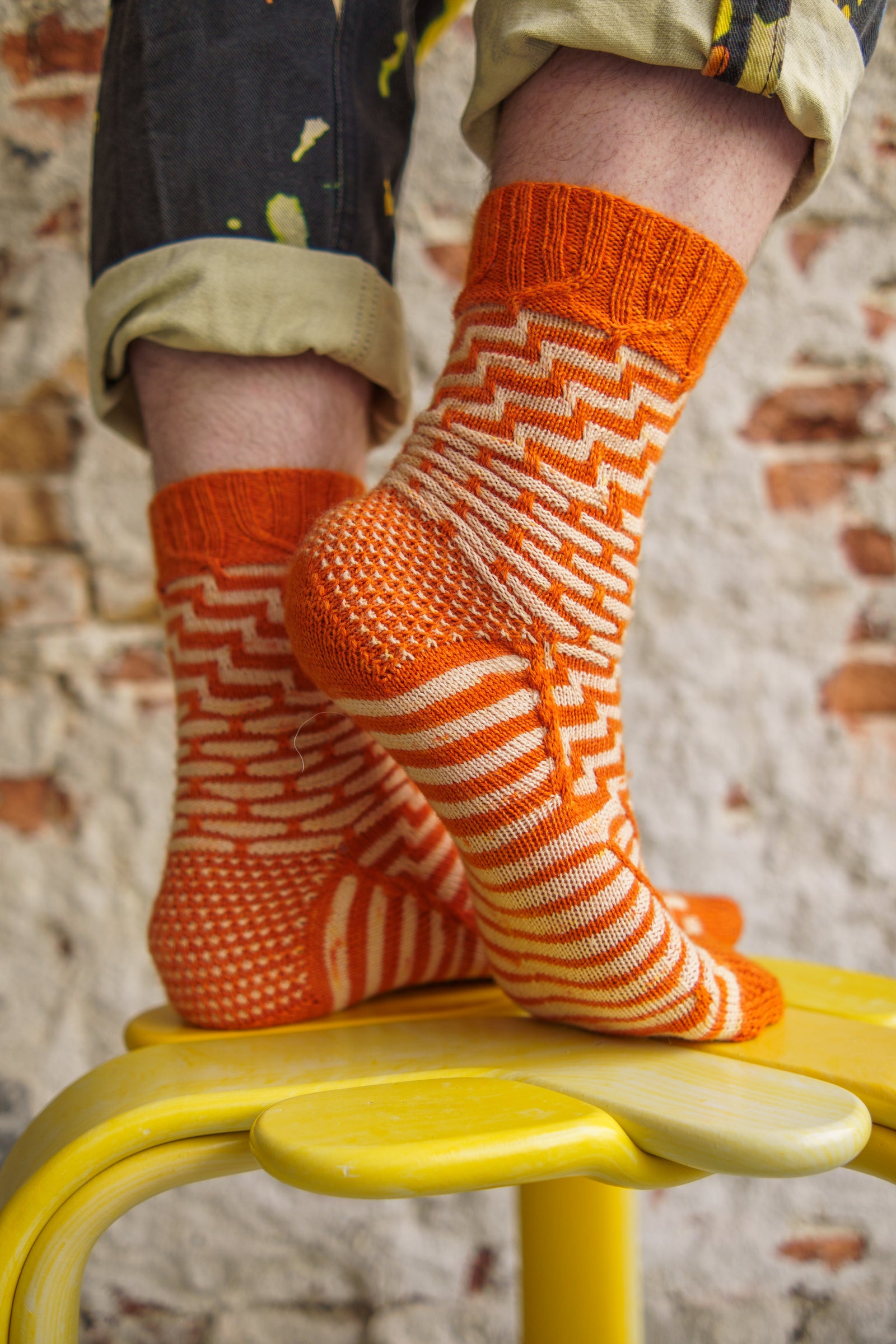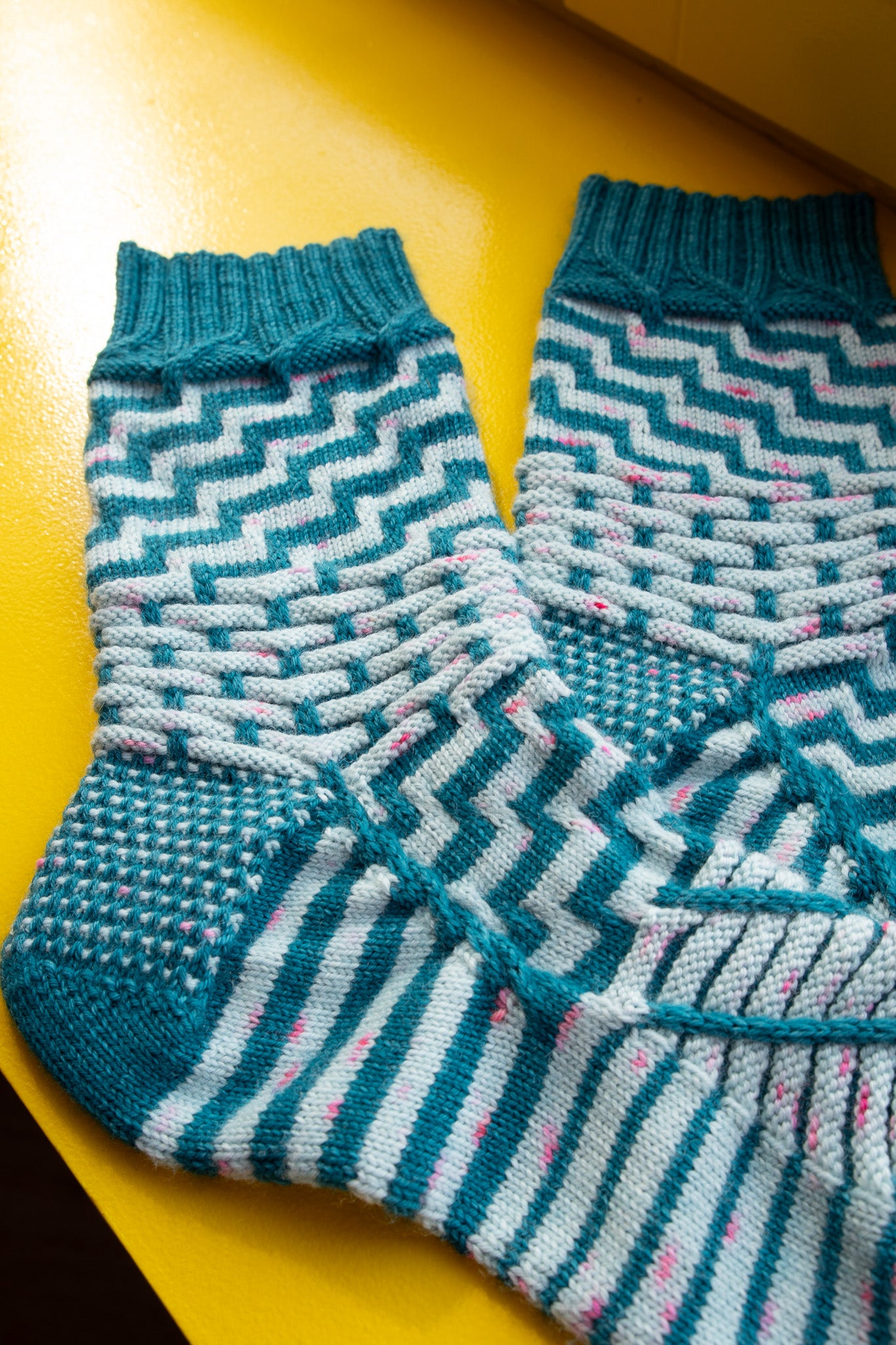 Originally part of Westknits' very first Suprise Sock Along, the Contrast Blast Socks celebrate the gorgeous textures you can achieve with only two colours. Simple cables, slip stitches, and even a broken rib section for the toe produce a sock that will be the centre piece of any outfit.