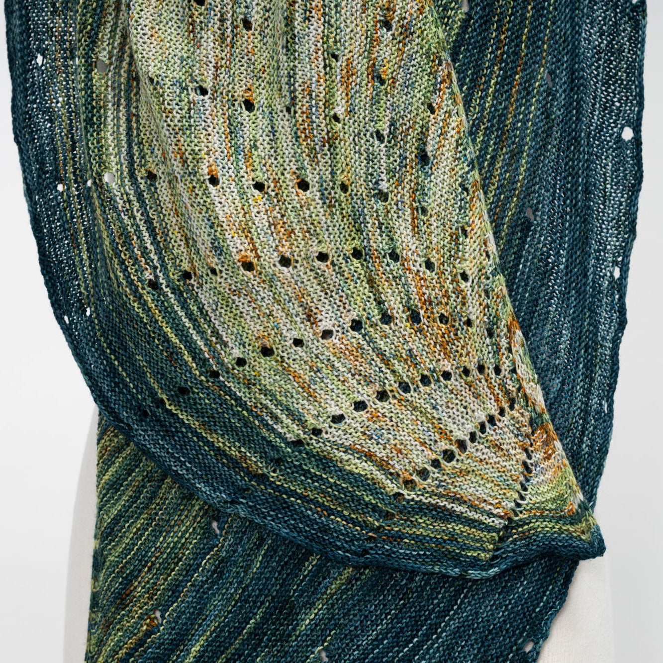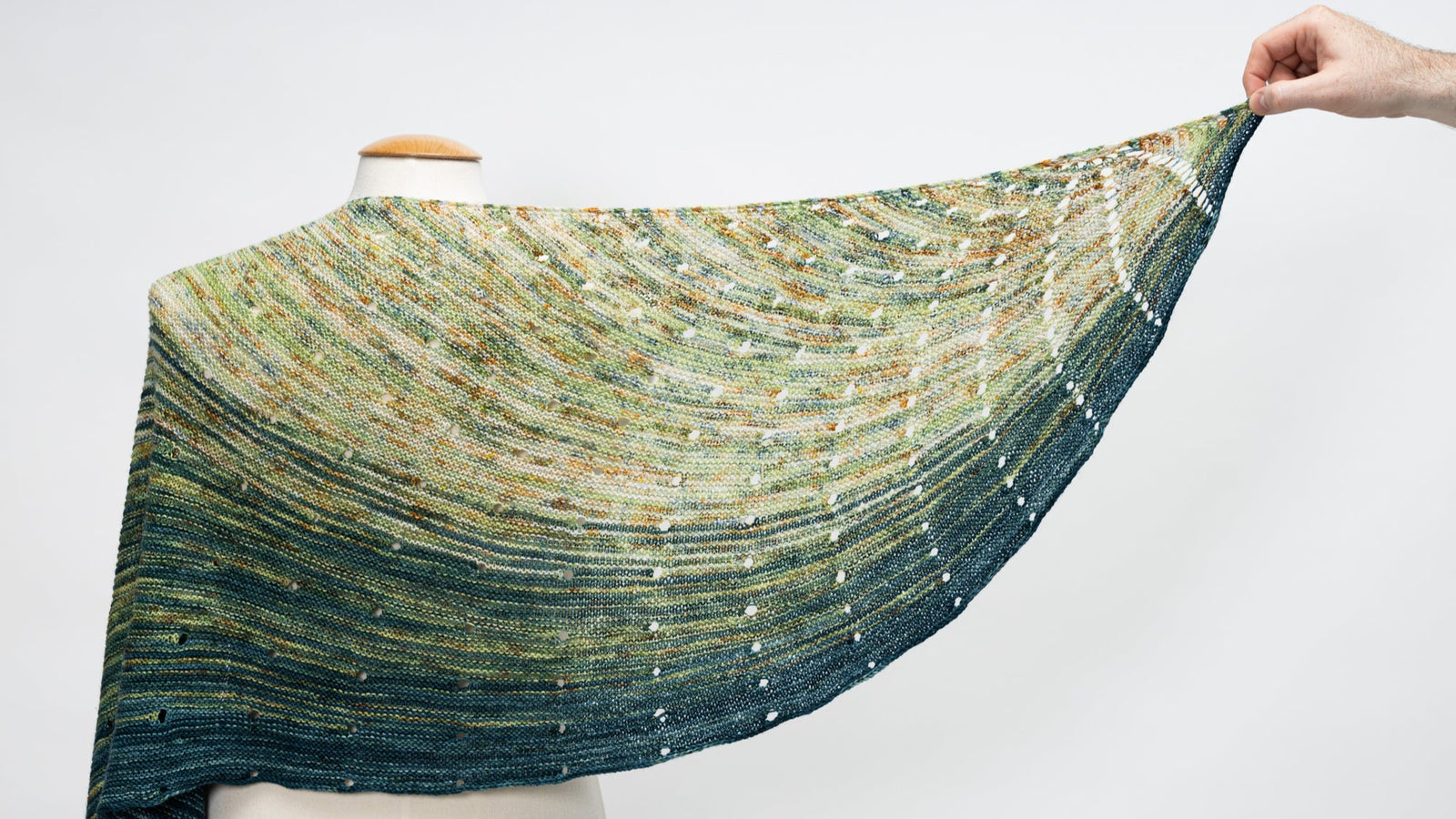 This arched shawl begins at the centre with only a few stitches while yarn over increases quickly expand the shape. Garter stitch short row wedges add length to one side forming rays that gradually increase in size. The repetitive knit stitches and rhythmic short rows are easy to work while still keeping your interest, a perfect travel project! Built in I-cord edges and an I-cord bind off outline the entire shape for a clean finish. The size of this shawl is also easily customisable! You can bind off early after completing any short row wedge to accommodate various yardage amounts. Choose one of our kits featuring three skeins of fingering weight yarn in gradients or useyarns from your own stash to create this magical striped shawl!
