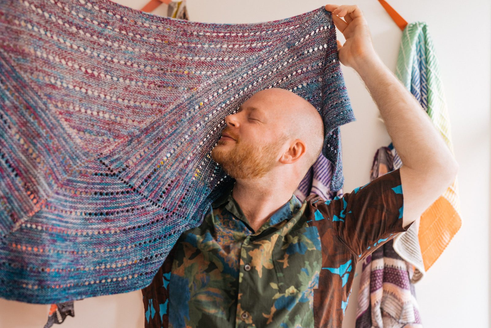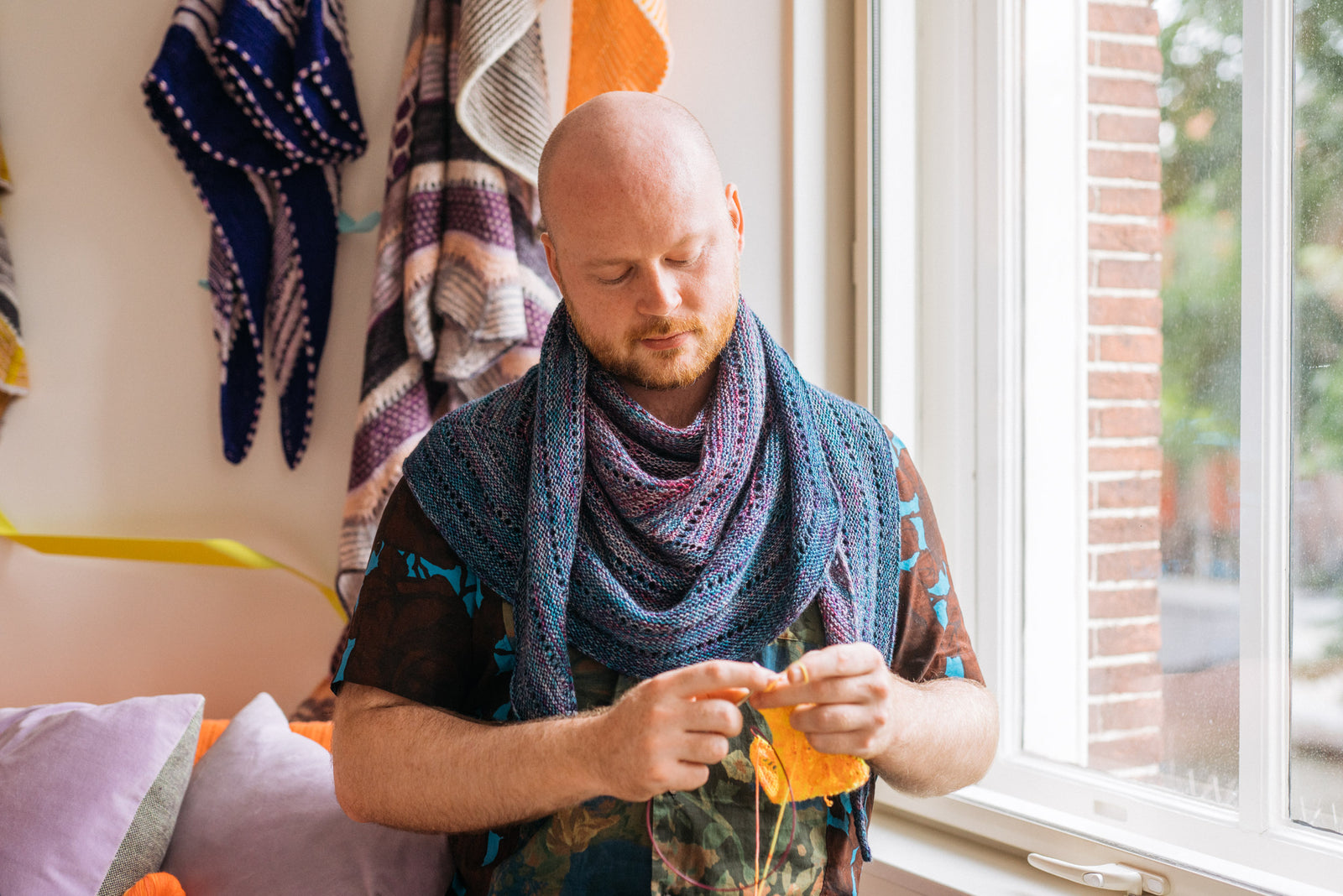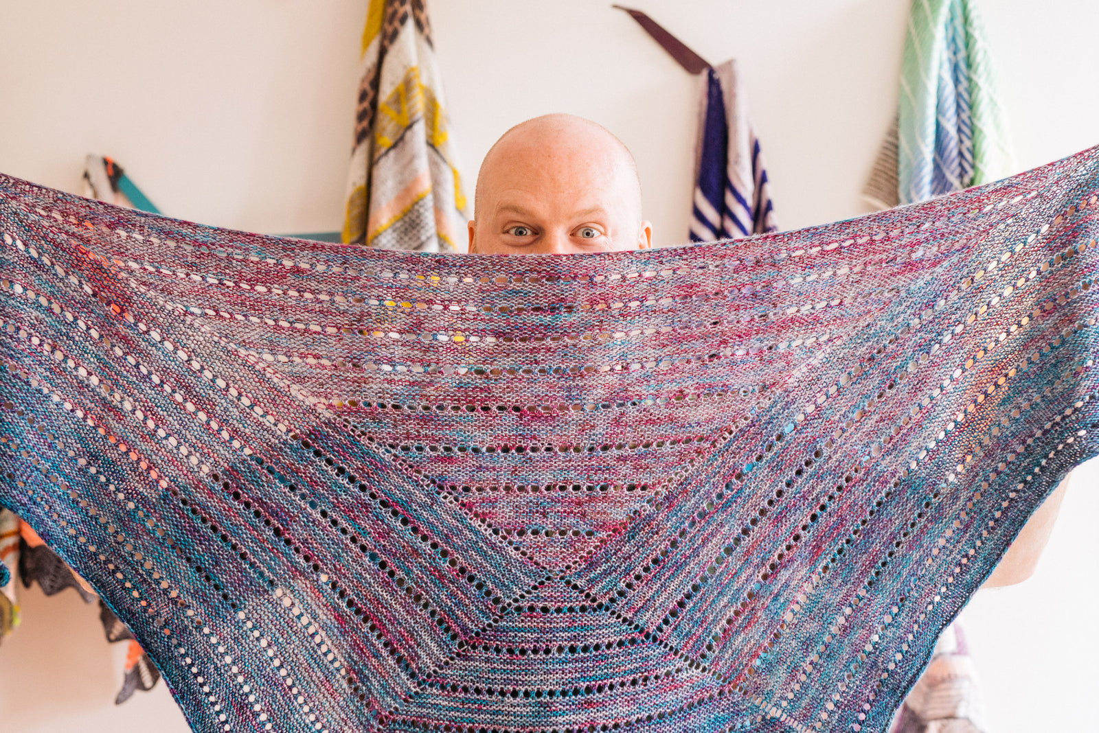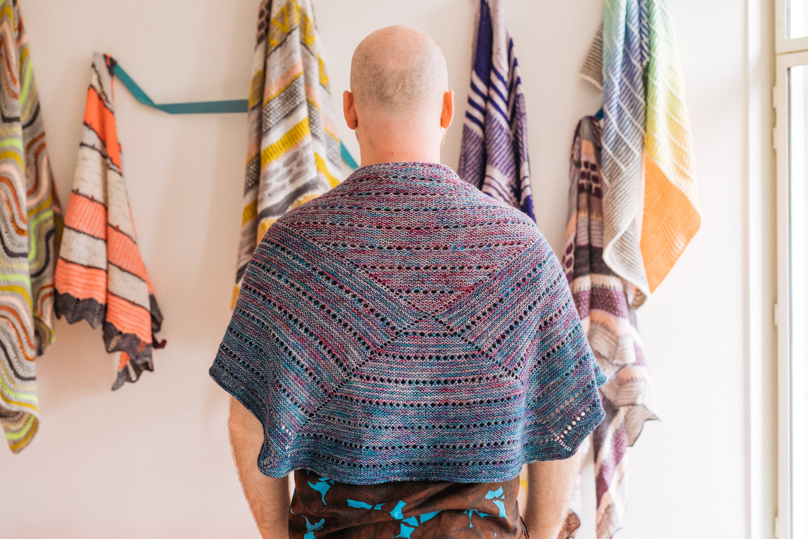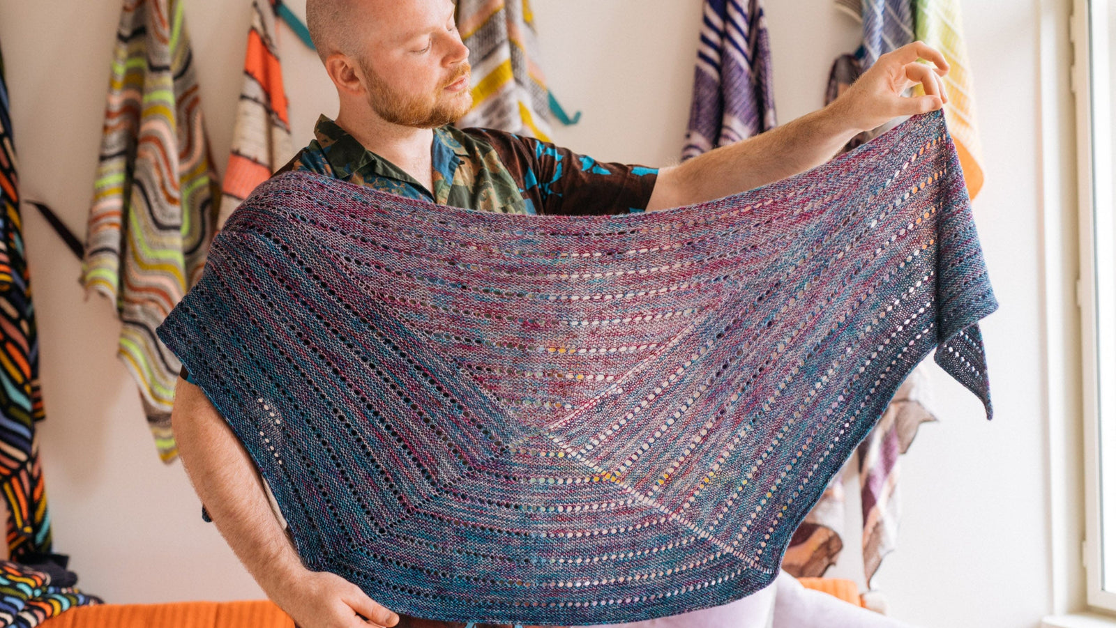 Strong geometric lines and intricate lace come together in the Eyelex Shawl from Westknits. Rows of simple garter stitch and eyelets form a shawl that is as simple as it is beautiful. Watch the colours in your favourite three skein kit seamlessly melt together throughout a simple relaxing project perfect for beginners and advanced knitters alike.