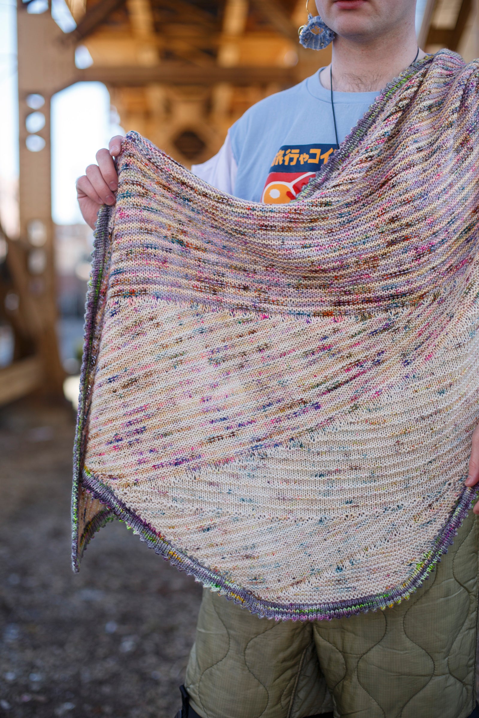 Choose a fading palette of colors to knit this lovely short row shawl design. Colours fade from light to dark with various knit and purl stitch patterns to keep each wave interesting. Finish the edging with a folded picot hem or work an I-cord bind off to frame the final shape.