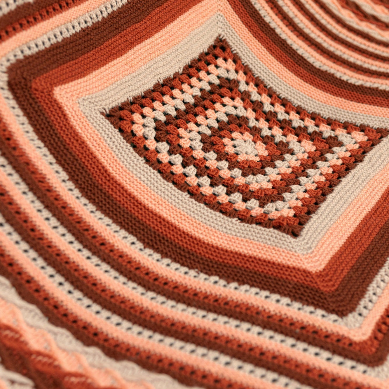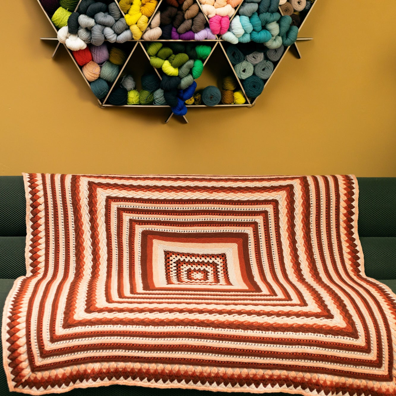 If you fell in love with the dip stitch, slip stitch and faded fun during the 2023 Mystery Knit Along, this blanket is for you! Inspired by the Geogradient Shawl, this square blanket is a colourful collage of stripes and textures. The blanket begins with a crochet granny followed by garter stitch and eyelet stripes. As the blanket grows larger with increases at each of the four corners, a beautiful zig zag slip stitch pattern is introduced producing a woven effect. The final border features all four colors with a dip stitch technique. We have several four colour kits in delicious DK to choose from!