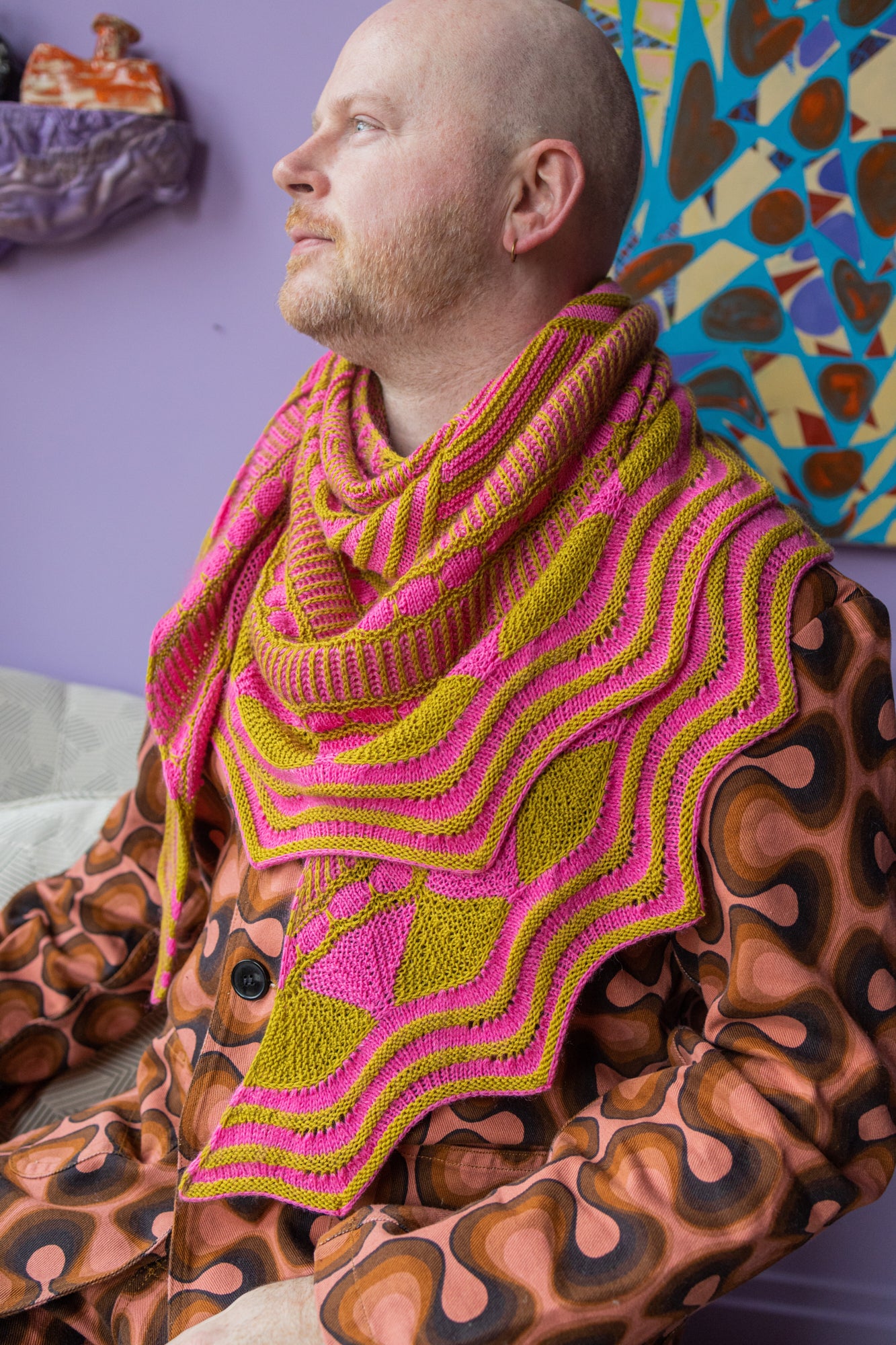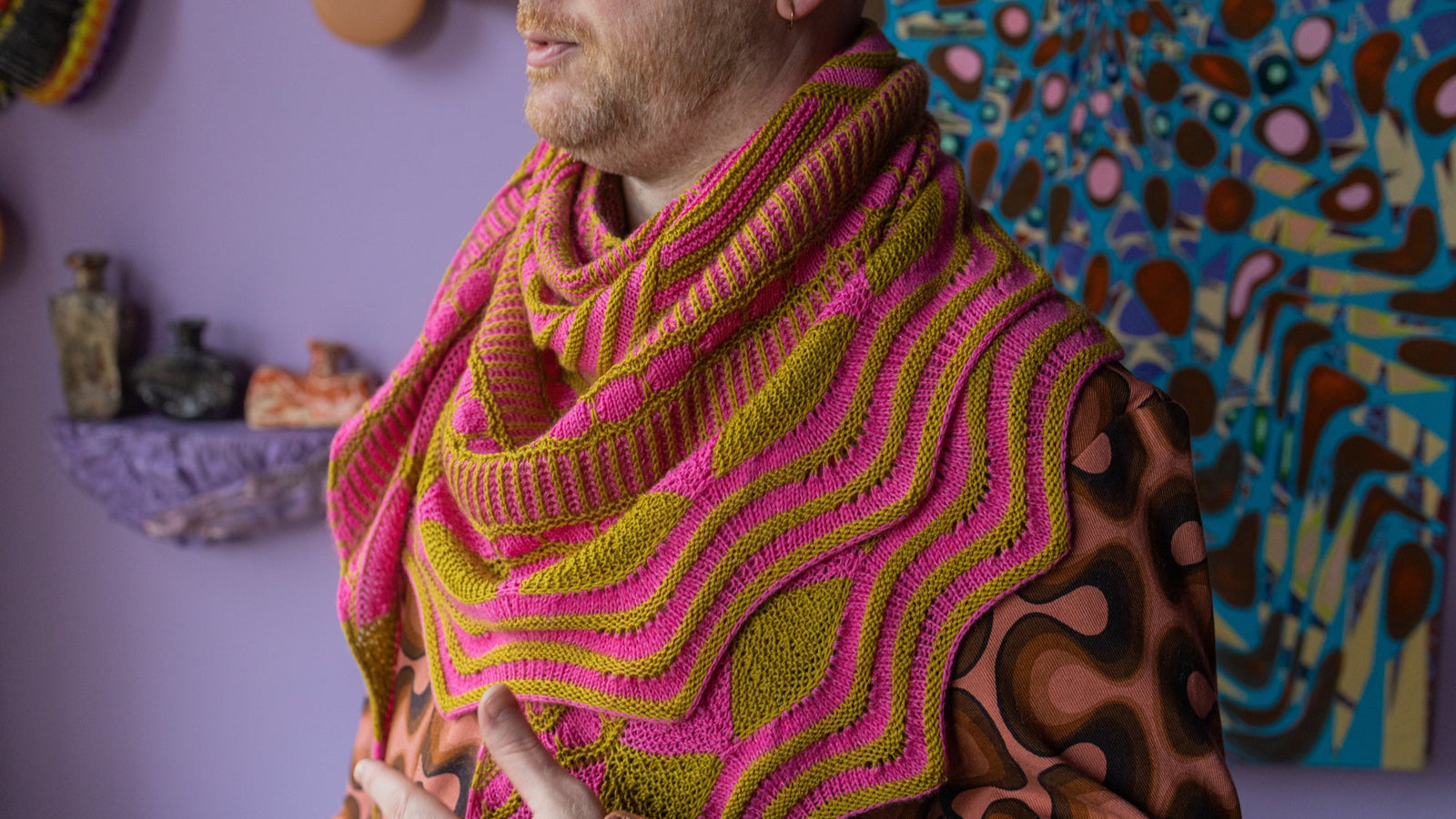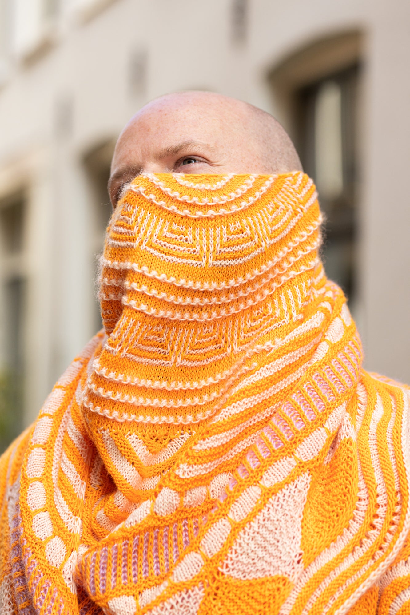 Choose your two favourite colours of fingering-weight yarn and start knitting the stunning Go Go Dynamo Shawl! The geometric pattern of this shawl begins with modular sections that form both curved and straight stripes. You can then choose to continue with bands of bubbles and brioche for a scalloped short-row edging, or opt for eyelets as an easy non-brioche alternative. Next, stitches are picked up from the first sections to create the top centre of the shawl, featuring tiny bobbles and slip stitches. You can decide to knit a wavy border to make the shawl larger or incorporate a Mohair Dare for a fluffy contrast colour pop. Have fun customising your own Go Go Dynamo Shawl!