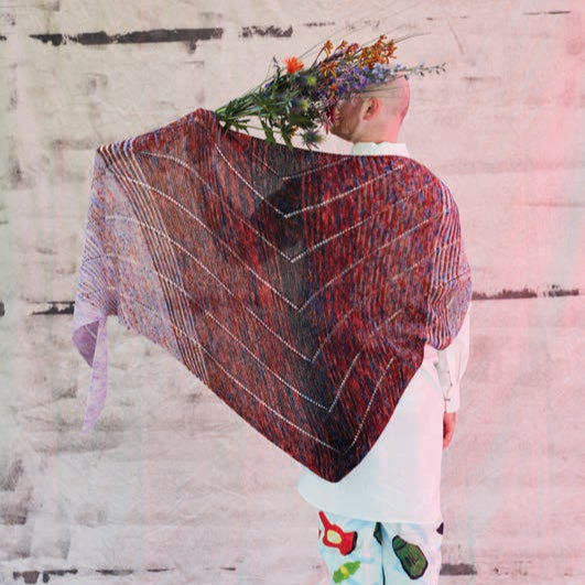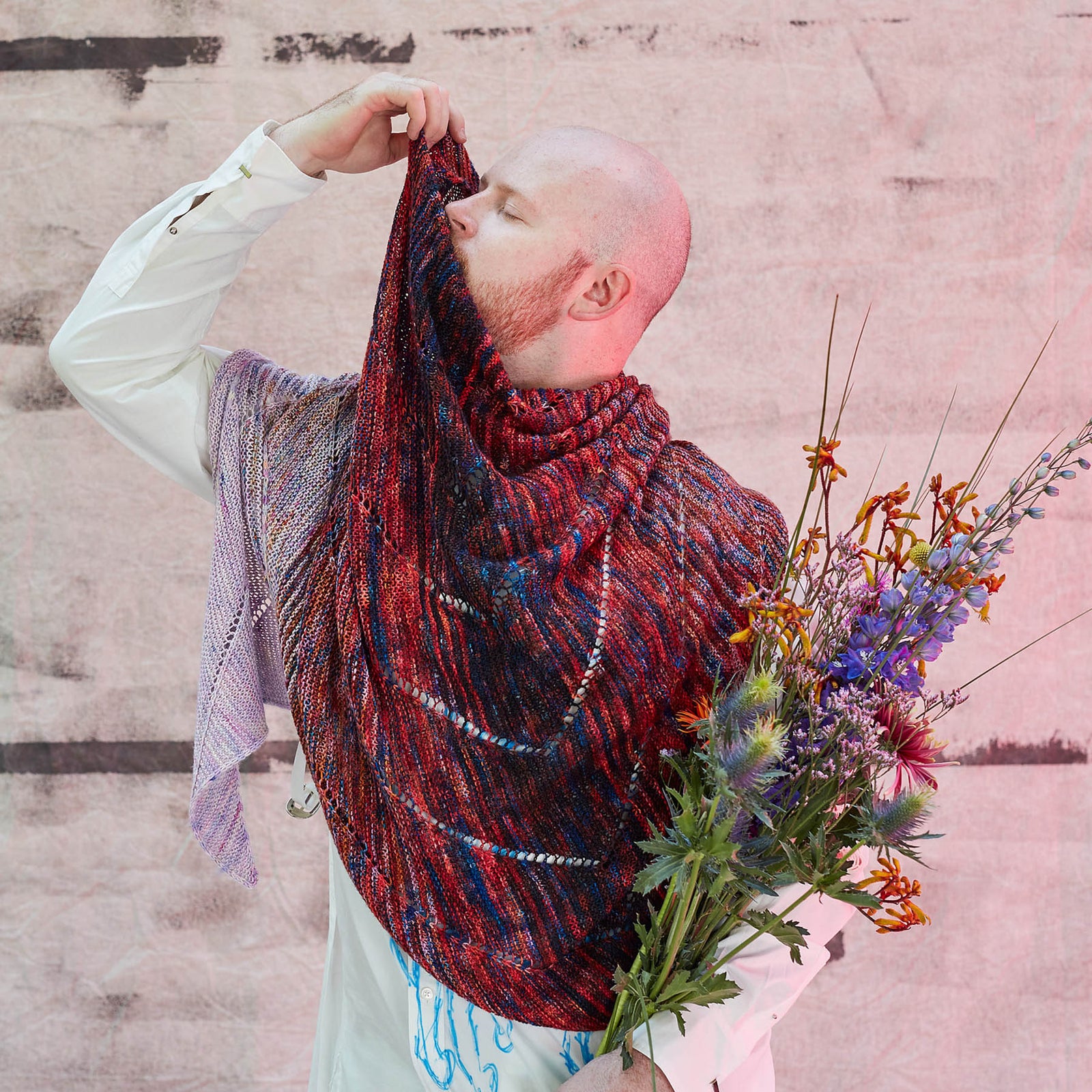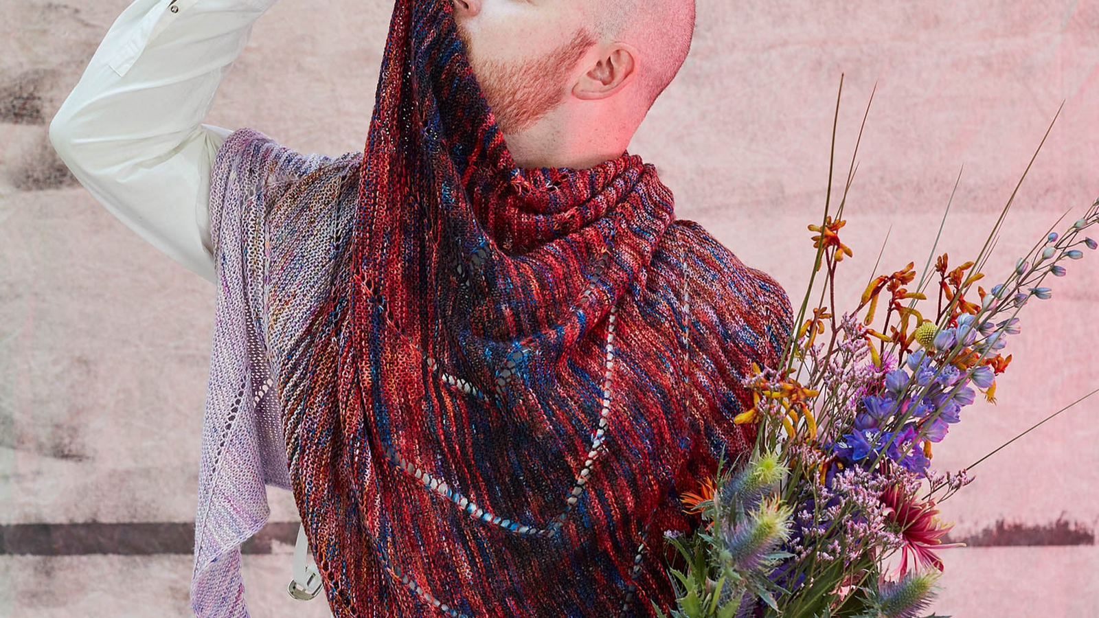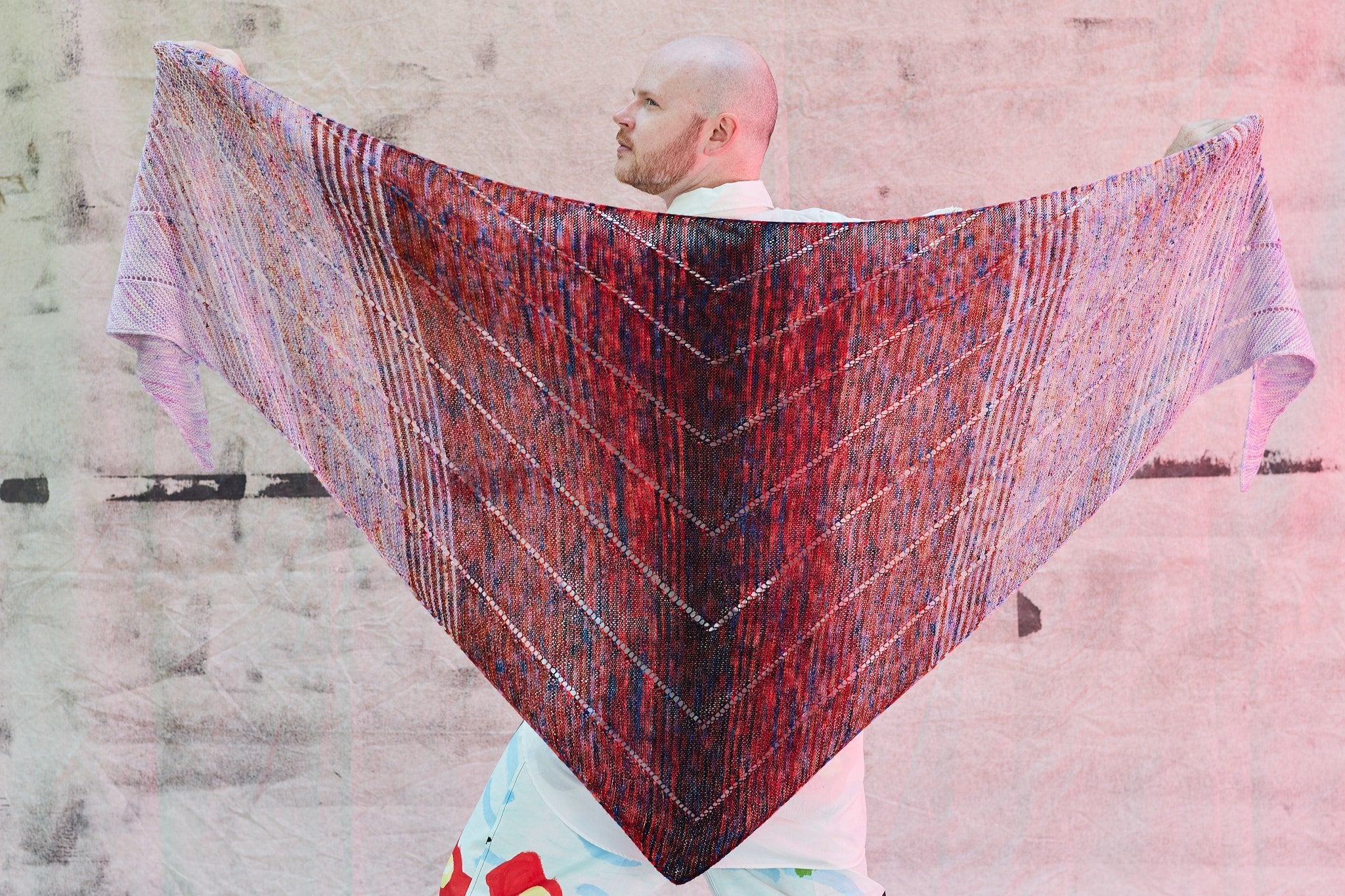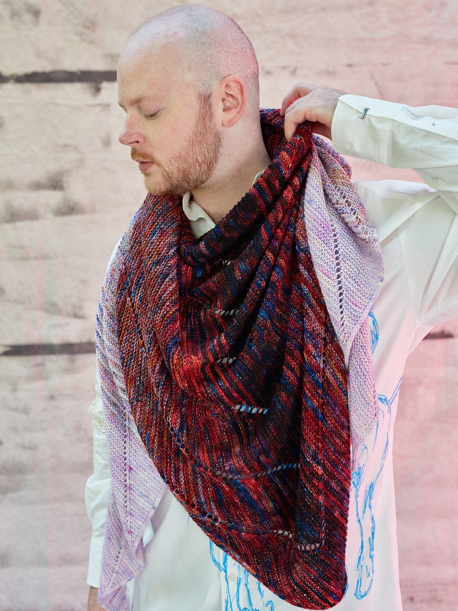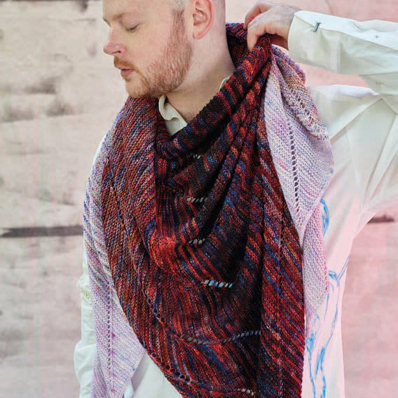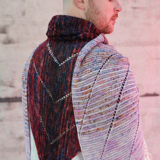 Choose five colours and fade them together for this large triangular shawl. This simple design is knit sideways in garter stitch from wingtip to wingtip. Lace columns accentuate the angles with smooth I-cord edges framing the entire piece. The colours fade to the middle of the shawl and then fade back to the originating colour. This elegant design would also look smashing in a solid colour!