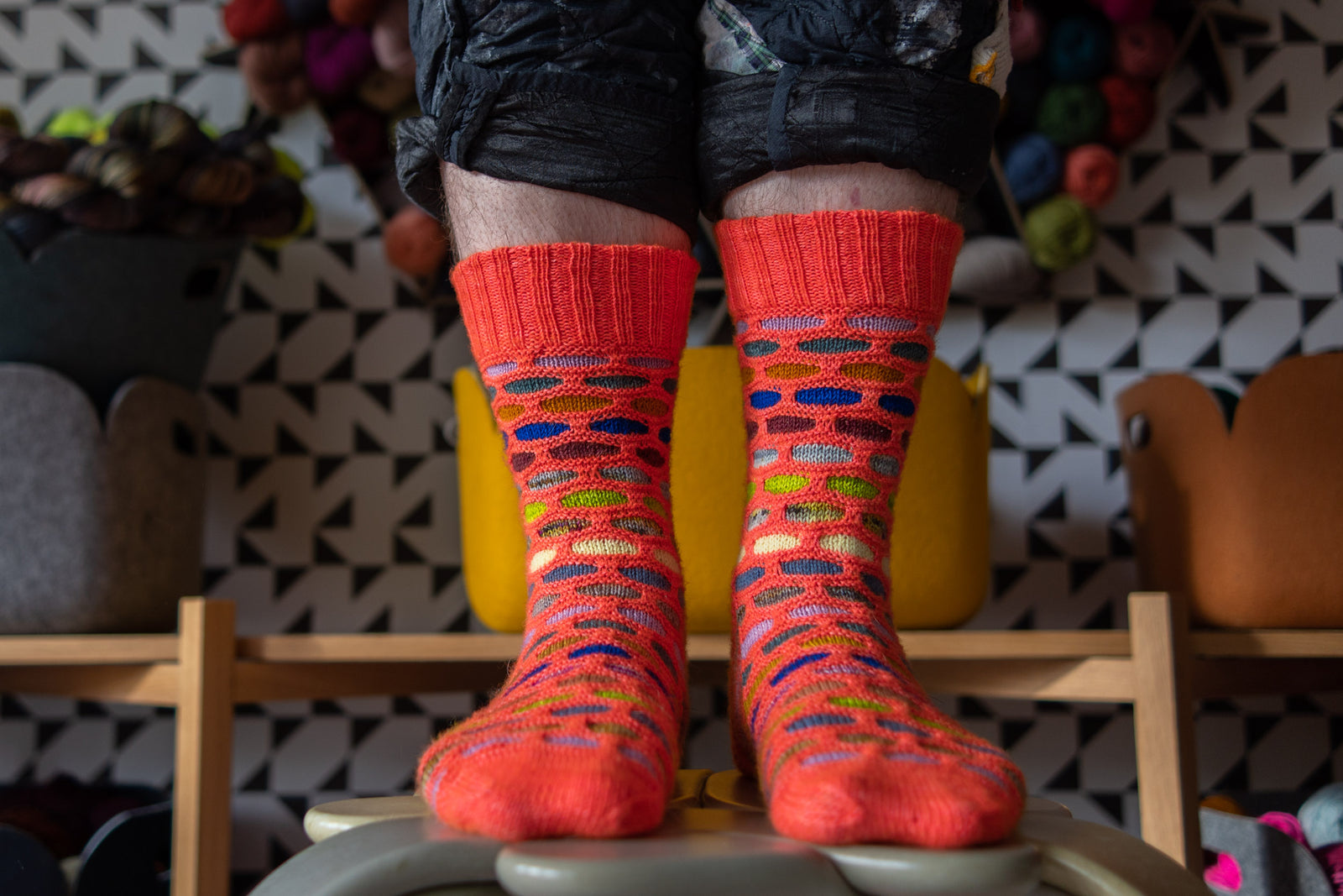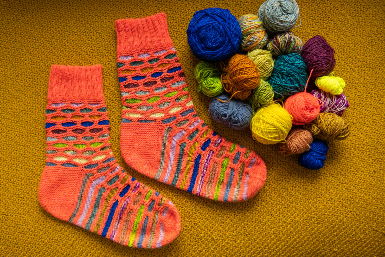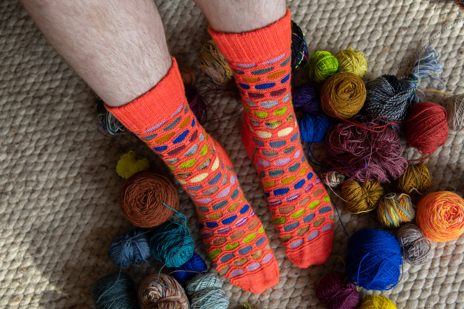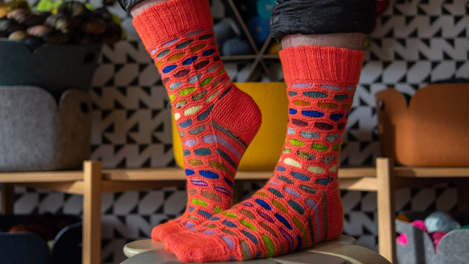 Dive into your sock yarn stash and knit these painterly socks. One main colour in garter stitch frames the contrast colour pops with a simple slip stitch technique. The contrast colours are perfect for using mini skeins. This pattern is knit top-down, so you can easily customise the length of the leg and foot while you knit. Be brave and have fun customising the colour story for your own unique pair of Painting Bricks Socks!