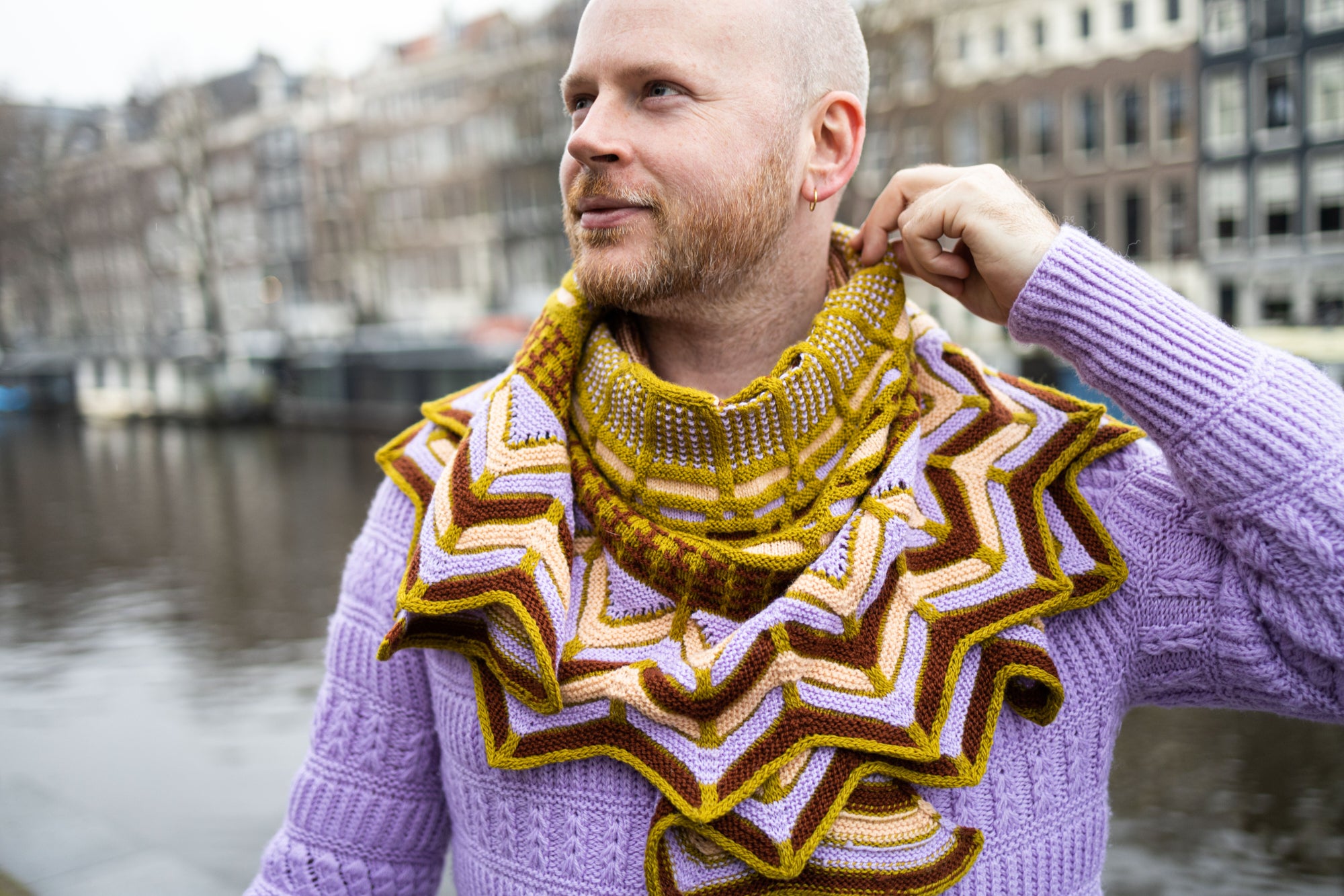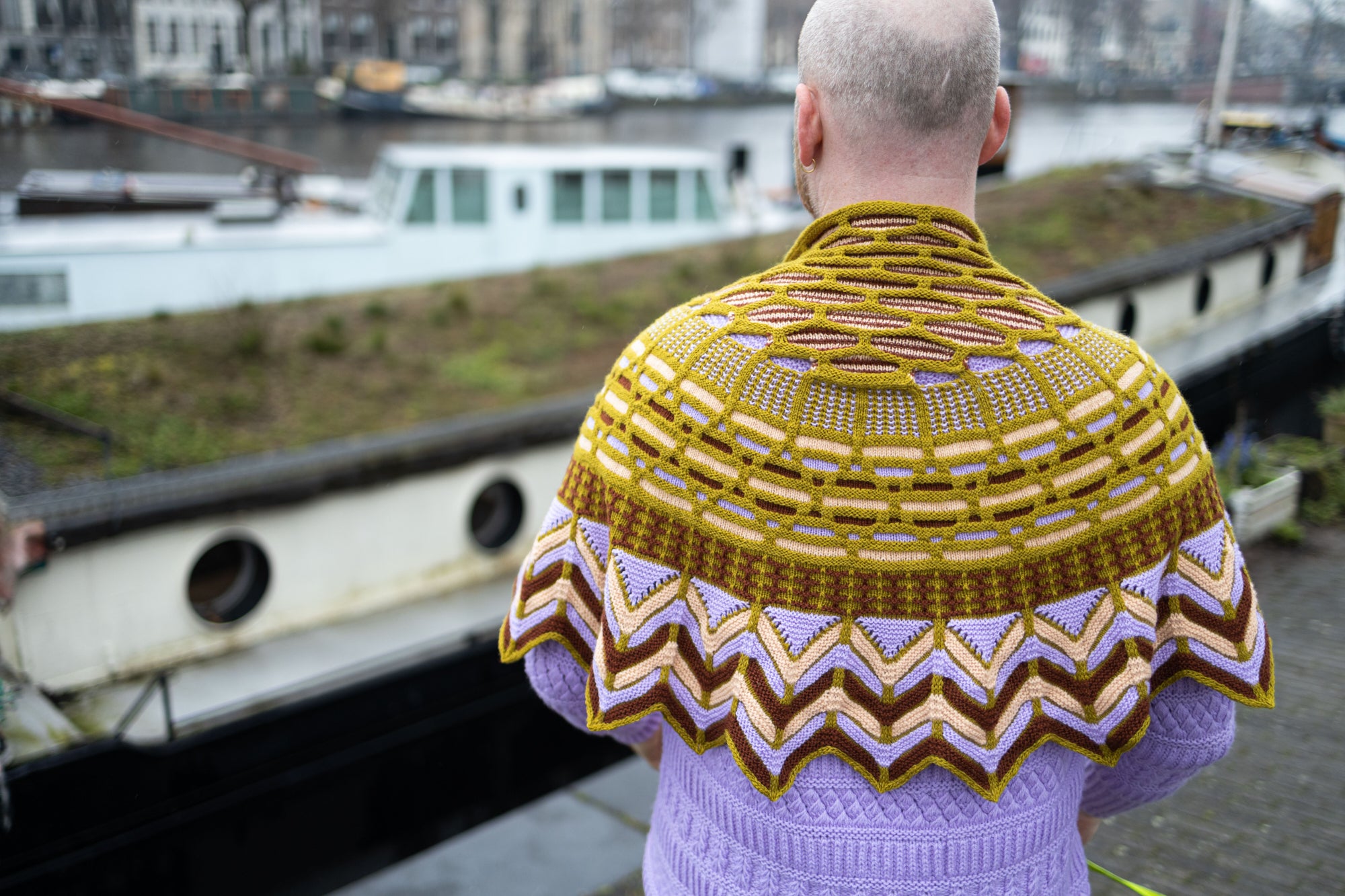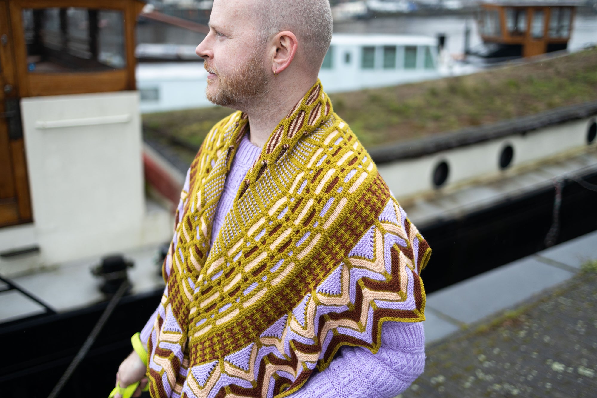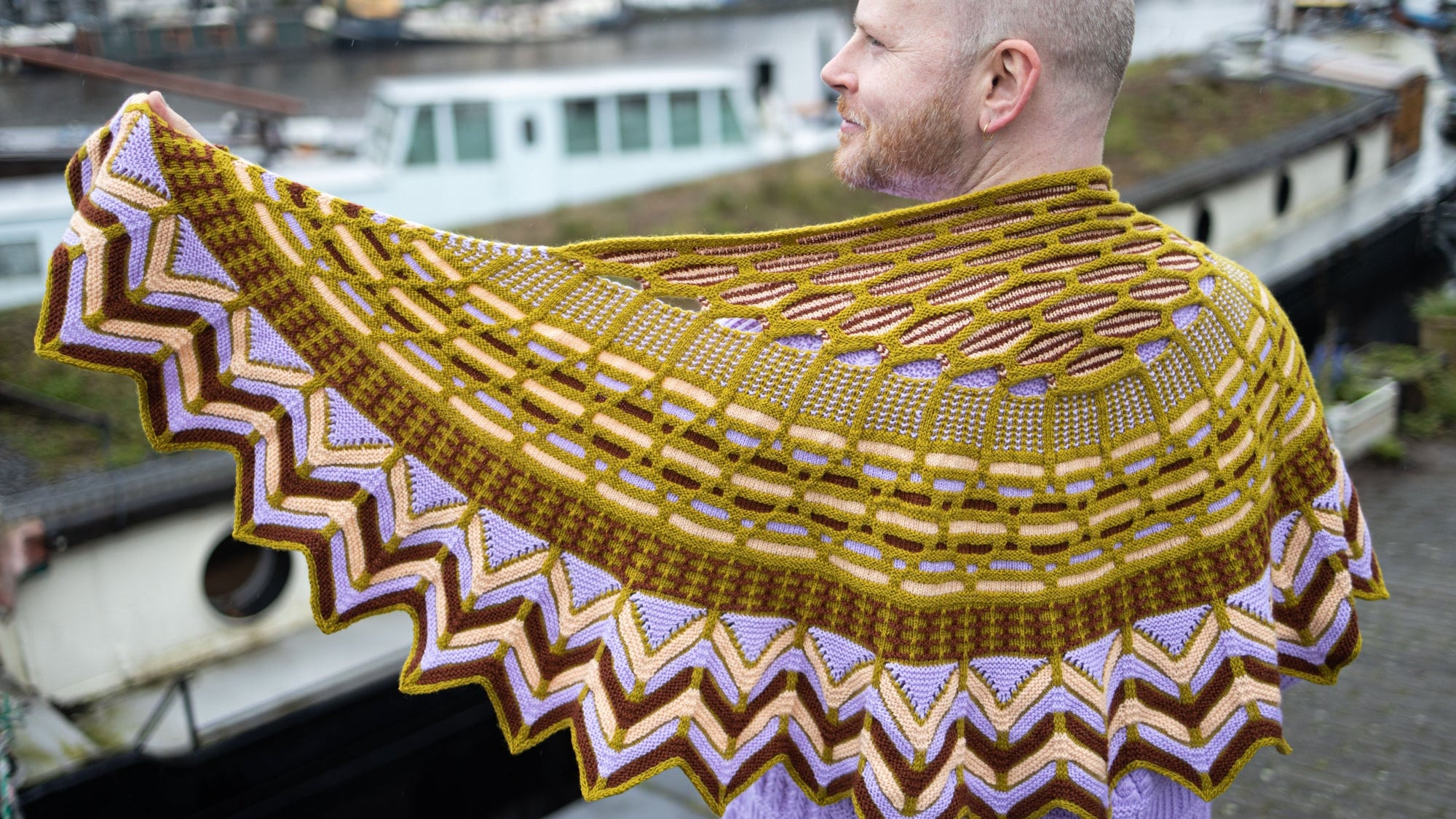 Slipstravaganza was originally released as the 11th Westknits Mystery Shawl KAL. Section 1 begins with striped honeycombs followed by picking up stitches for crisp columns. Slip stitch diamonds feature all four colours and then a small checked slip stitch pattern leads into the chevron border.