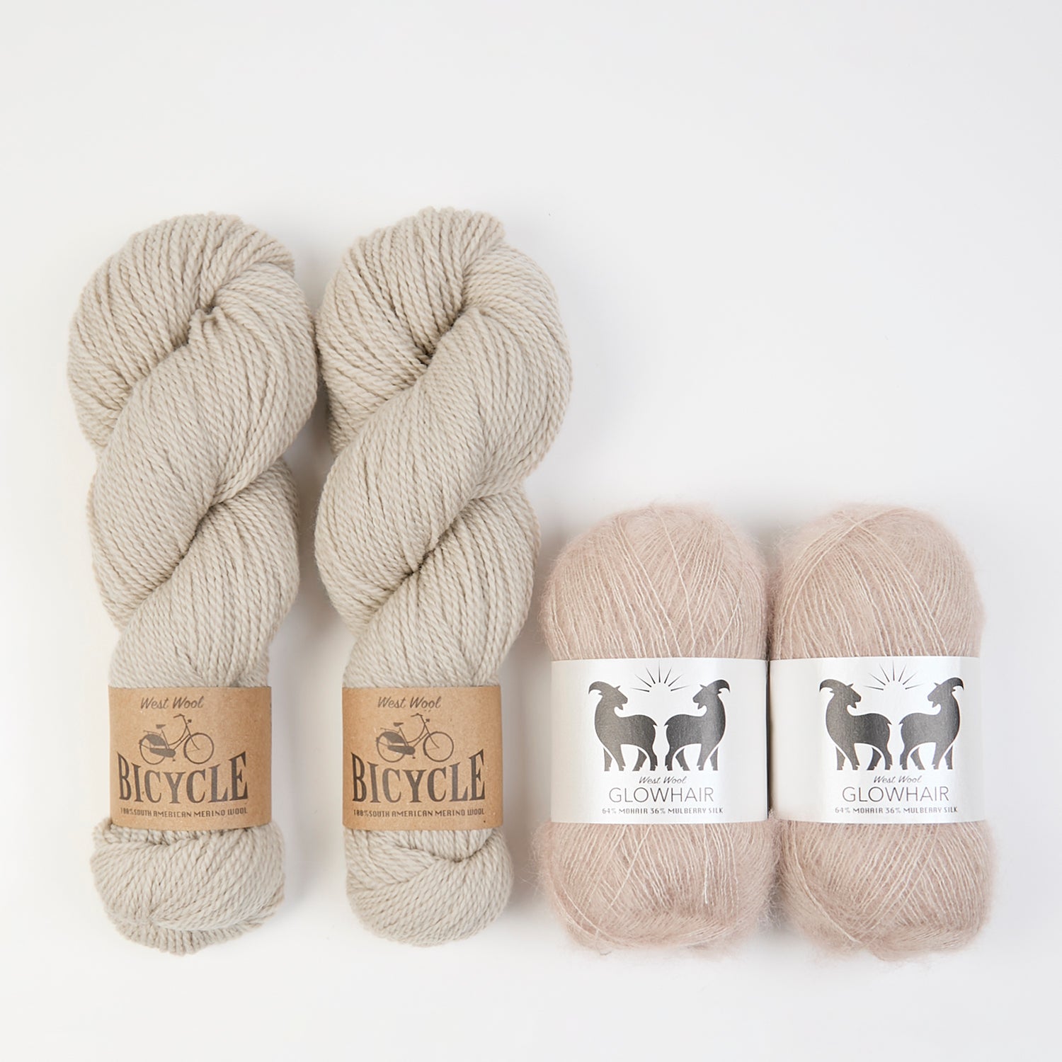 This cosy kit fromWest Woolfeatures two skeins of fingering weight Bicycle paired with two balls of fluffy mohair lace Glowhair in a matching colour. If you need inspiration, it works perfectly for theSmock o'clock Trianglefrom Westknits!