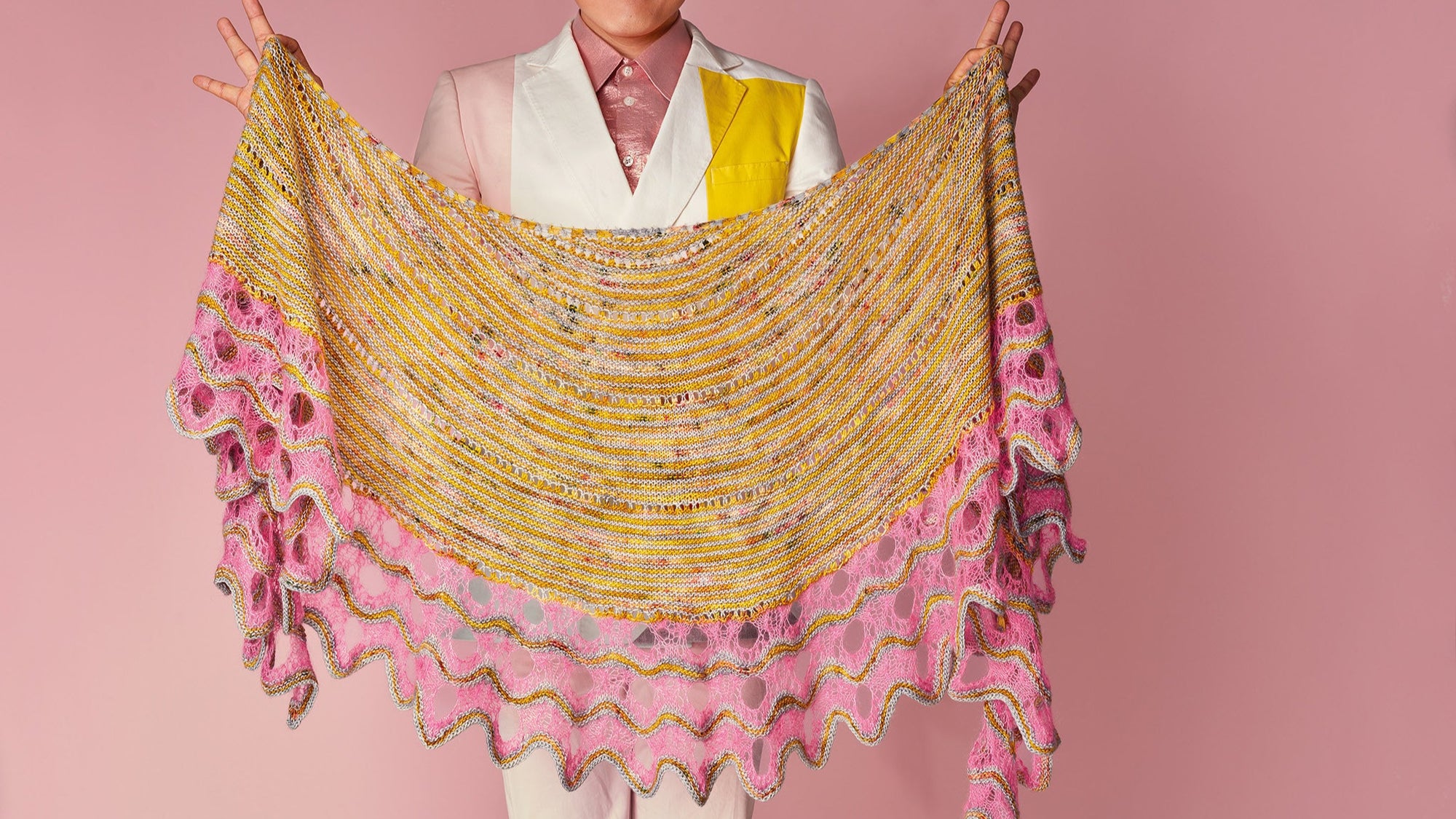 For the Striped Esjan pattern you can choose your favourite combination of six skeins of West Wool’s Tricycle in two gorgeous colours and two balls of Glowhair in a different shade. This semi-circular shawl is knit by yarning over eyelets shape for easy meditative knitting. The border is decorated by large holes knit with a glowing mohair silk colour. The increasing holes produce a lovely scalloped edging inspired by the mountains of Iceland.