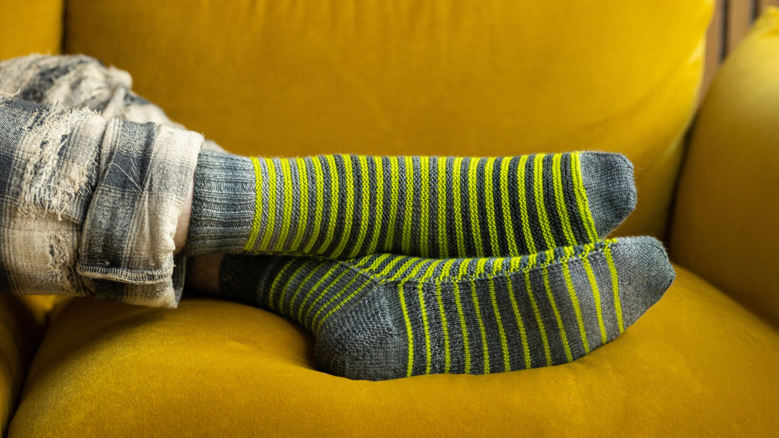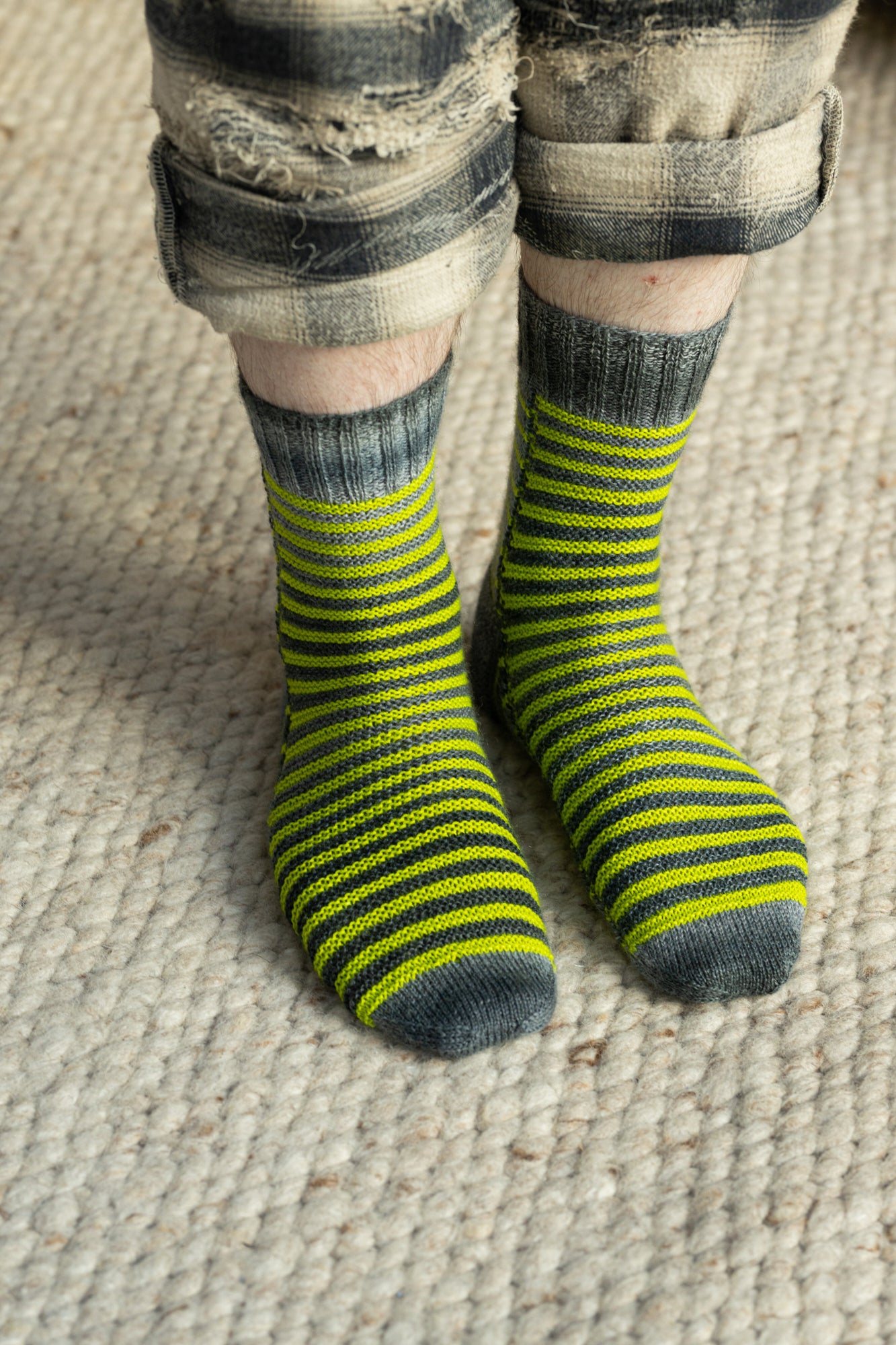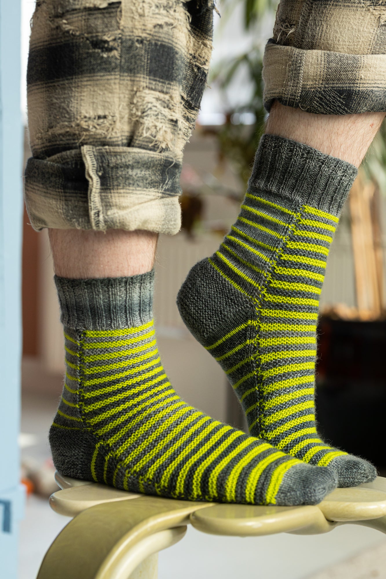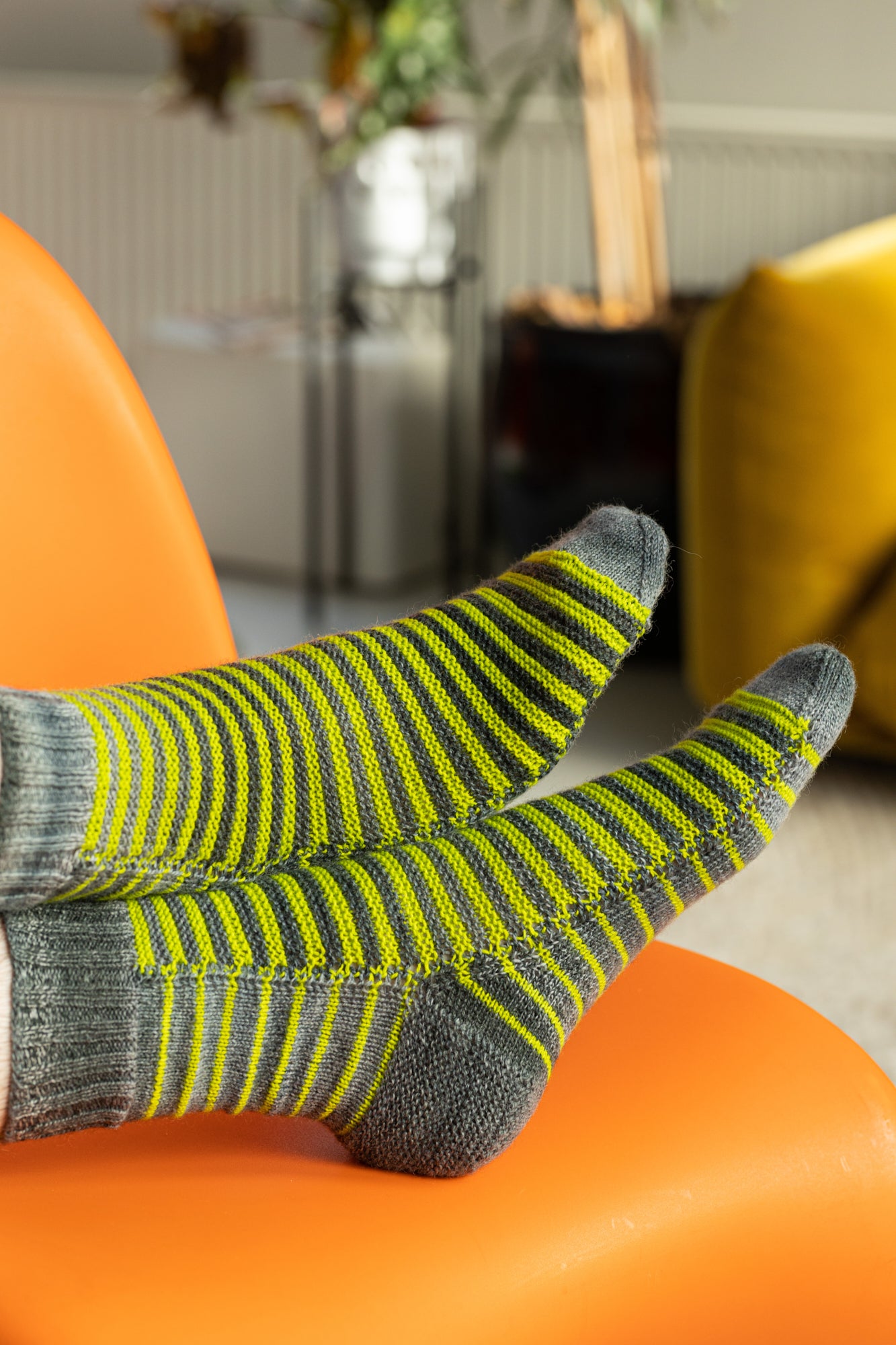 To knit the Stripestep Socks, you can pick a kit featuring one solid colour skein of sock yarn paired with a ball of self-striping sock yarn. The front of the leg and top of the foot are knitted flat in garter stitch stripes. The back of the leg is knitted flat in stockinette stitch, seamlessly joined to the edges of the front leg. A garter stitch heel flap flows into the bottom foot stripes, which are also knitted flat while being attached to the top foot fabric. The different sized stripes create a playful, staggered effect that is simple to knit and striking to wear. Choose your favourite combination and have fun knitting these eye-catching socks!