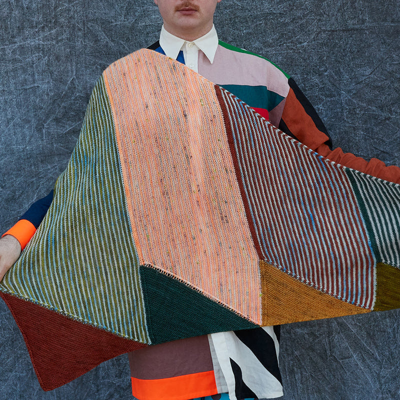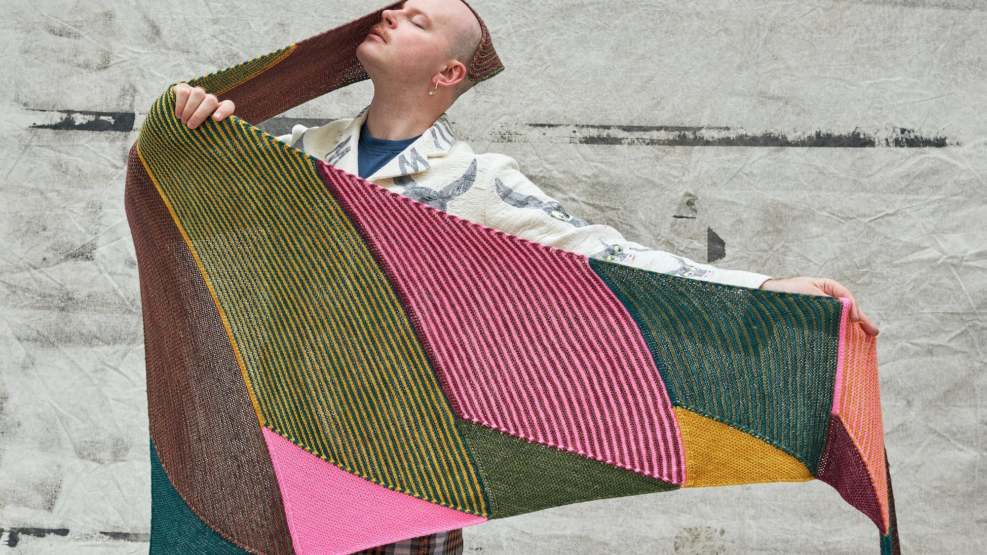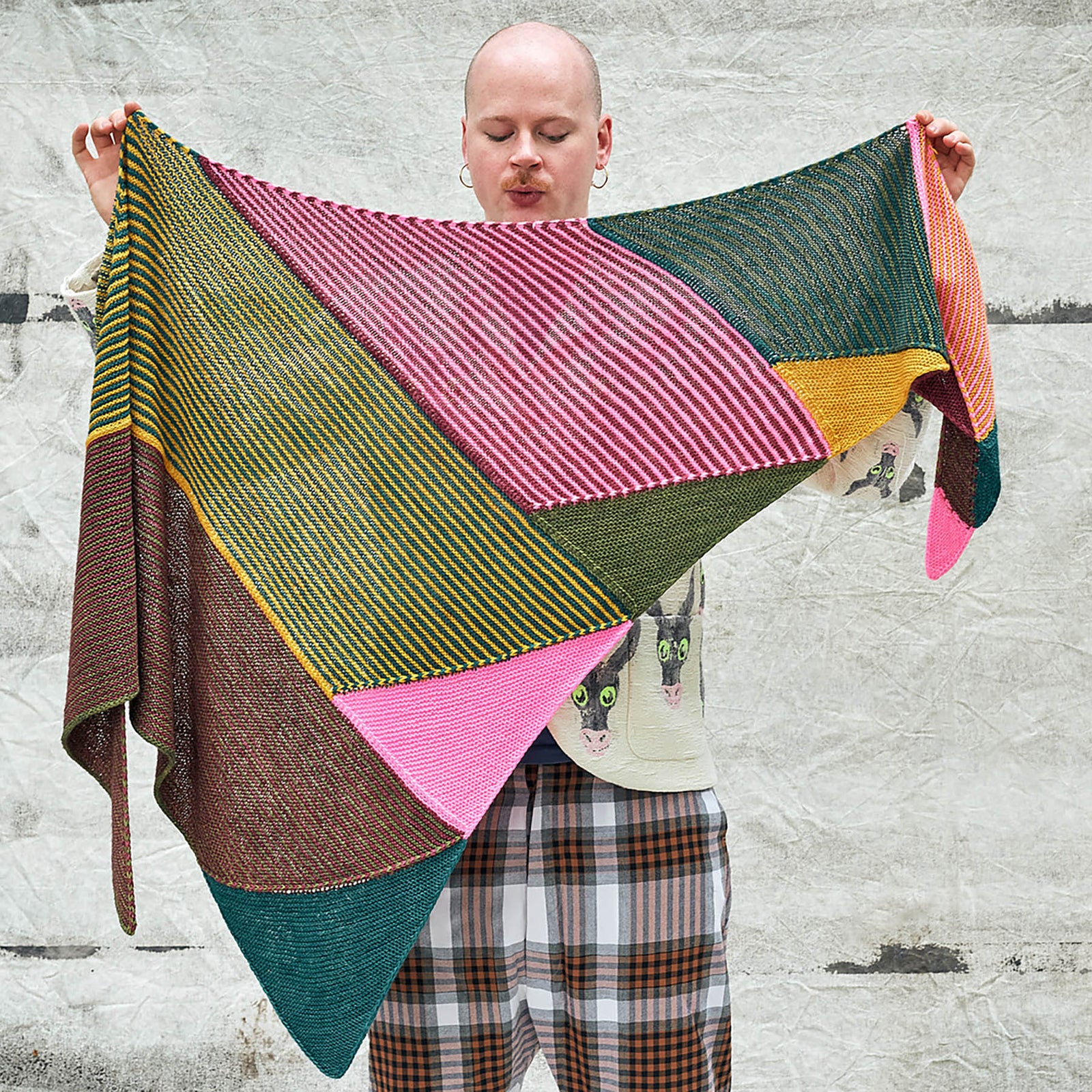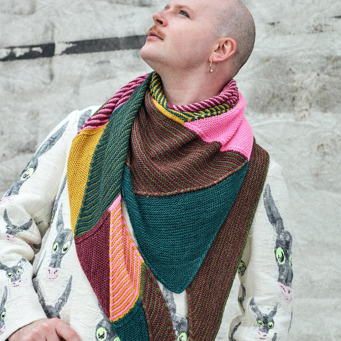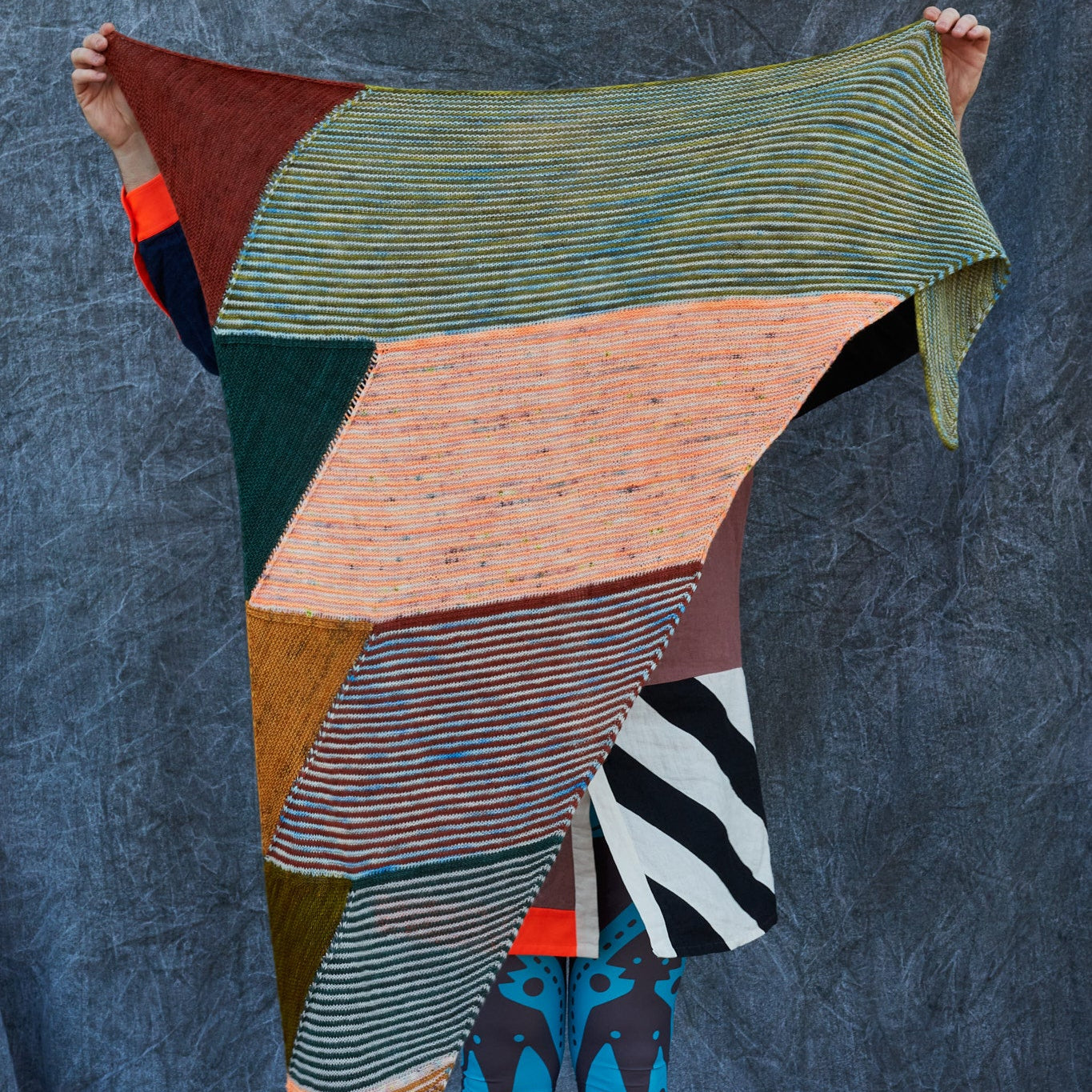 Yarn Requirements:500g fingering weight yarn in five coloursChoose five colours of fingering weight yarn to knit this triangular garter stitch shawl. The sections are knit together with a modular knitting technique. Each shape is framed with I-cord edges as the shapes grow from small to large triangles and parallelograms. The size of this graphic shawl is customisable. You can bind off early after completing any pattern repeat to accommodate various yardage amounts.