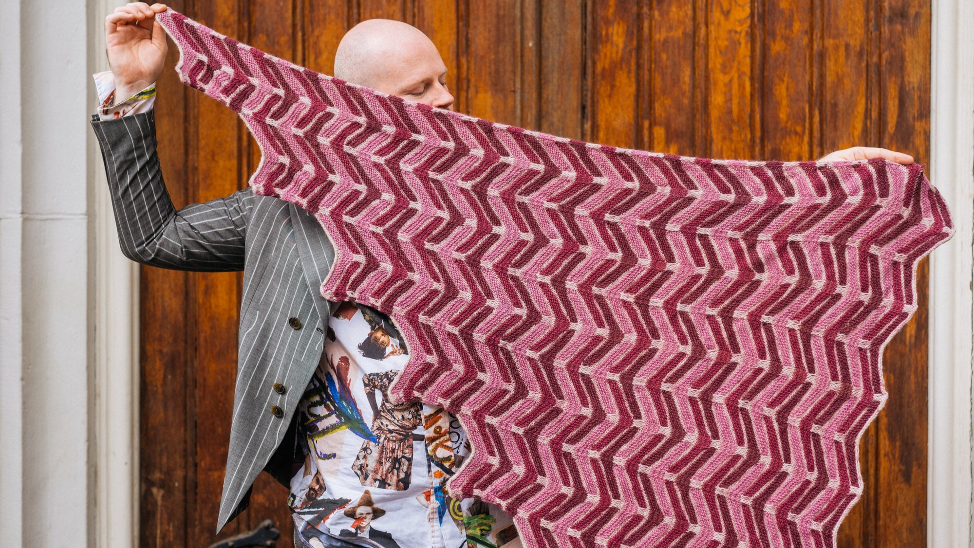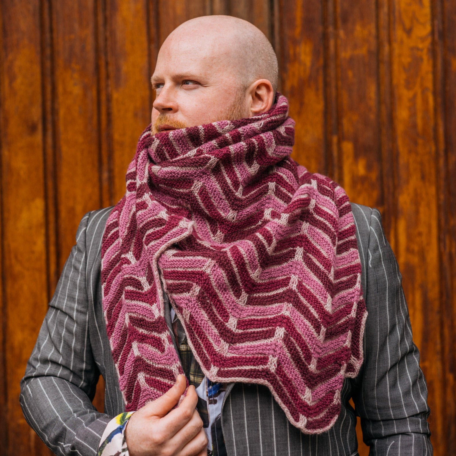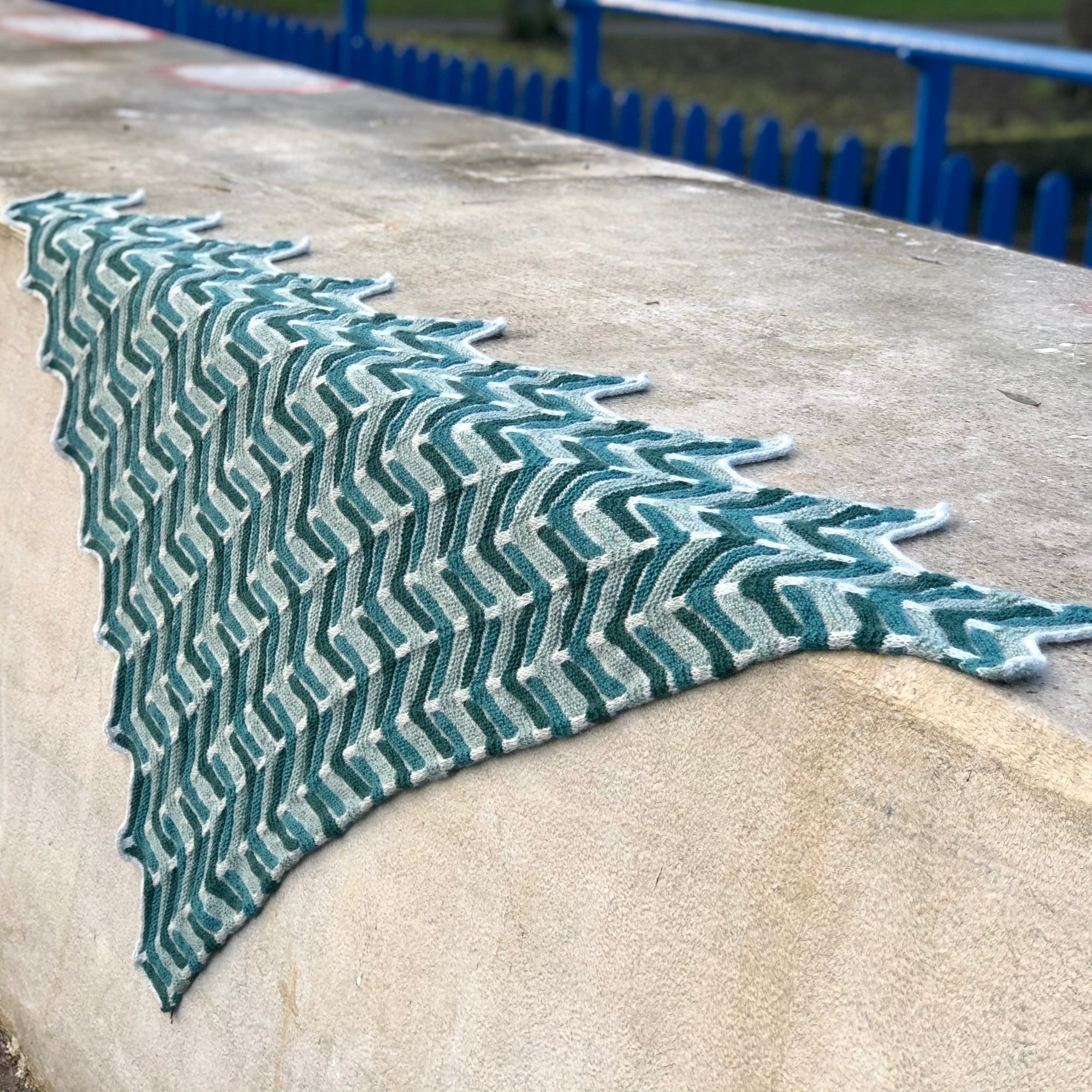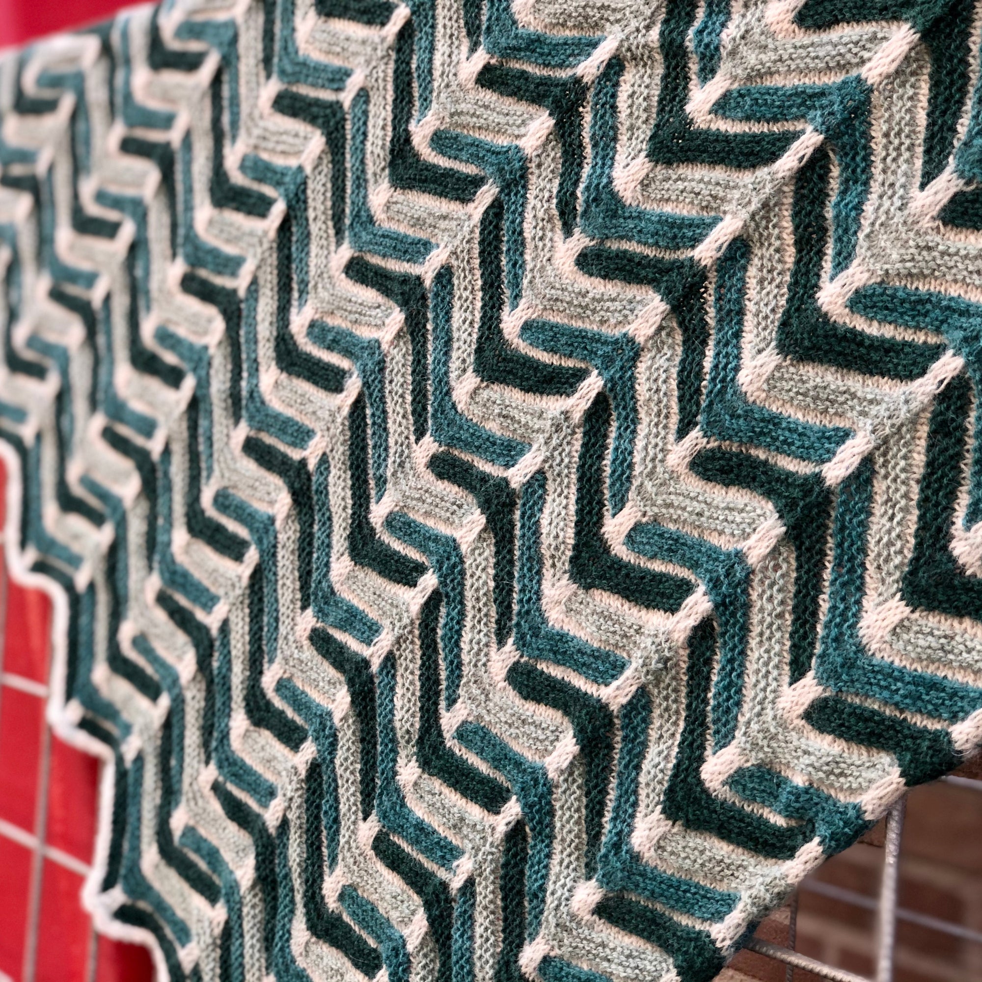 This graphic shawl is knit sideways from the small corner to the wide edge. I-cord edges frame the shape as you increase and decrease with slip stitches. The pattern repeat is easy to memorize once you start knitting and you can make it as big as you want.