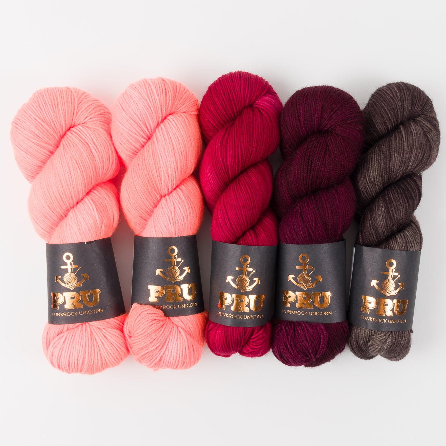 This beautiful Punk Rock Unicorn kit contains five skeins of fingering weight yarn. If you need inspiration, it can be used to knit any of these Westknits shawls.
