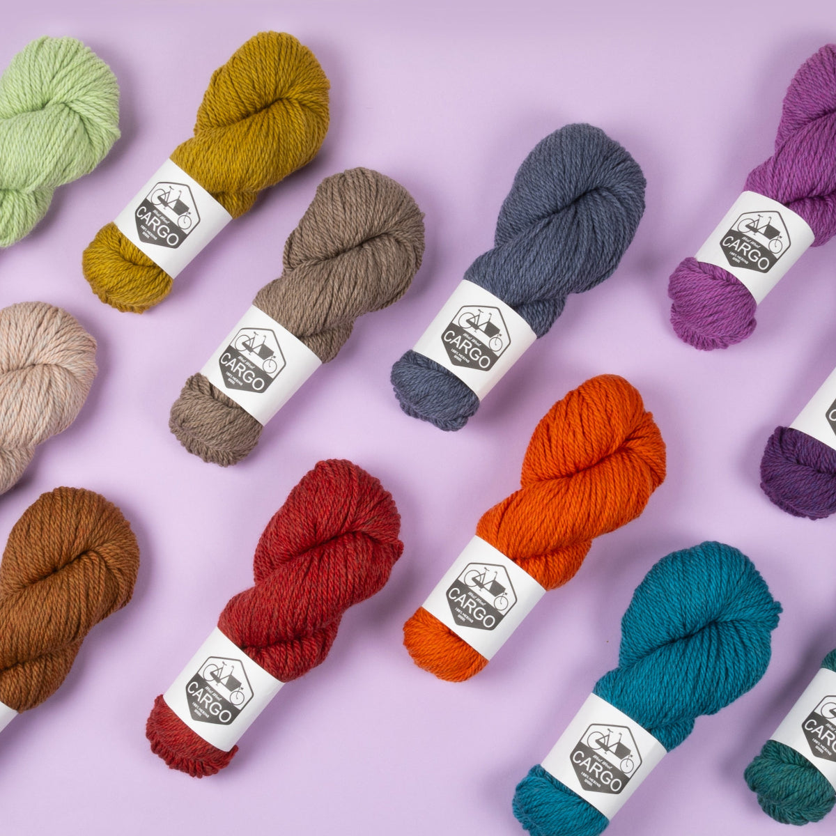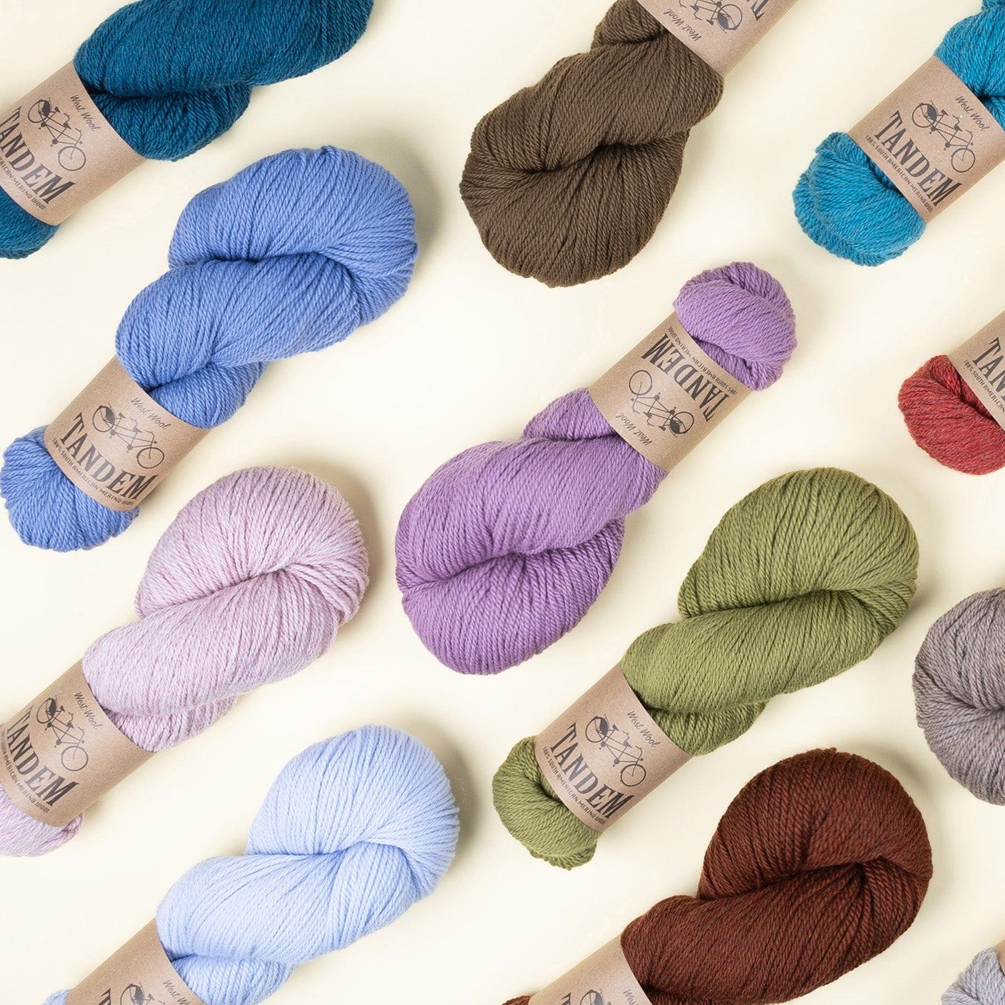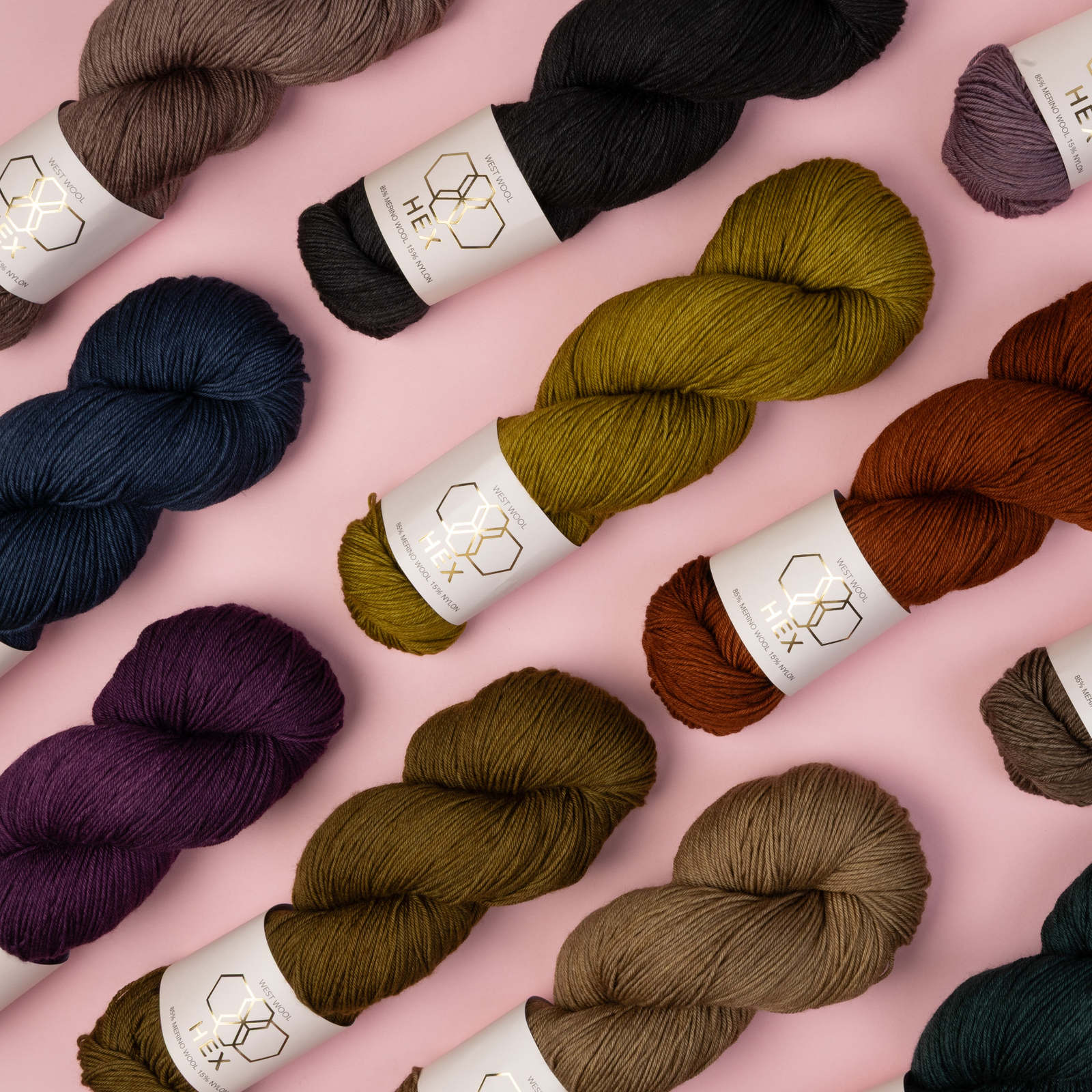 Various skeins of West Wool yarn in bright colours on a lilac background