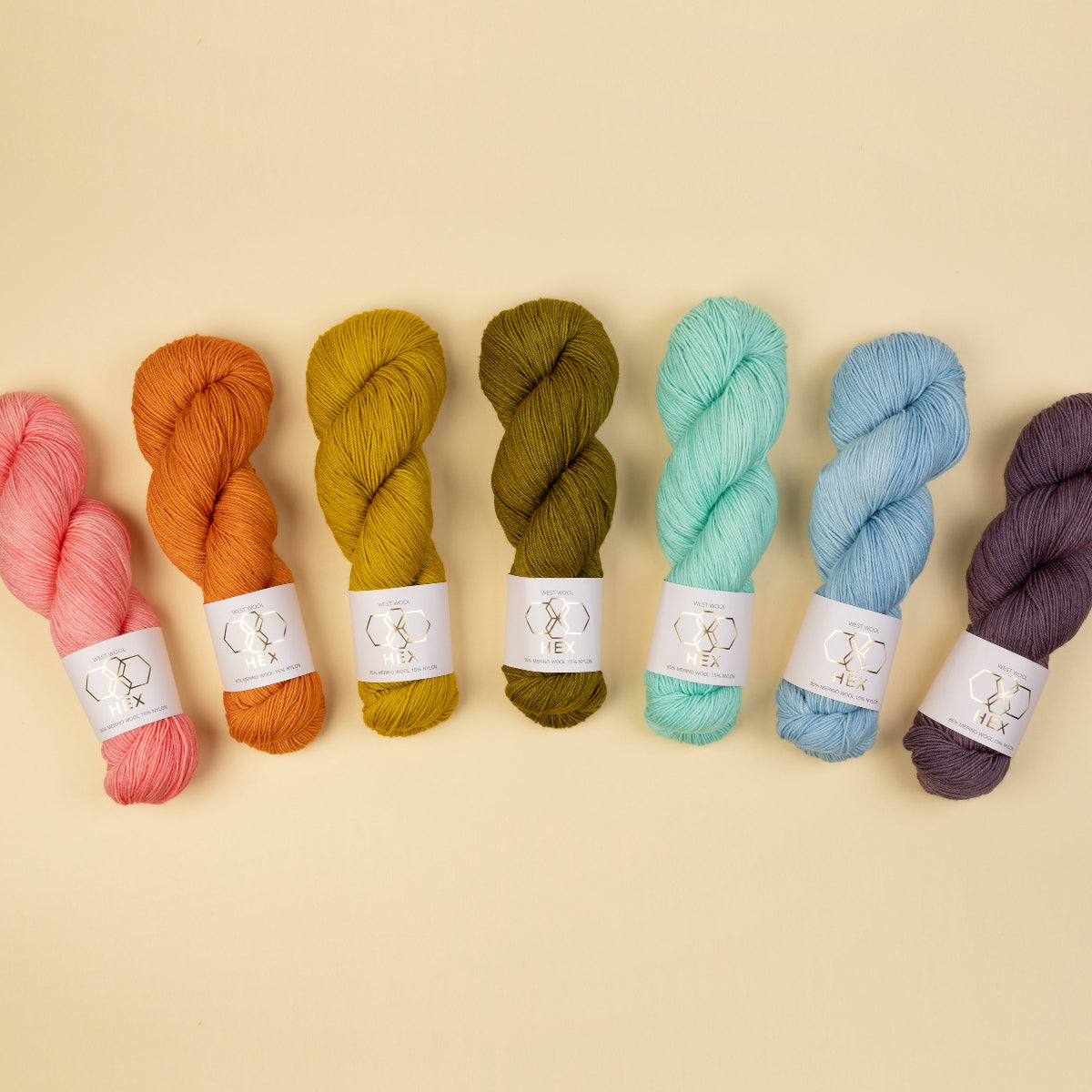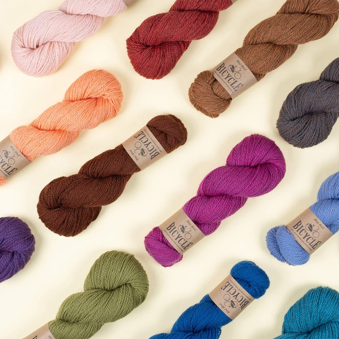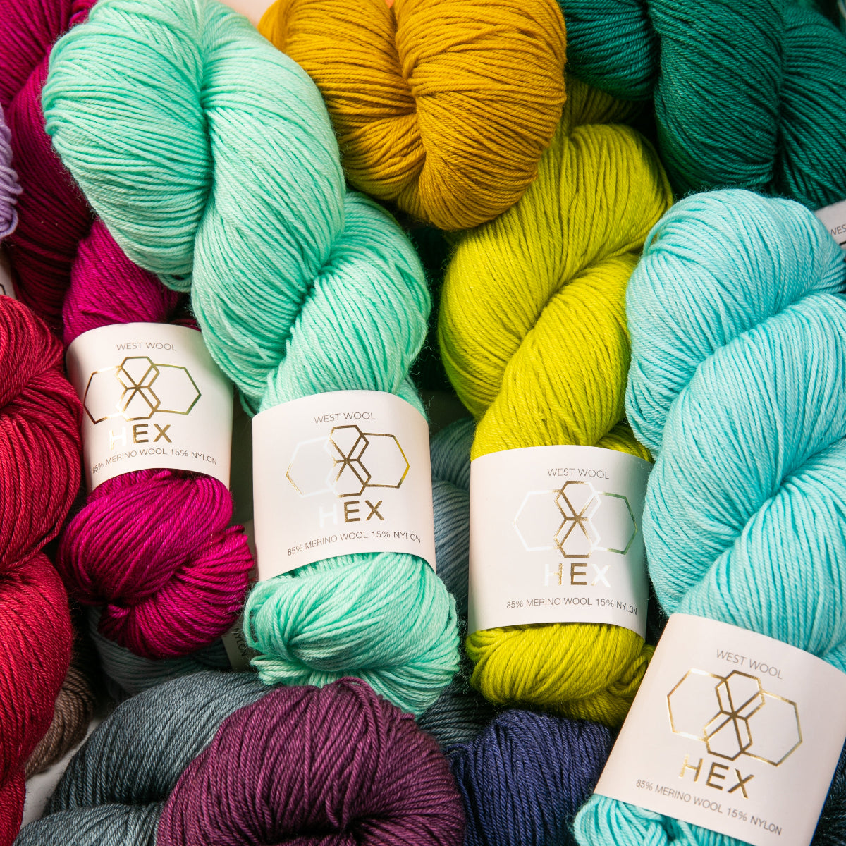 Various skeins of West Wool yarn in bright colours on a lilac background