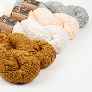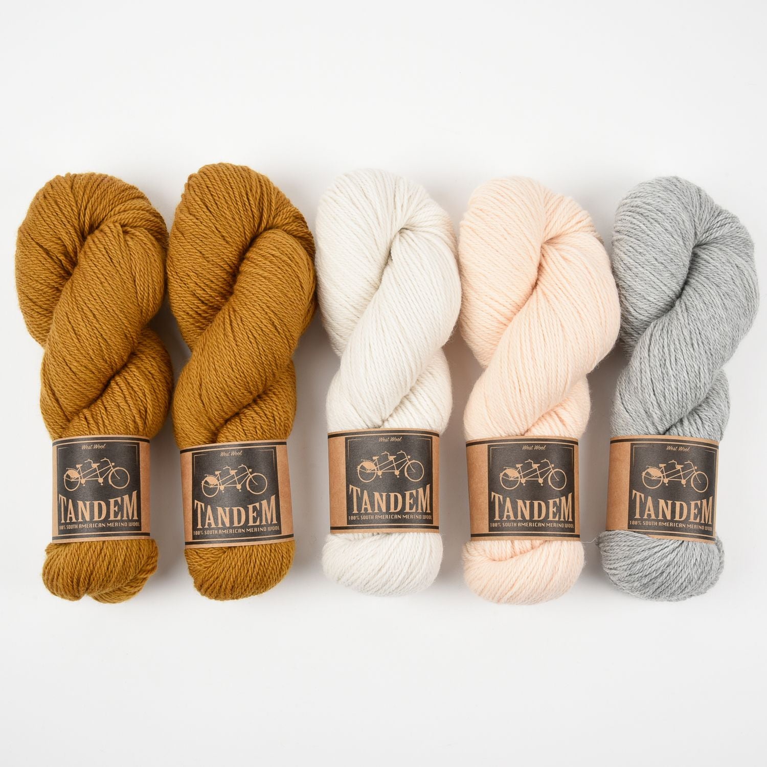 This wonderfully warm kit from West Wool contains five skeins of DK weight yarn. With a main colour and three stunning contrasts, this kit can be used to knit any of these Westknits shawls