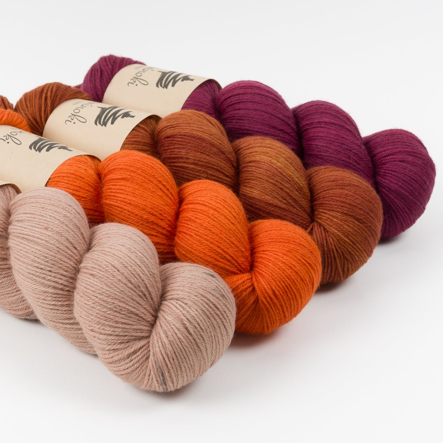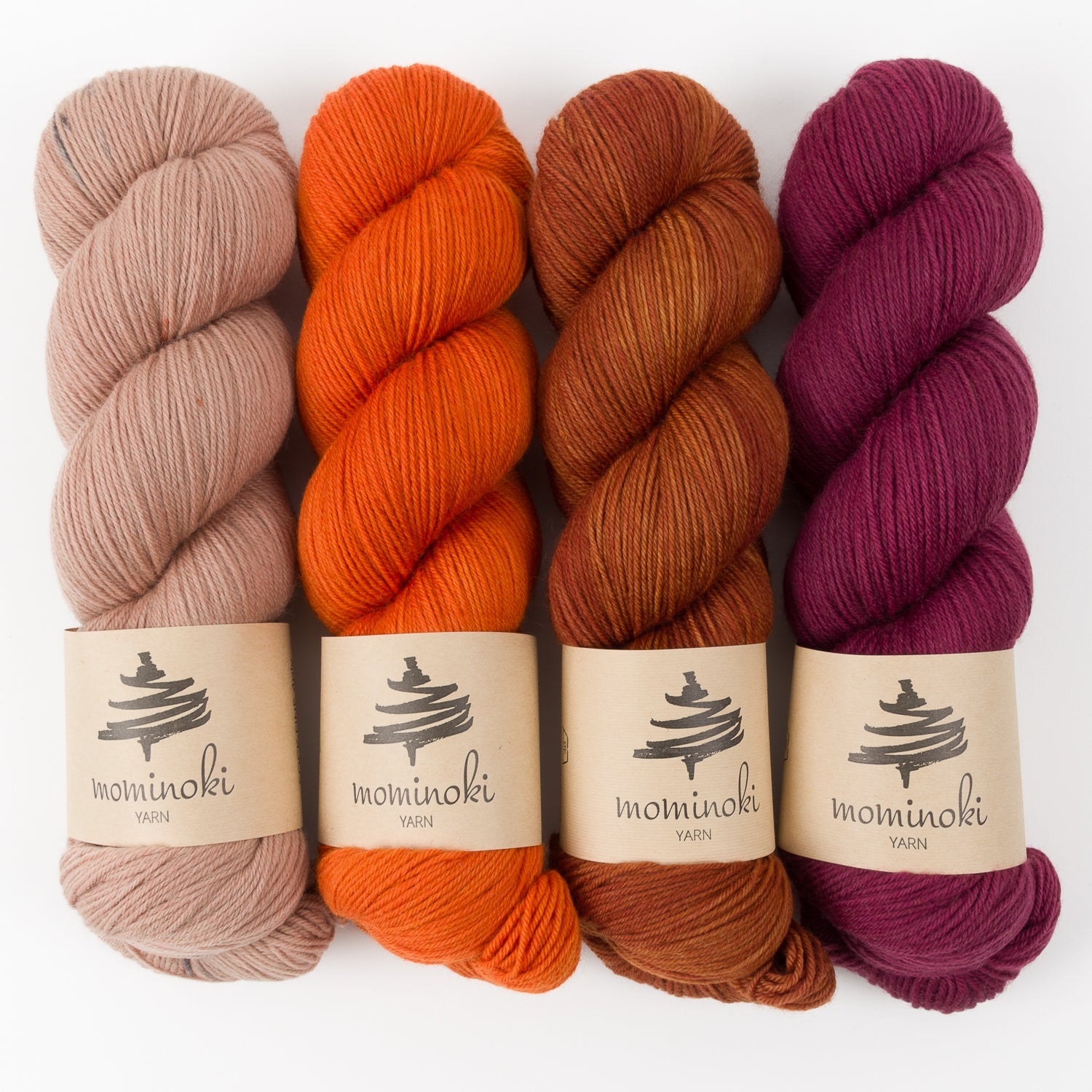 This gorgeous Mominoki Yarn kit contains four skeins of fingering weight yarn. If you need inspiration, it can be used to knit Mautinoa by Malia Mae Joseph or any of these Westknits shawls.