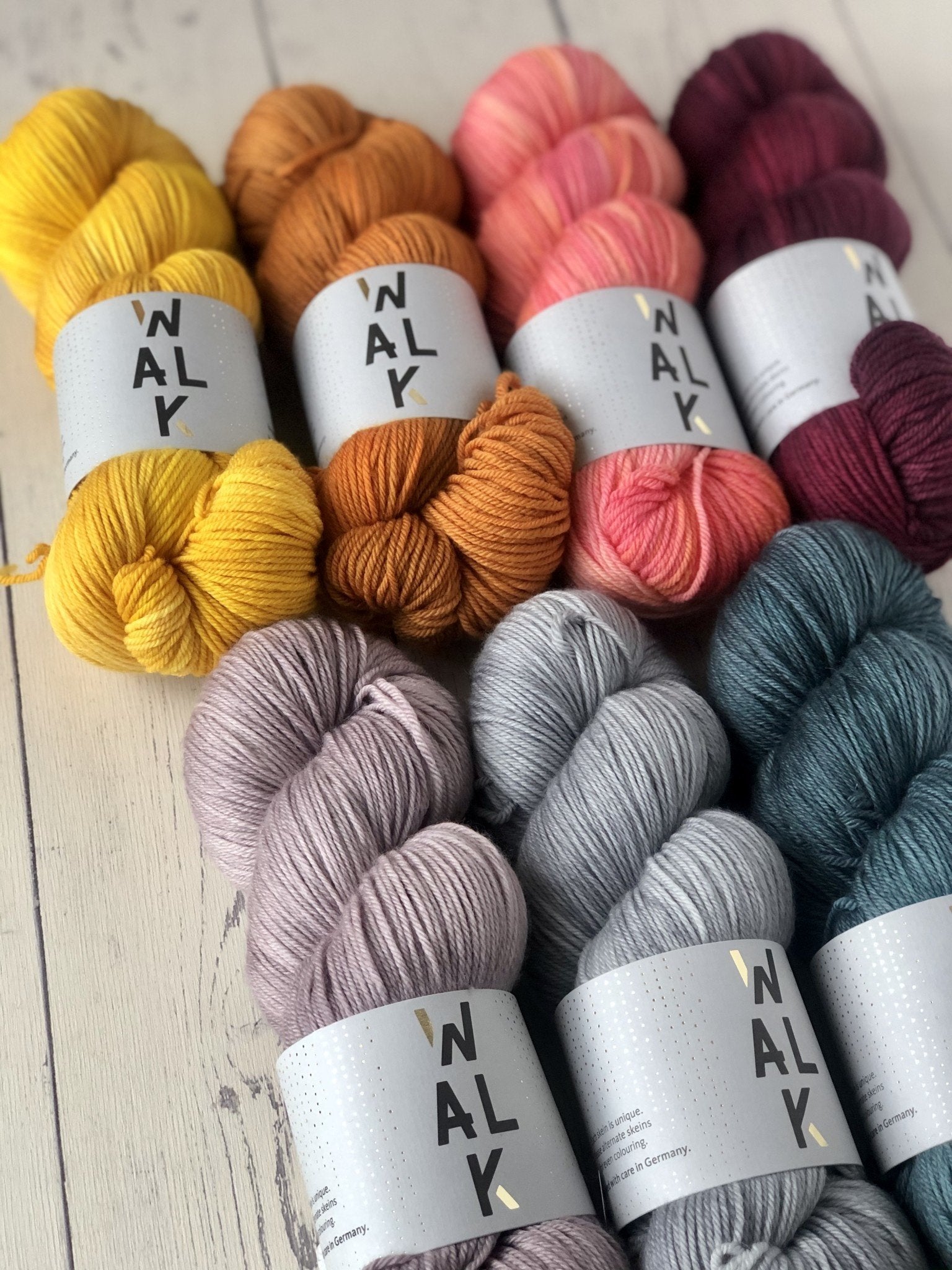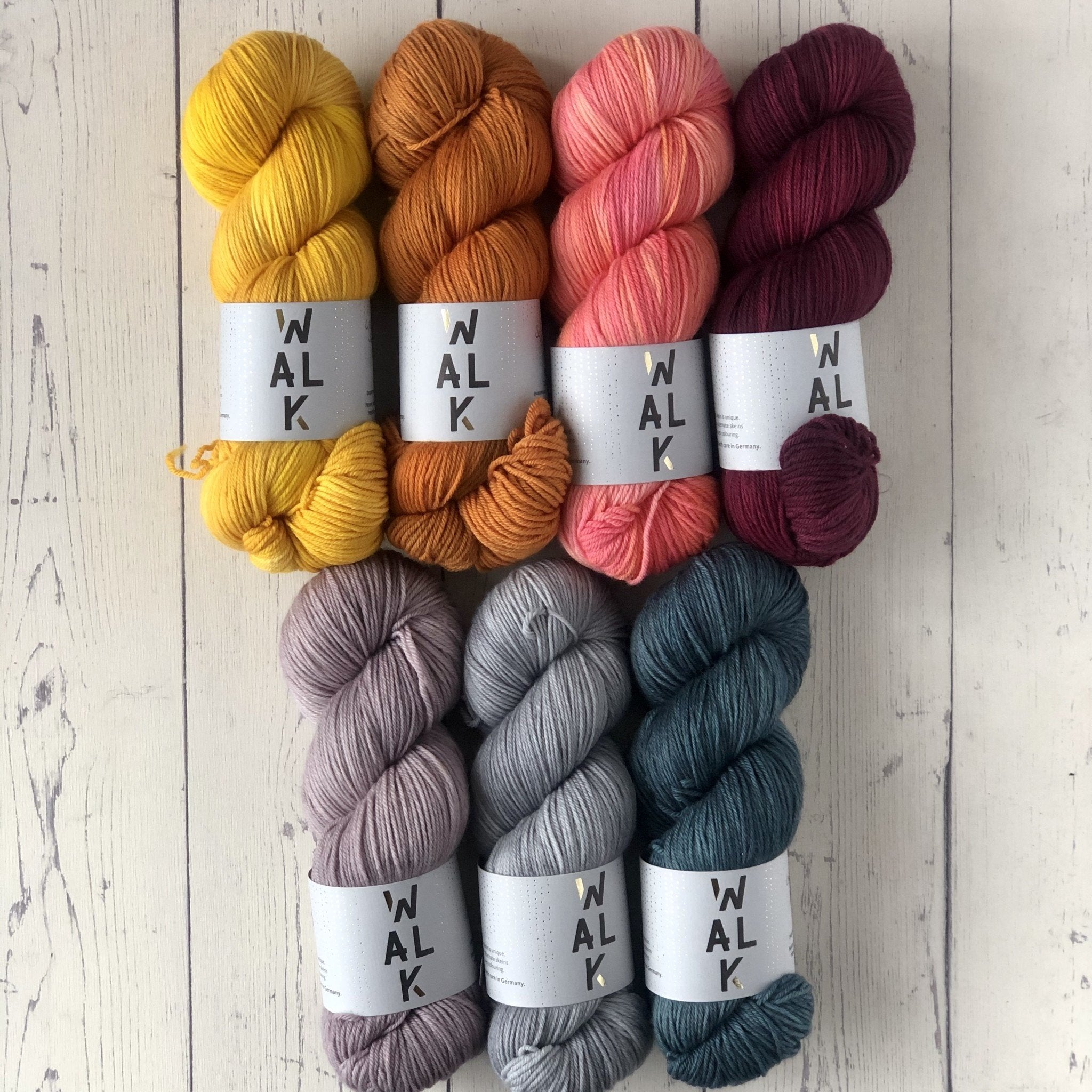 This beautiful WALK Collection kit contains seven different colours of fingering weight yarn that you can use in any order you would like! If you're looking for project inspiration, it will work up for perfectly for Fantastitch or Parallelolamb Shawl by Stephen West or any other seven colour shawl.