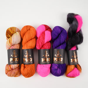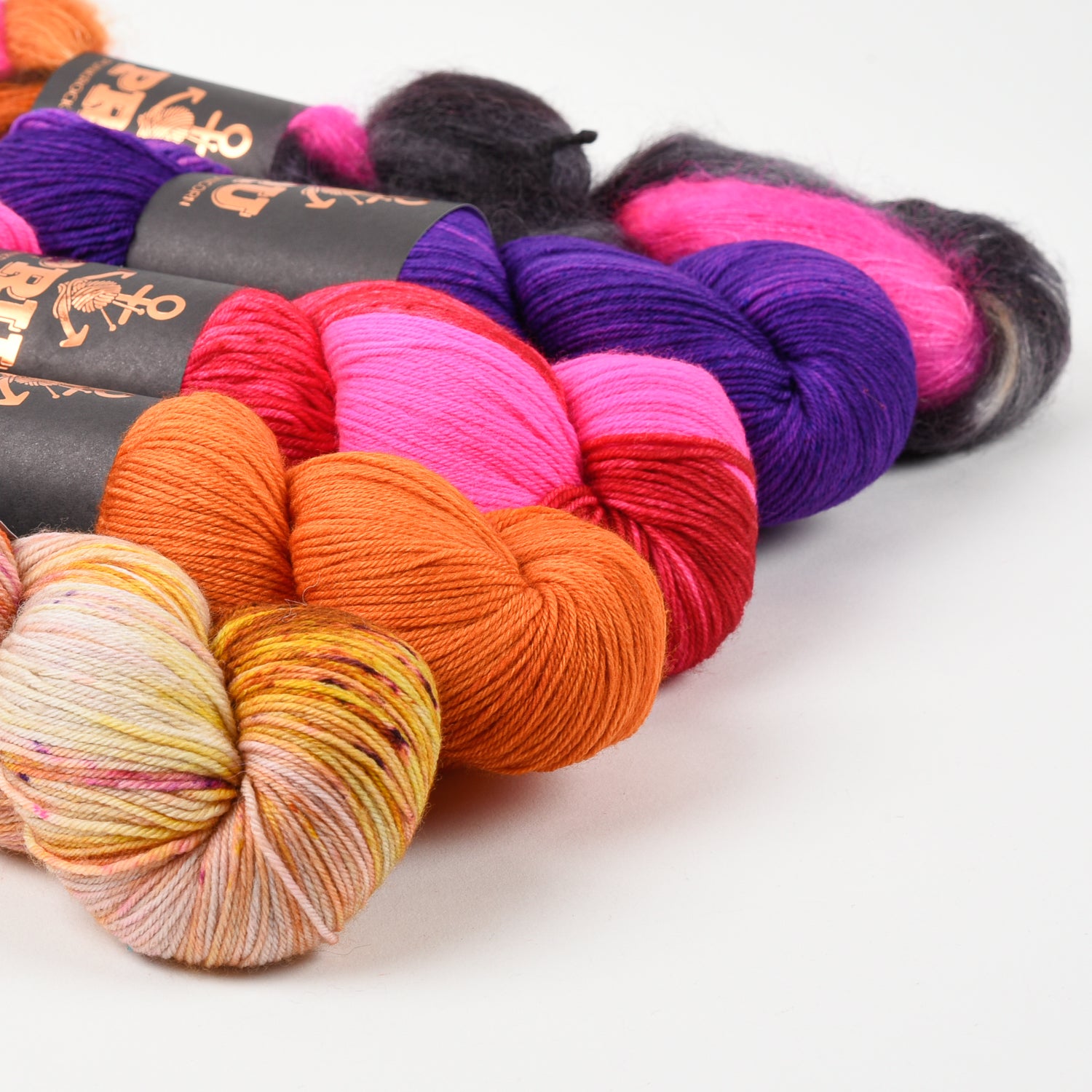 This gorgeous kit contains four hand picked skeins of fingering weight yarn and a fluffy mohair pop from Punk Rock Unicorn that you can use in any order you want. If you need inspiration, this yarn can be used to knit any of these Westknits Shawls.