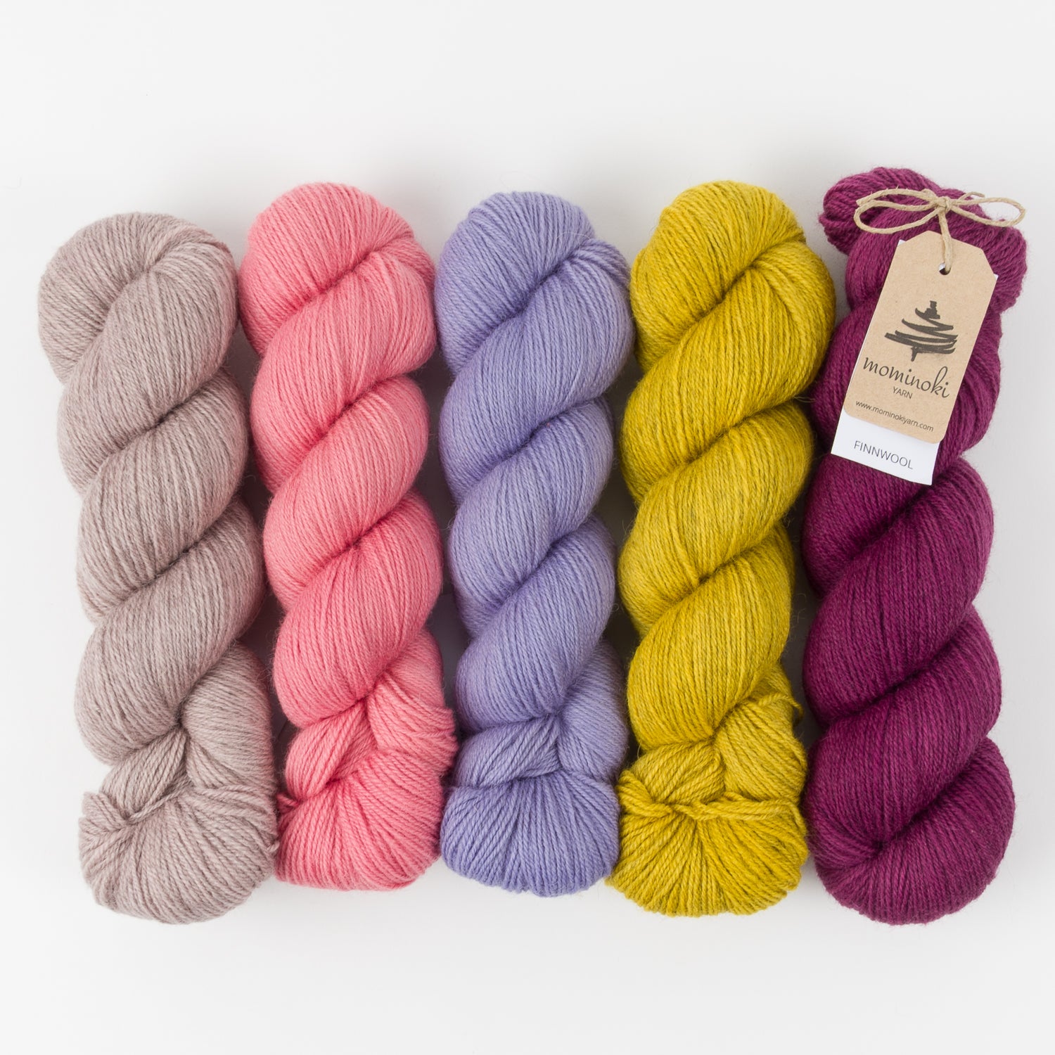 This beautifulMominoki Yarn kit contains five skeins of fingering weight yarn. If you need inspiration, it can be used to knit any of these Westknits shawls