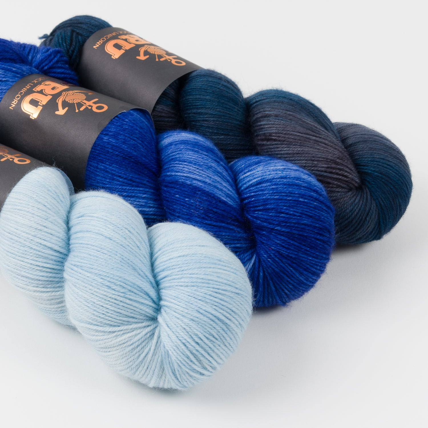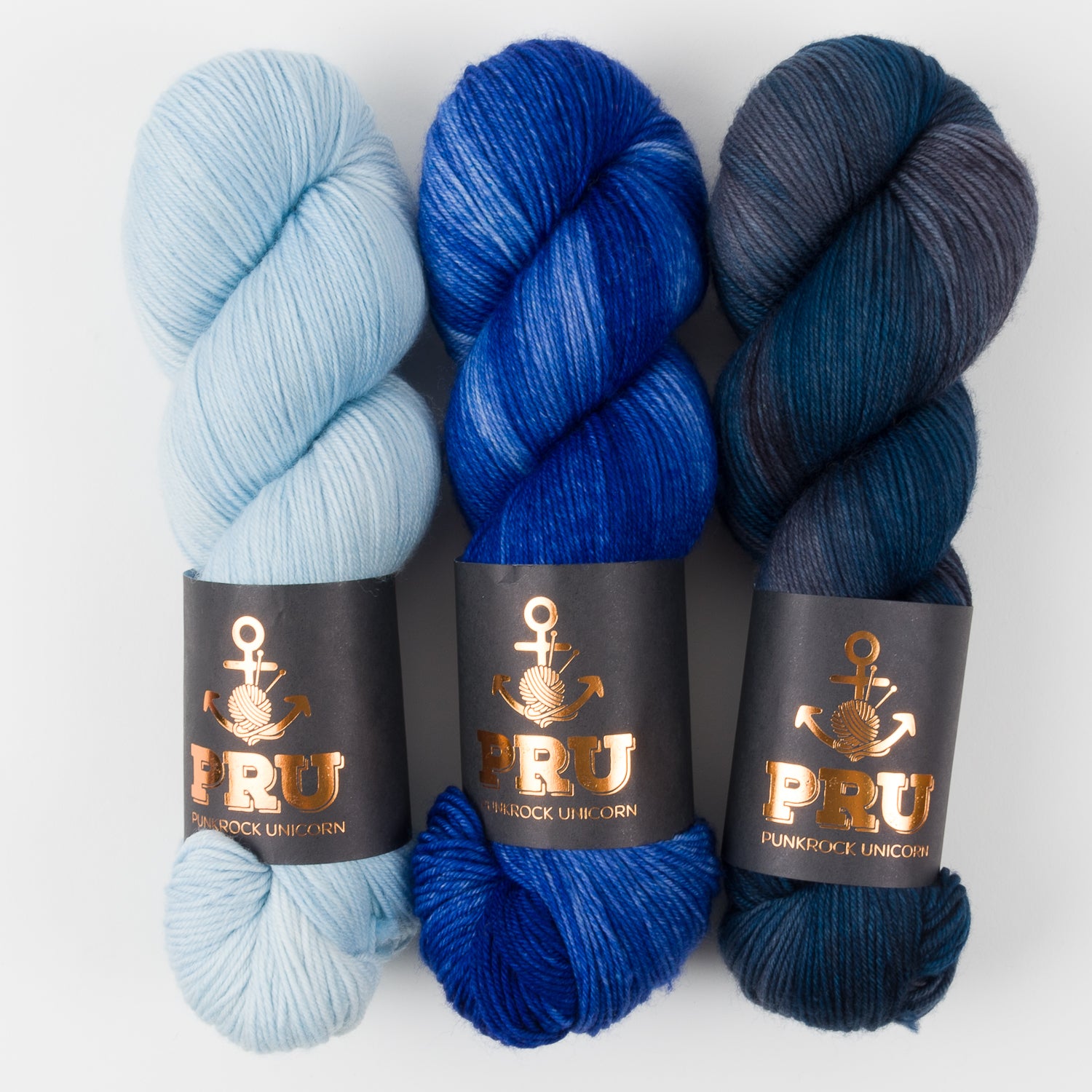 This gorgeous kit from Punk Rock Unicorn contains three skeins of fingering weight yarn. If you need inspiration, it can be used to knit any of these Westknits shawls