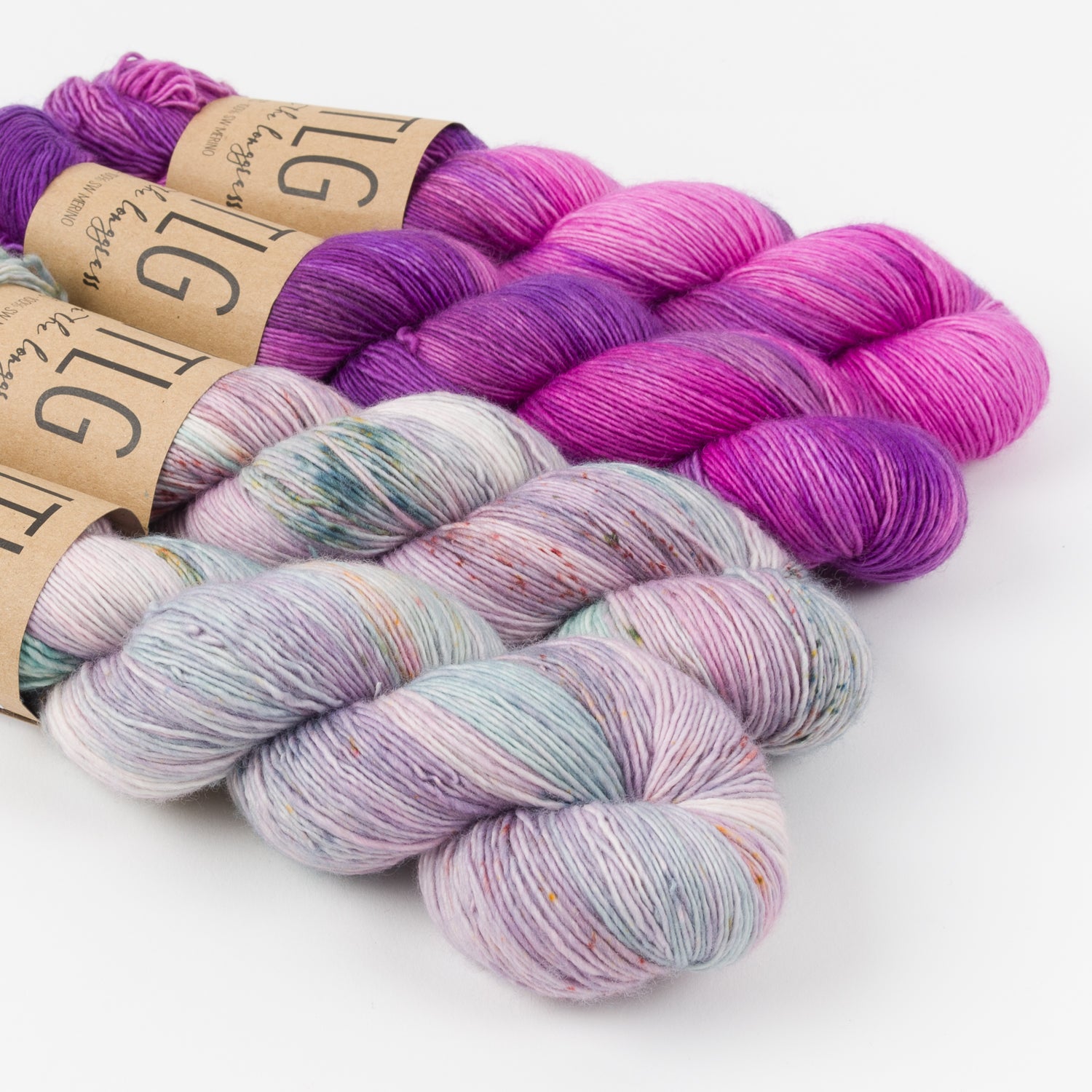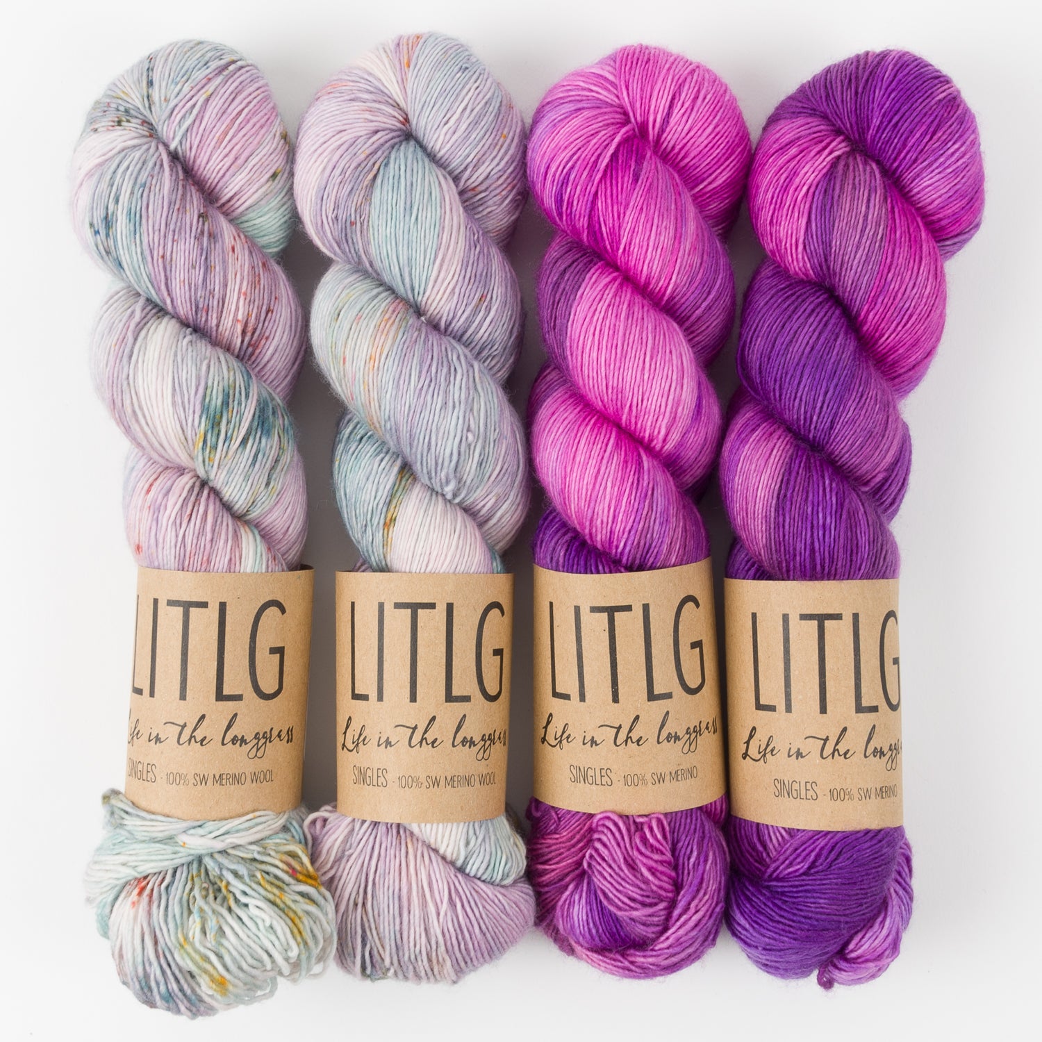 This beautiful Life in The Long Grass kit contains four skeins of fingering weight yarn. If you're looking for project inspiration, it will work up perfectly for any of these Westknits shawls.