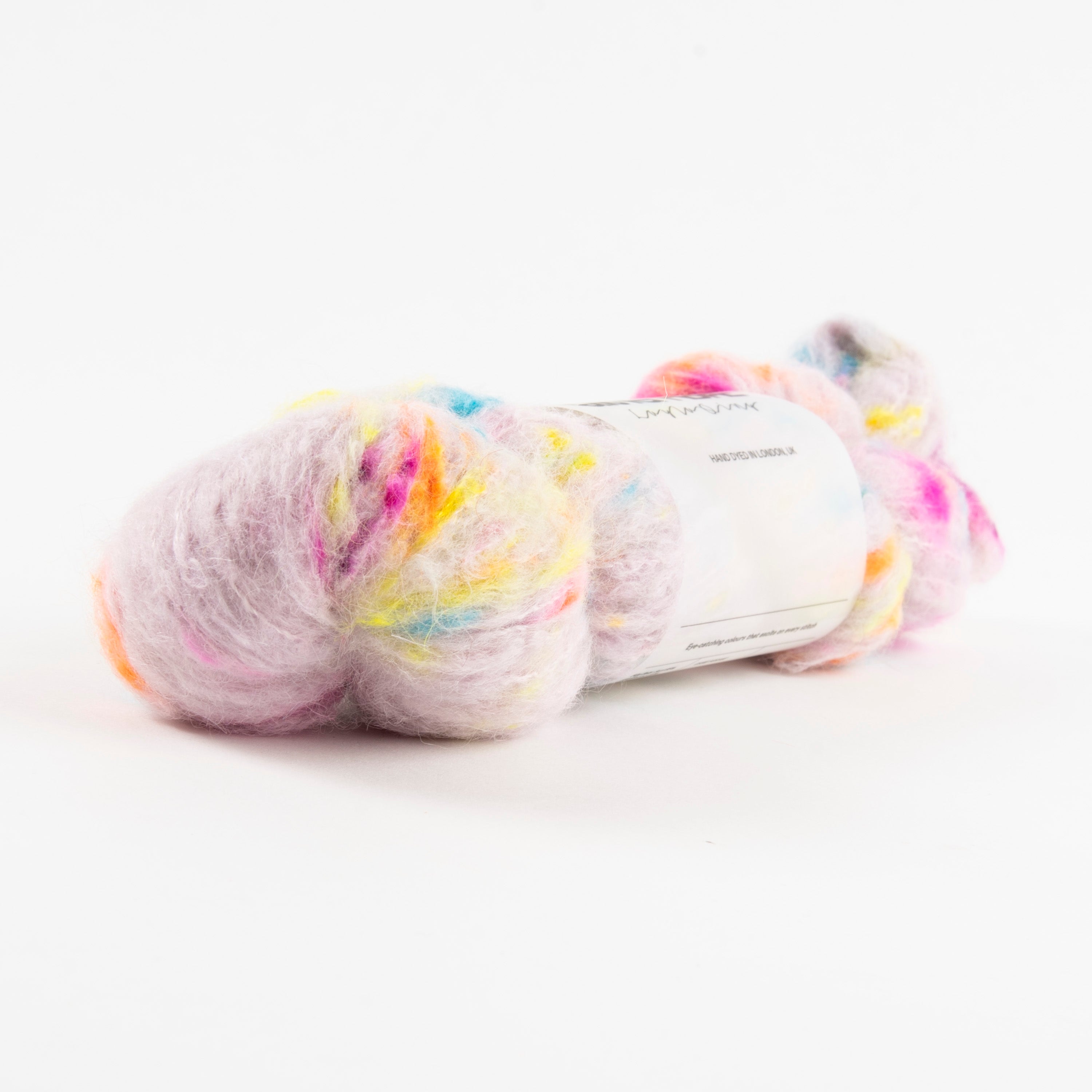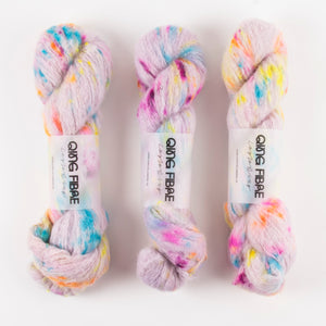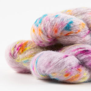 Qing Fibre’s Melted Baby Suri is a fluffy blend of Baby Suri Alpaca, Merino, and Silk. Perfect for cloudy soft garments and accessories.