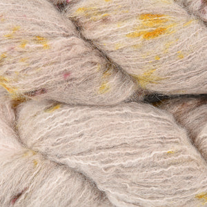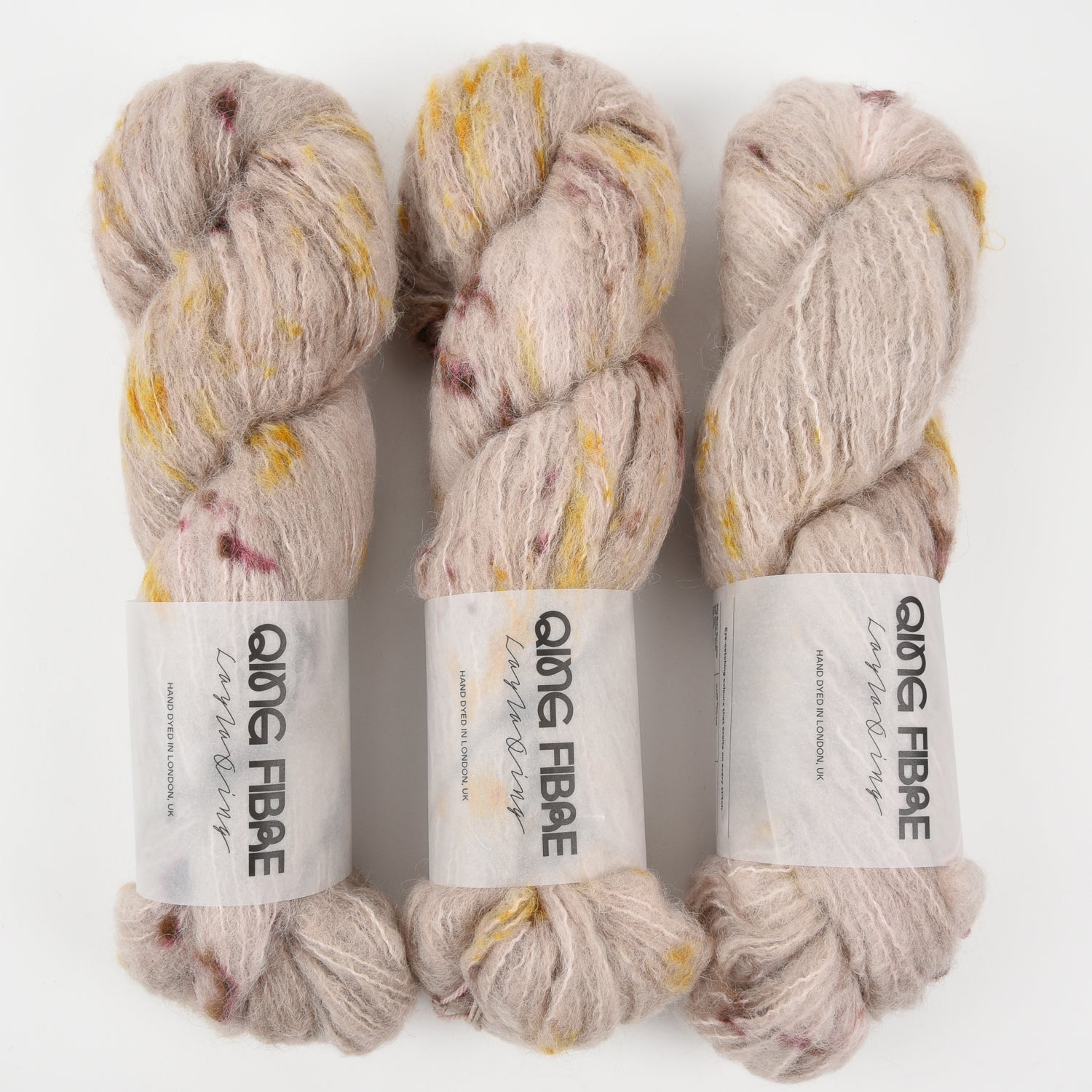 Qing Fibre’s Melted Baby Suri is a fluffy blend of Baby Suri Alpaca, Merino, and Silk. Perfect for cloudy soft garments and accessories.
