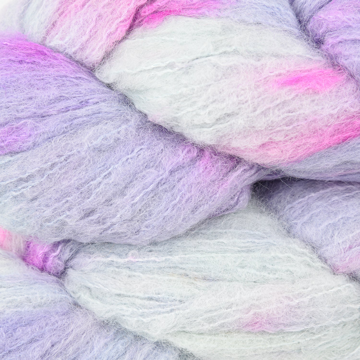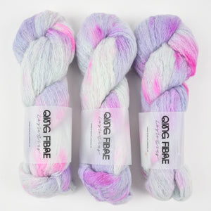 Qing Fibre’s Melted Baby Suri is a fluffy blend of Baby Suri Alpaca, Merino, and Silk. Perfect for cloudy soft garments and accessories.