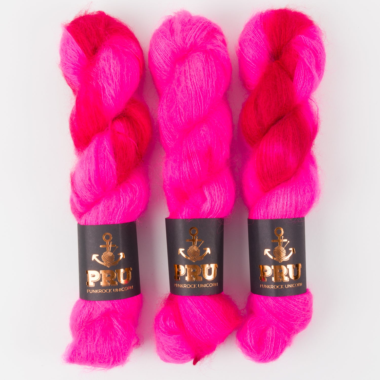 This lace weight yarn from Punk Rock Unicorn is ideal for dream like floating fabrics or adding a fun textural pop when held together with other yarns.