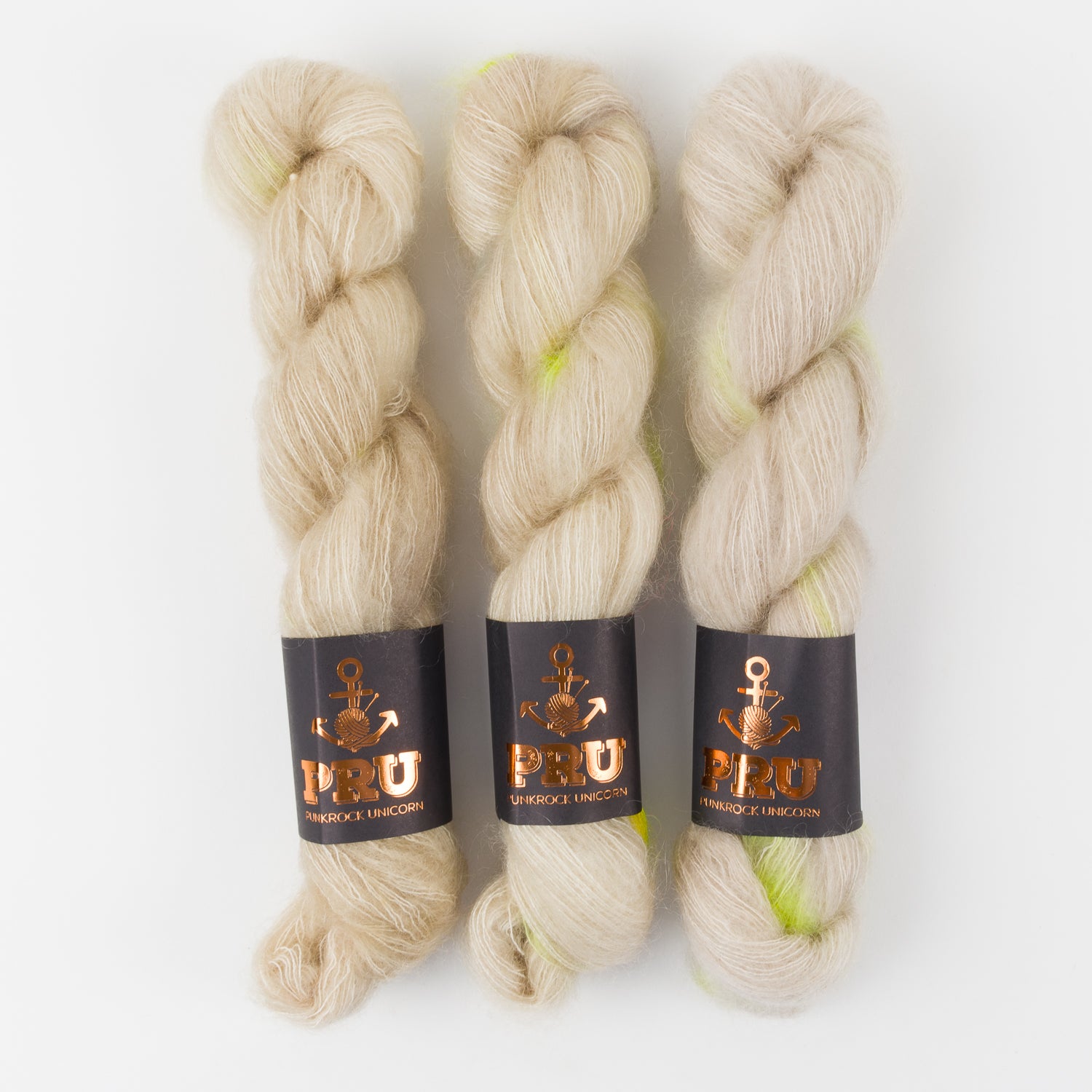 This lace weight yarn from Punk Rock Unicorn is ideal for dream like floating fabrics or adding a fun textural pop when held together with other yarns.
