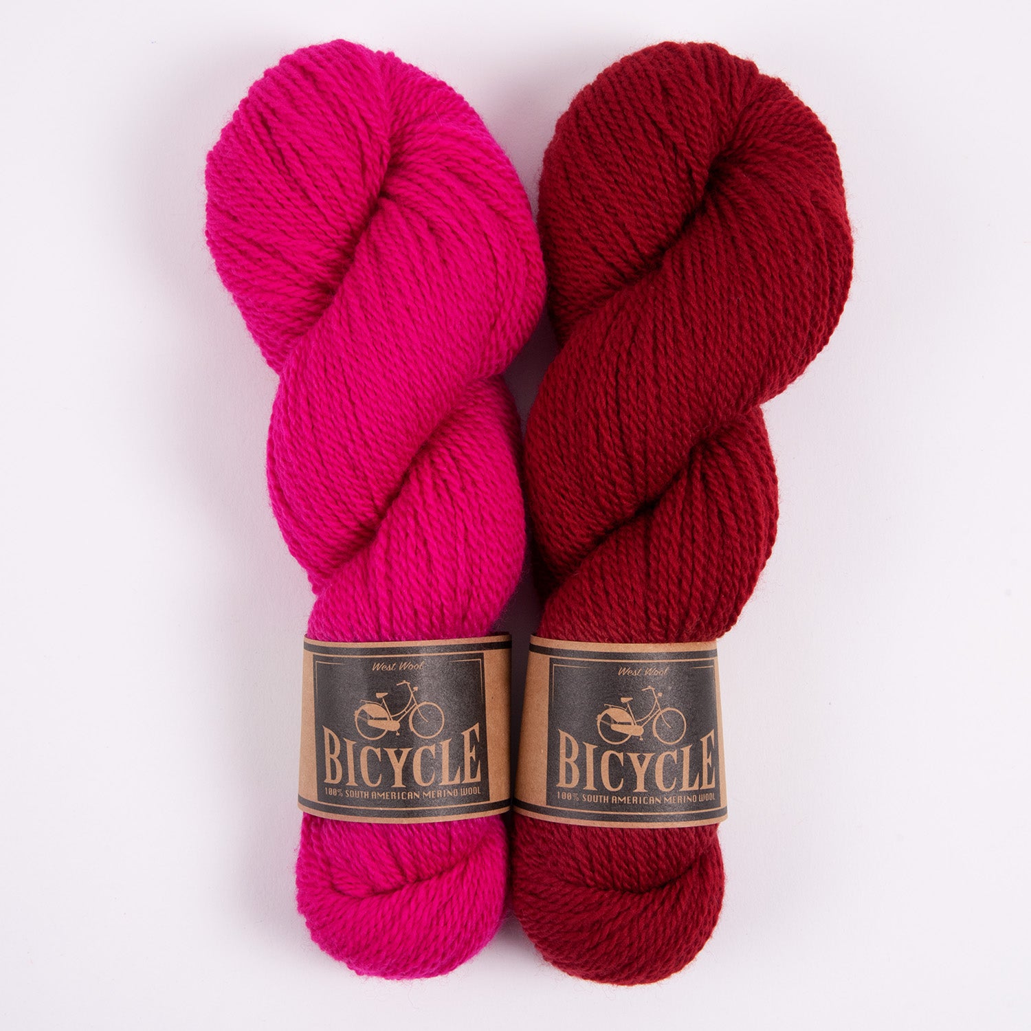 This kit comes with West Wool Bicycle in Fucshia and Berry and a Westknits Pattern Download Code.