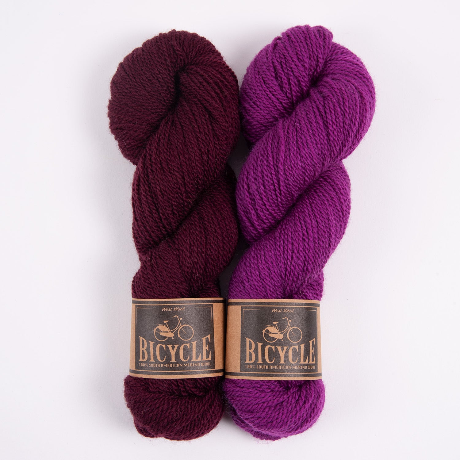 This kit comes with West Wool Bicycle in Corduroy and Fandango and a Westknits Pattern Download Code.