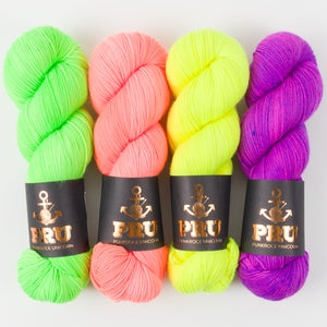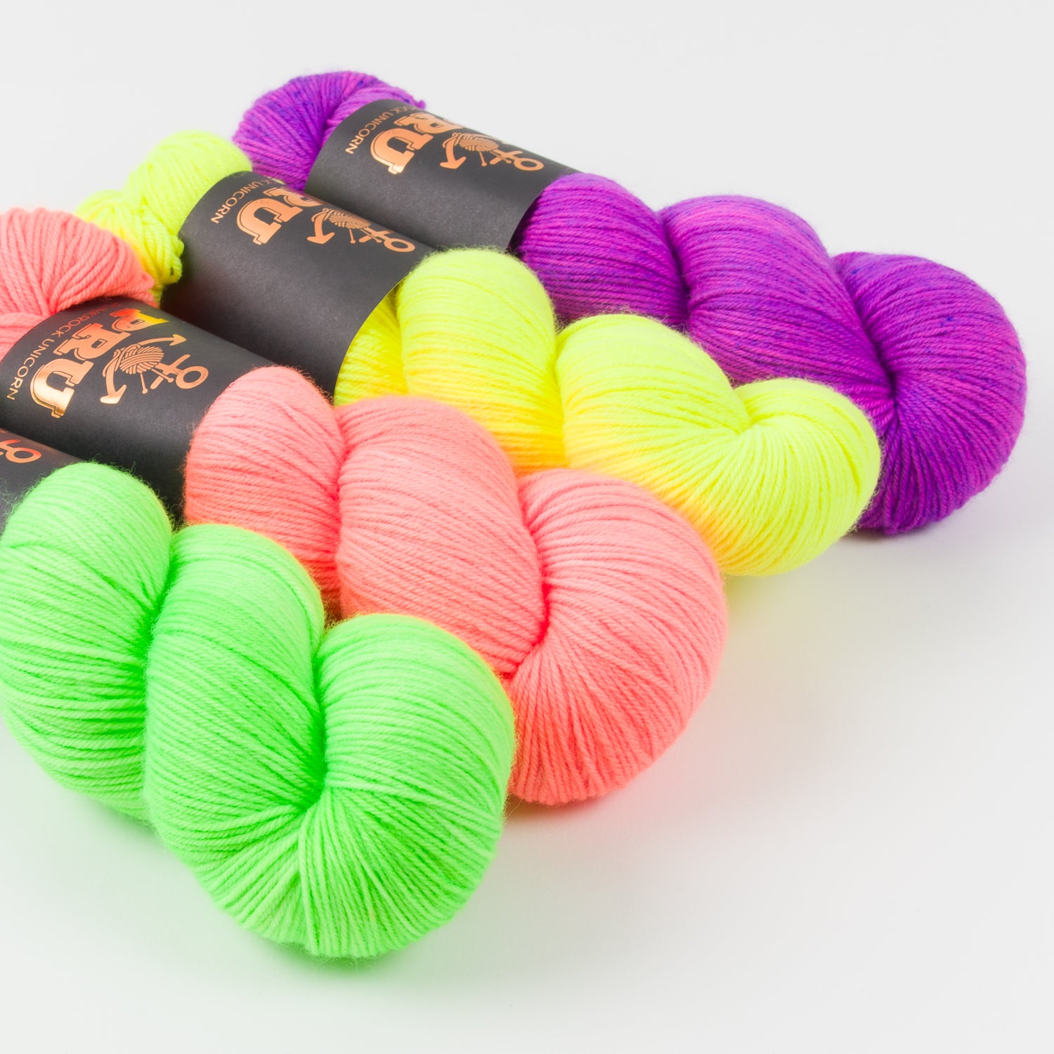This gorgeous Punk Rock Unicorn kit contains four skeins of fingering weight yarn. If you need inspiration, it will work up perfectly for Mautinoa by Malia Mae Joseph, or any of these Westknits shawls.