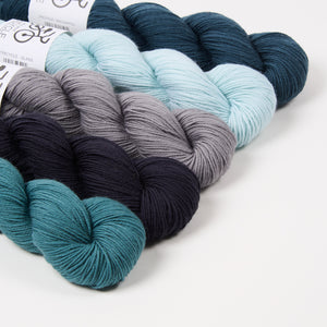 This beautiful West Wool kit contains ten skeins of fingering weight yarn. If you're looking for project inspiration, it will work up perfectly for any of these Westknits shawls.