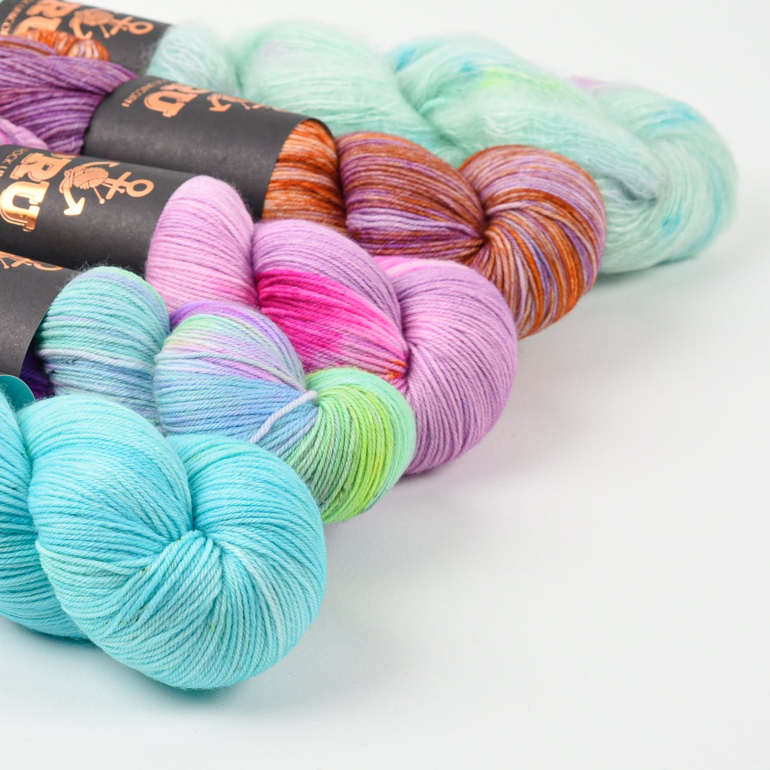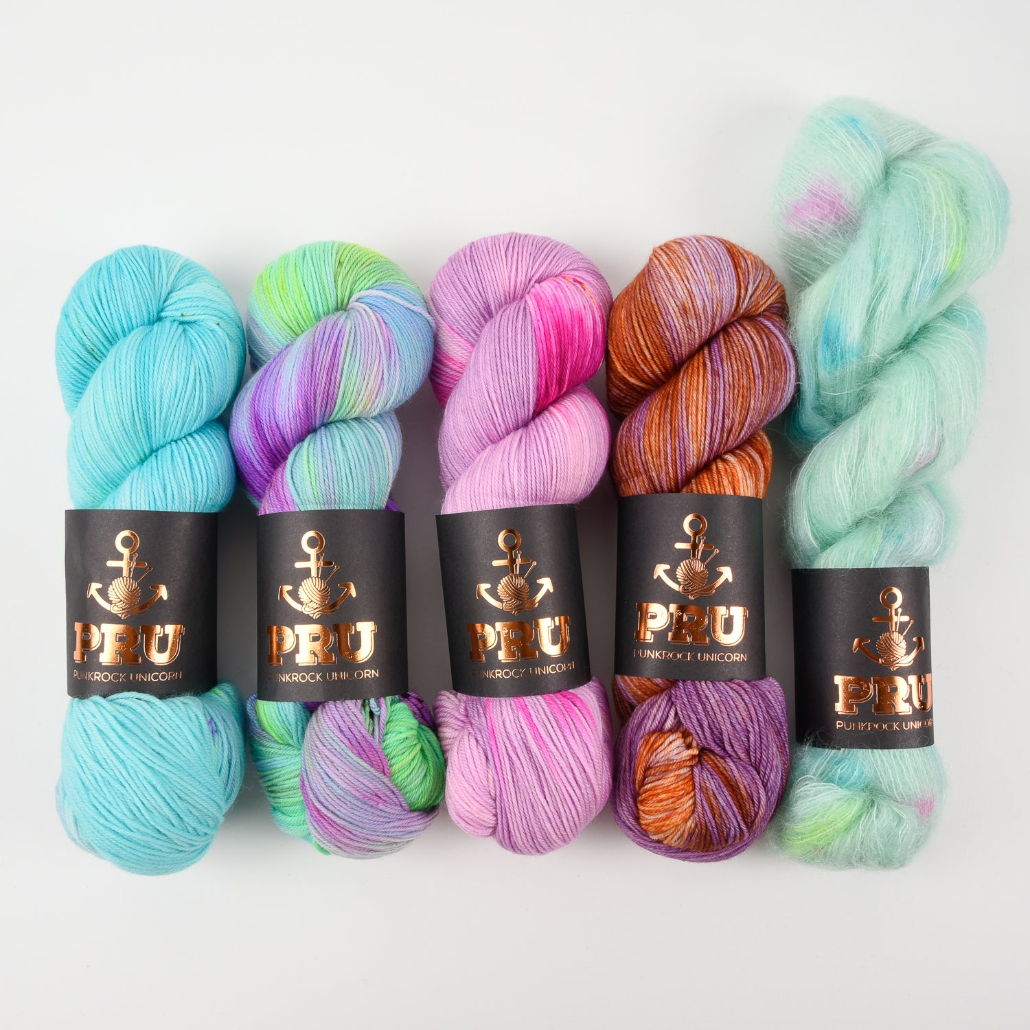 This gorgeous kit contains four hand picked skeins of fingering weight yarn and a fluffy mohair pop from Punk Rock Unicorn that you can use in any order you want. If you need inspiration, this yarn can be used to knit any of these Westknits Shawls.