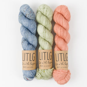 This gorgeous kit from Life in The Long Grass contains three skeins of fingering weight yarn in two beautiful colours. If you need some inspiration, they can be used to knit any of these Westknits shawls