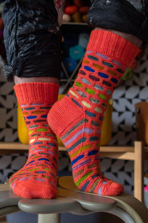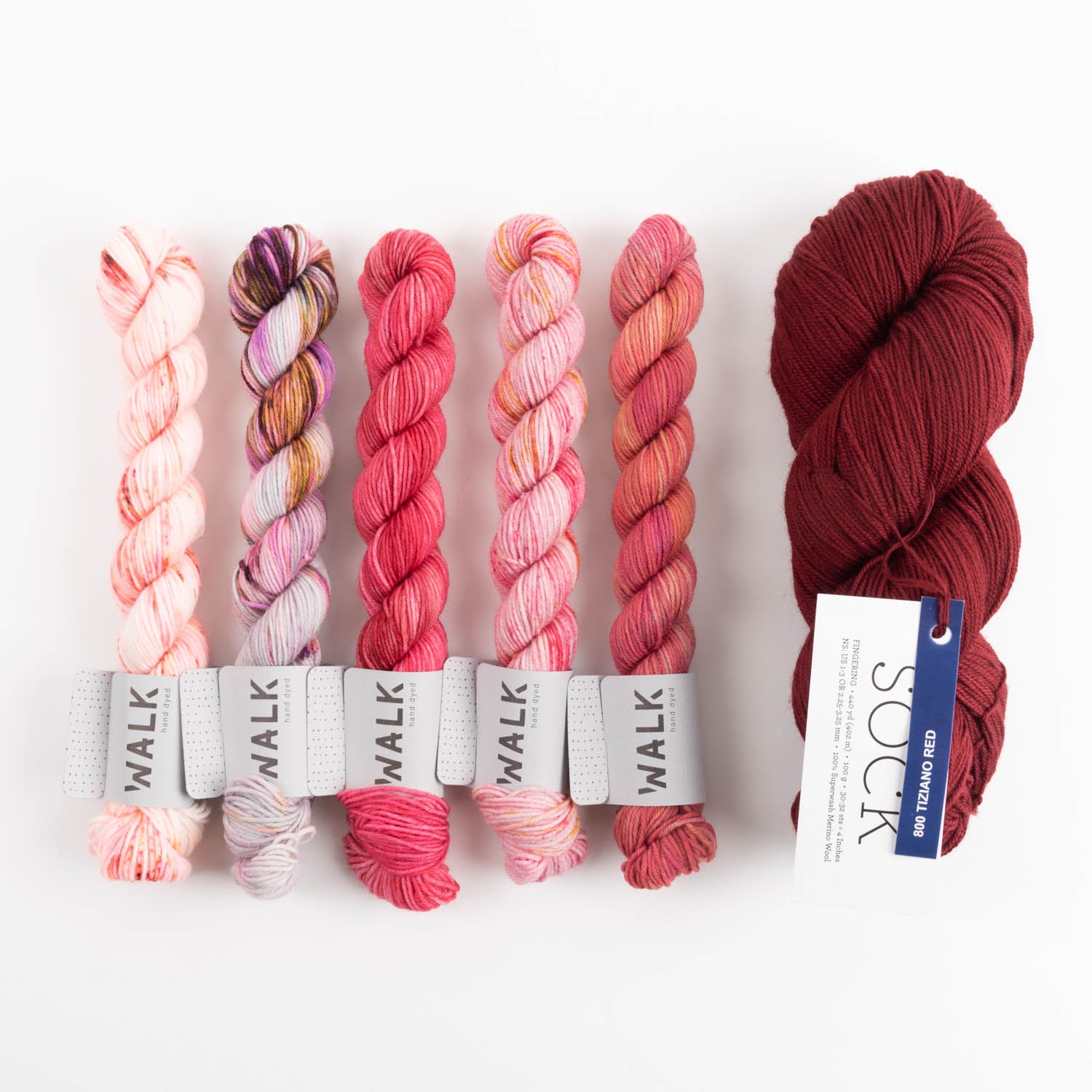 Dive into the world of sock knitting with these fun sock sets! These kits contain enough yarn to knit a pair of socks like the Painting Bricks Socks or any other colourfully striped sock patterns. Use the colour palettes just as they are or supplement them with sock yarns from your stash for extra splashy socks!
