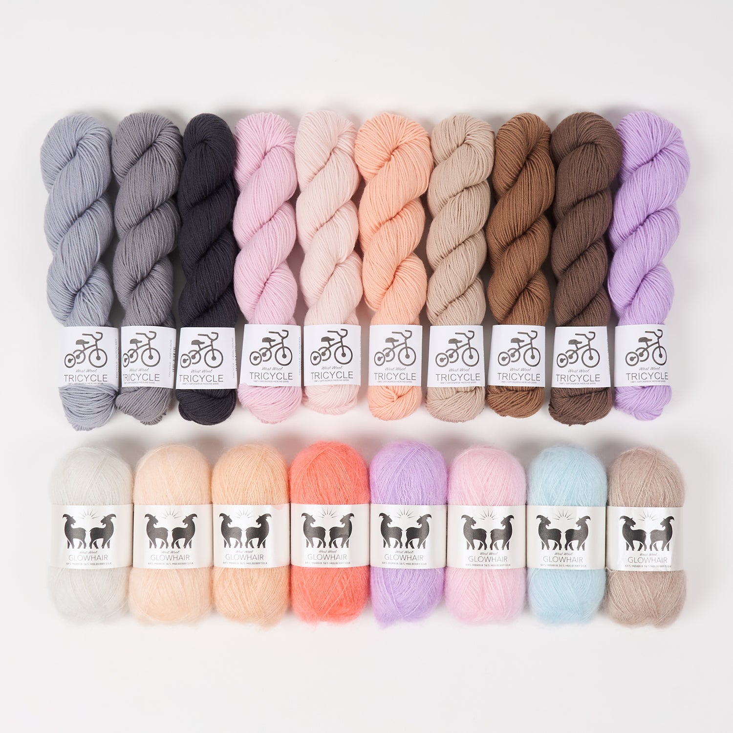 This gorgeously colourfulWest Wool kit features ten skeins of fingering weight Tricycle and eight balls of fluffy mohair lace Glowhair. If you need inspiration, this kit works wonderfully for theBrioripple Wrapfrom Westknits.