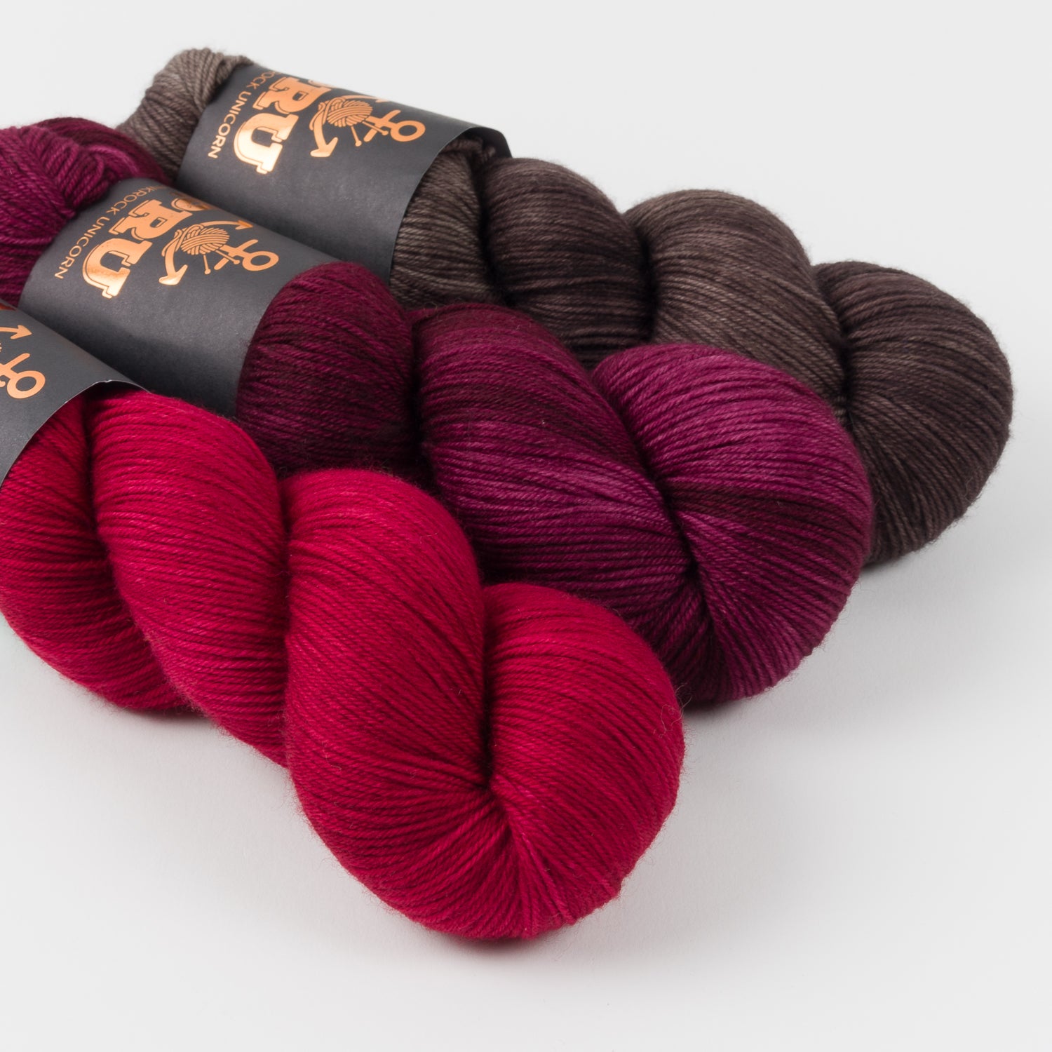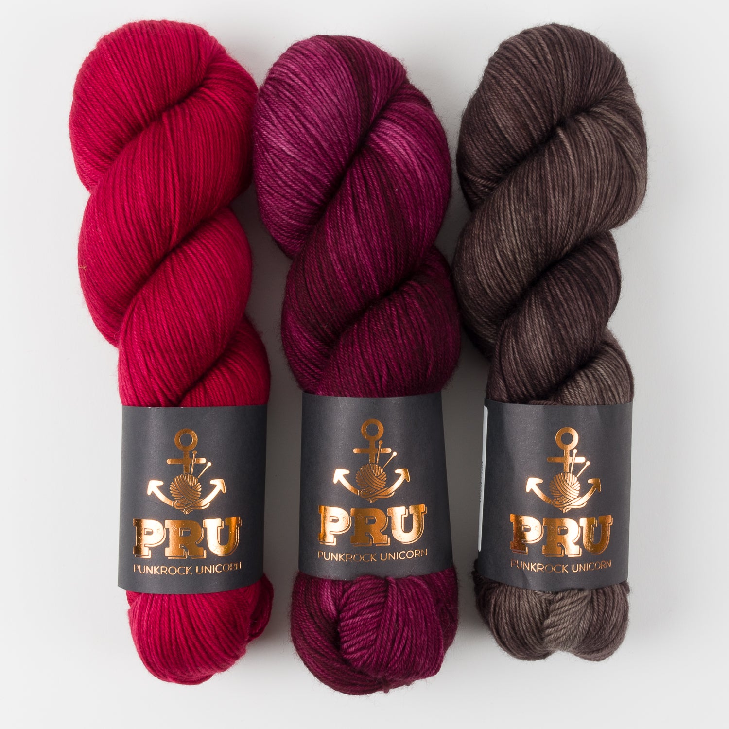 This gorgeous kit from Punk Rock Unicorn contains three skeins of fingering weight yarn. If you need inspiration, it can be used to knit any of these Westknits shawls