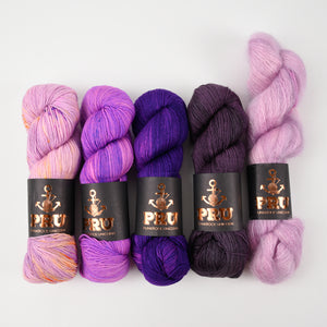 This gorgeous kit contains four hand picked skeins of fingering weight yarn and a fluffy mohair pop from Punk Rock Unicorn that you can use in any order you want. If you need inspiration, this yarn can be used to knit any of these Westknits Shawls.