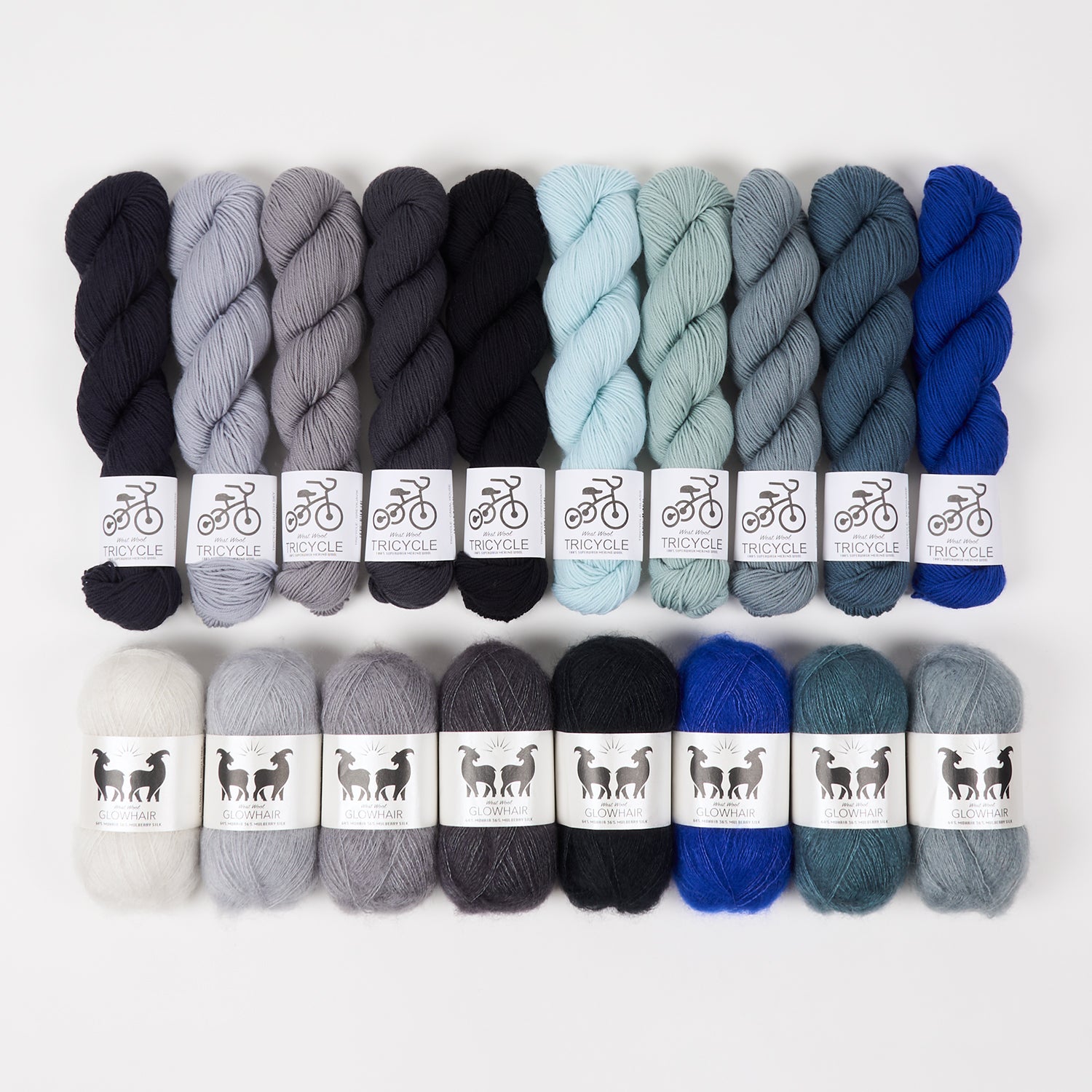 This gorgeously colourfulWest Wool kit features ten skeins of fingering weight Tricycle and eight balls of fluffy mohair lace Glowhair. If you need inspiration, this kit works wonderfully for theBrioripple Wrapfrom Westknits.