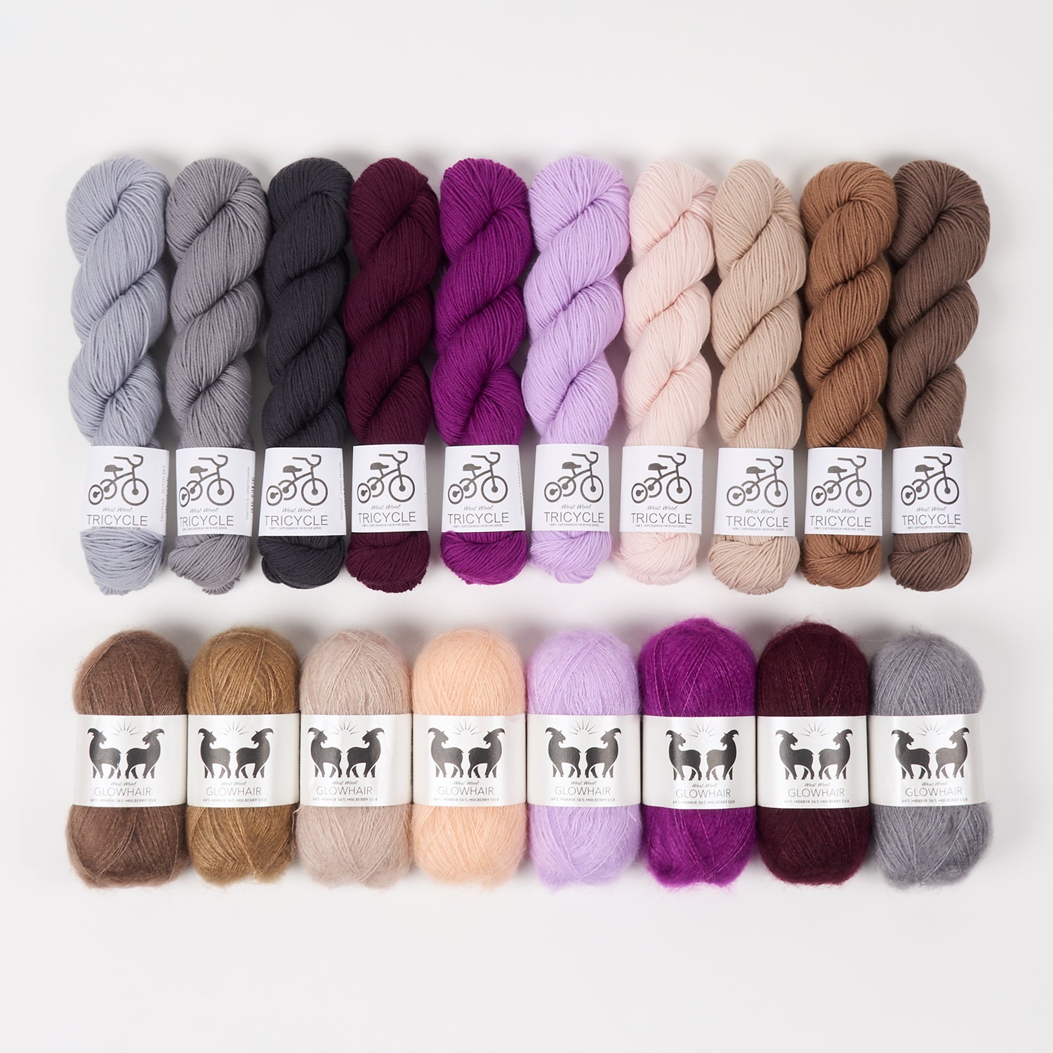 This gorgeously colourfulWest Wool kit features ten skeins of fingering weight Tricycle and eight balls of fluffy mohair lace Glowhair. If you need inspiration, this kit works wonderfully for theBrioripple Wrapfrom Westknits.